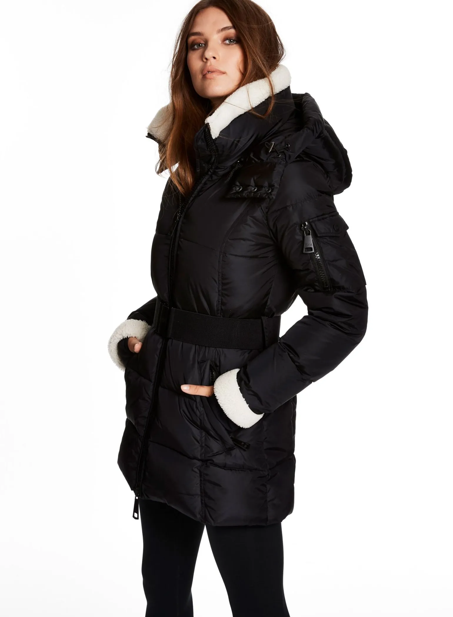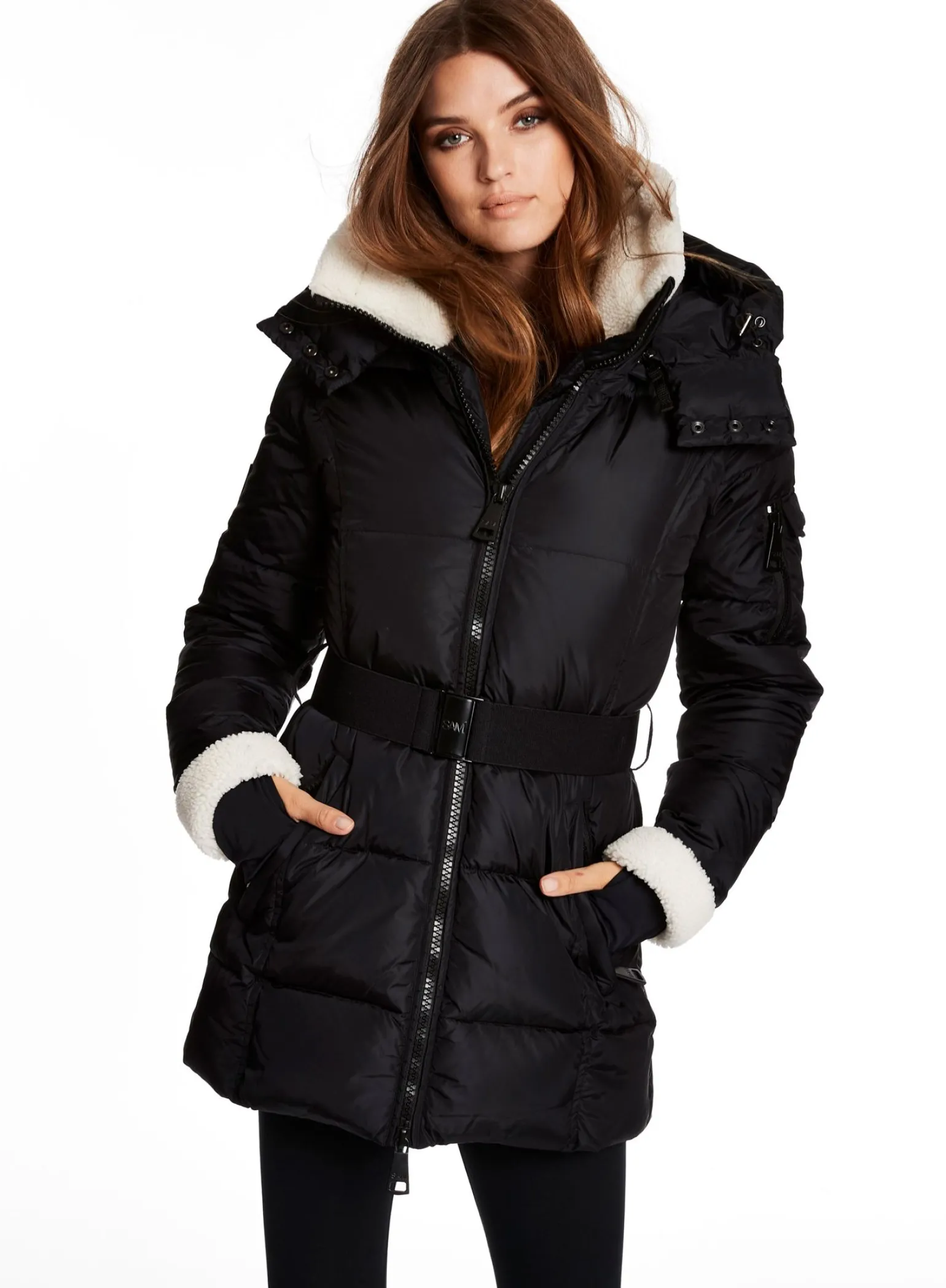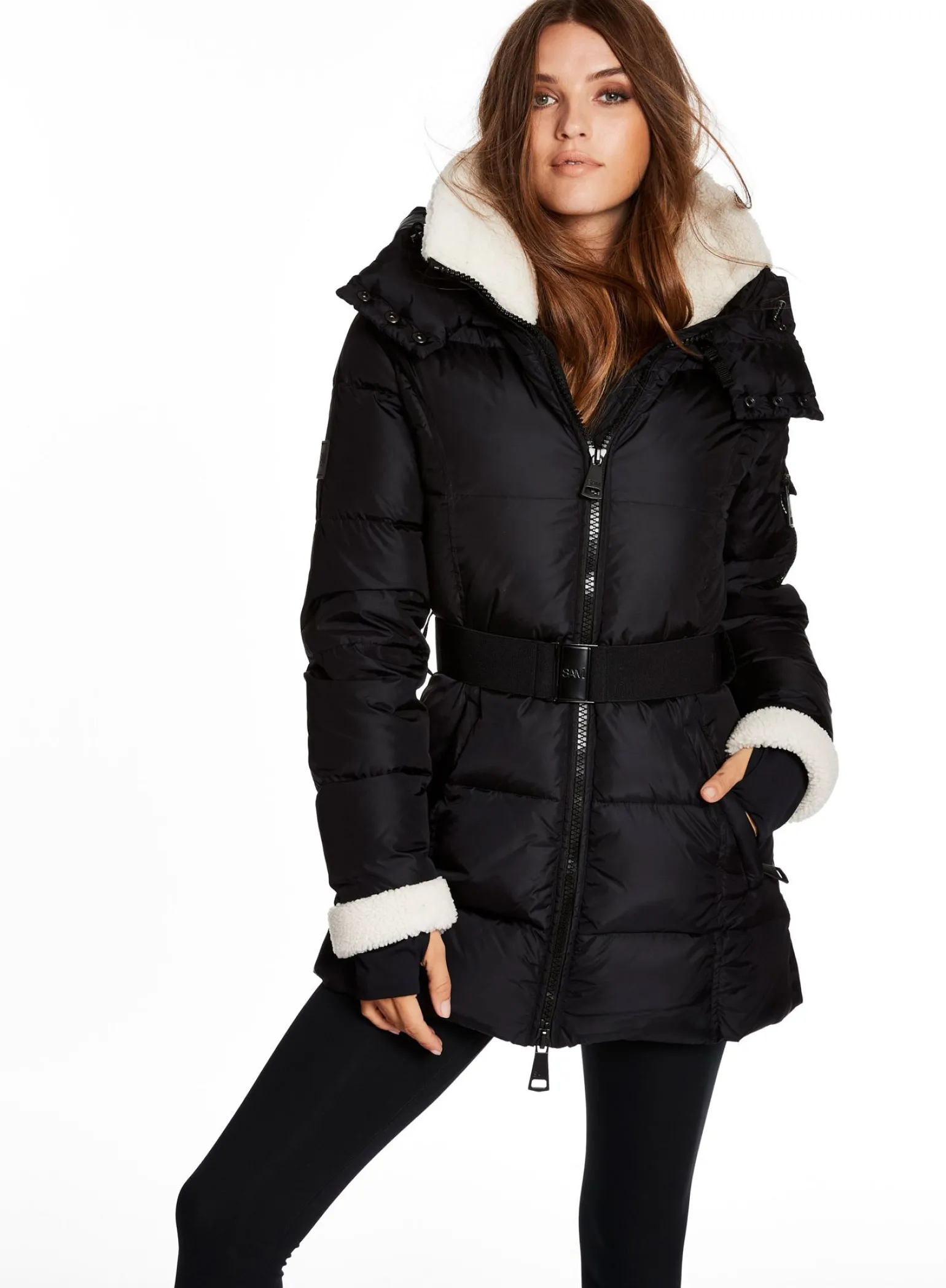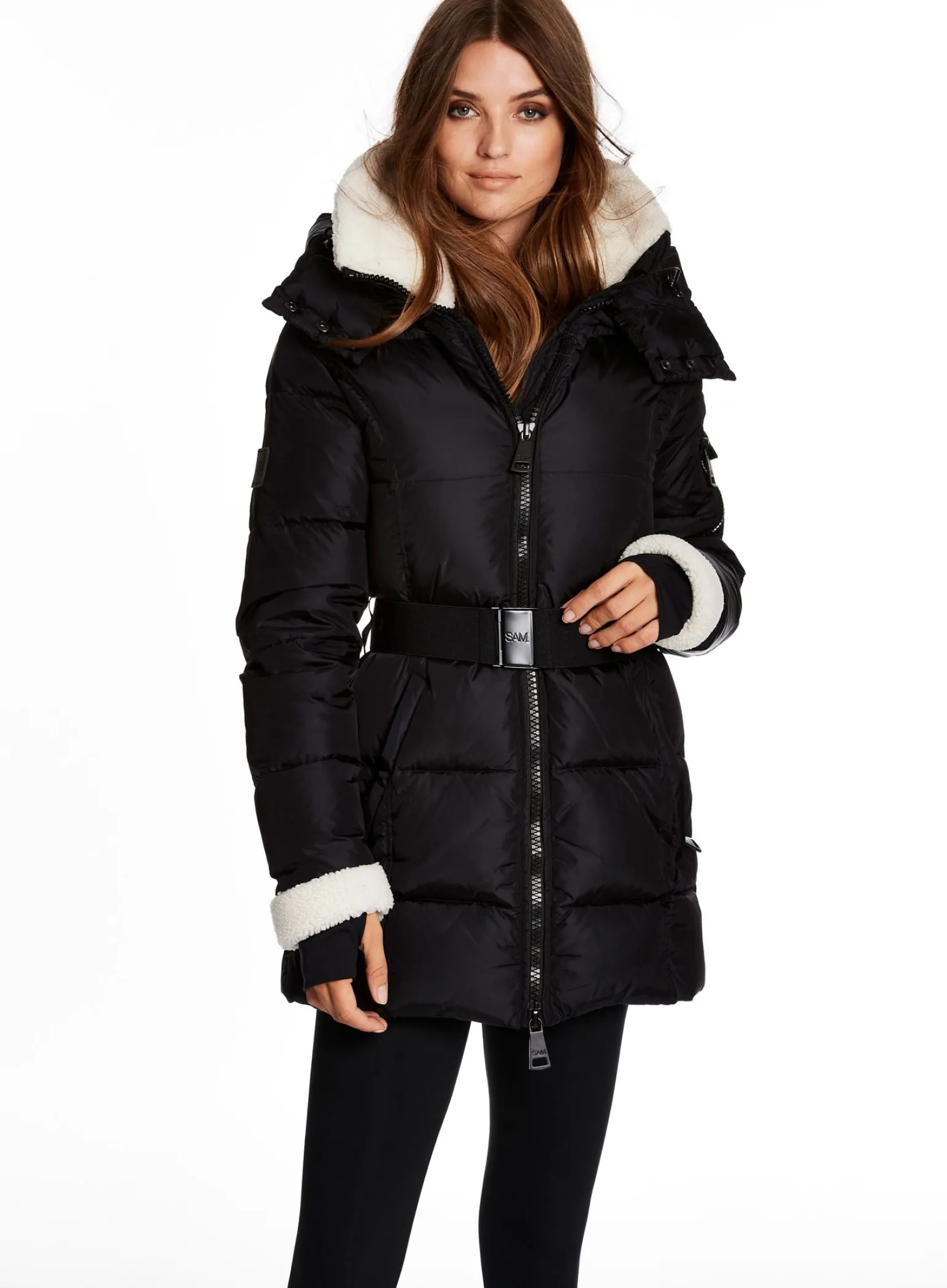 This Mid-Length, Shaped, Down Coat Is Crafted From A Densely Woven Matte Nylon Yarn, And Filled With Down To Achieve Warmth And An Ultra Soft Feel. It Is Lightweight, Wind Resistant, And Water Repellent. The Courtney Features Shearling Trimmed Spandex Wrist Cuffs With Thumbholes, A Shearling Collar, A Detachable Zip-Off Hood, A Detachable Belt With Sam Logo Embossed Metal Buckle, 2 Lower Zip Pockets, And Sleeve Pocket Detail.