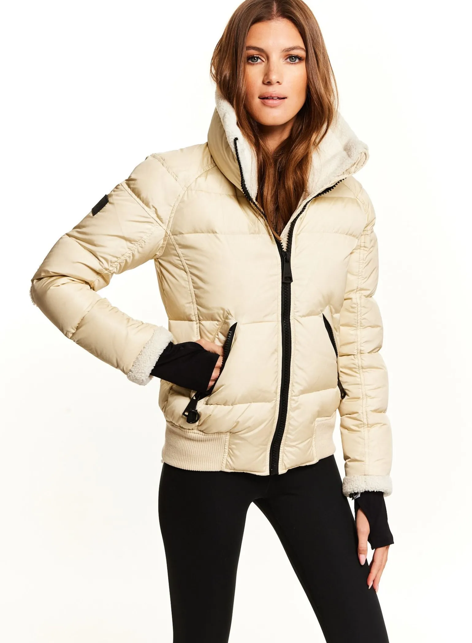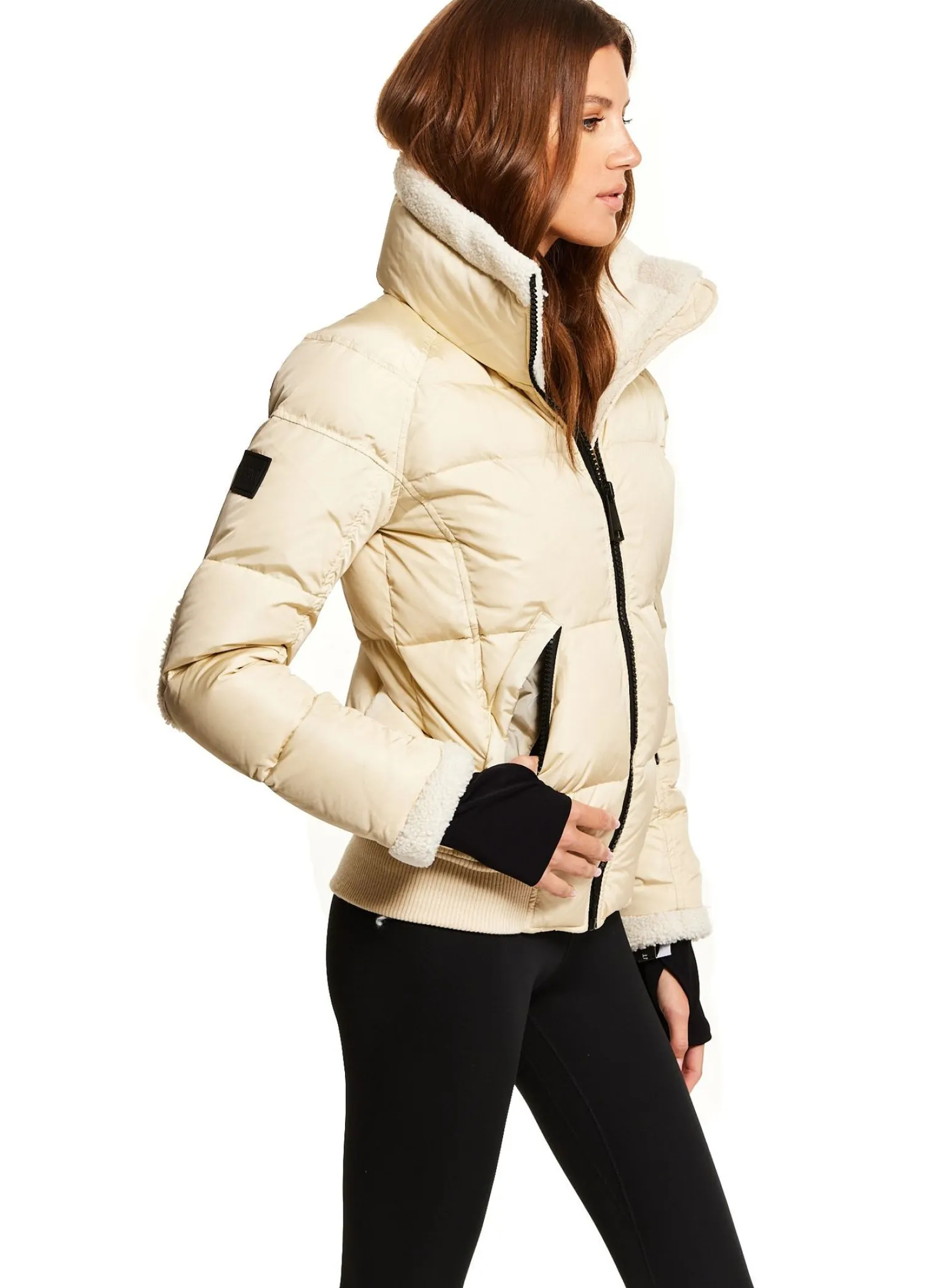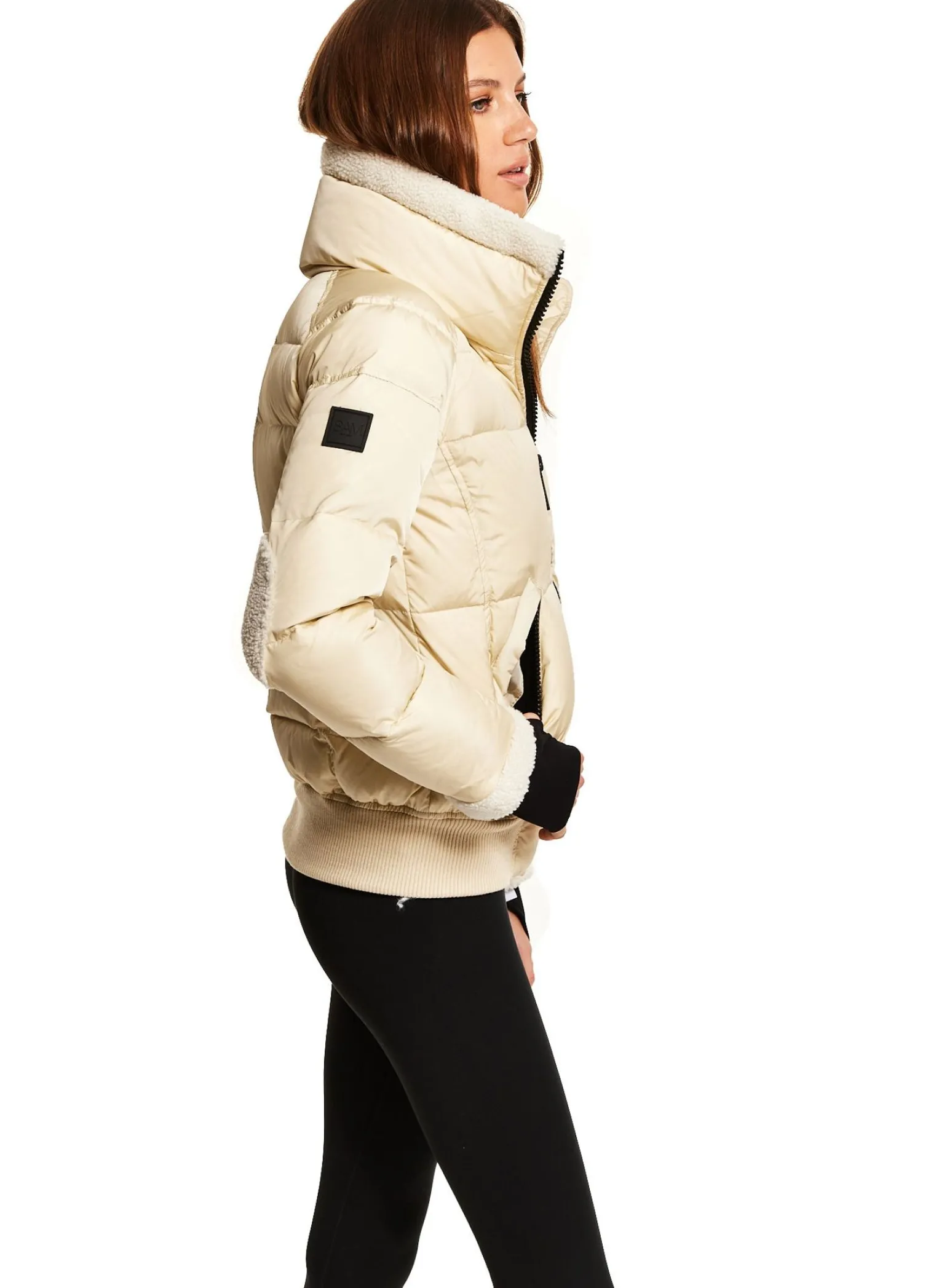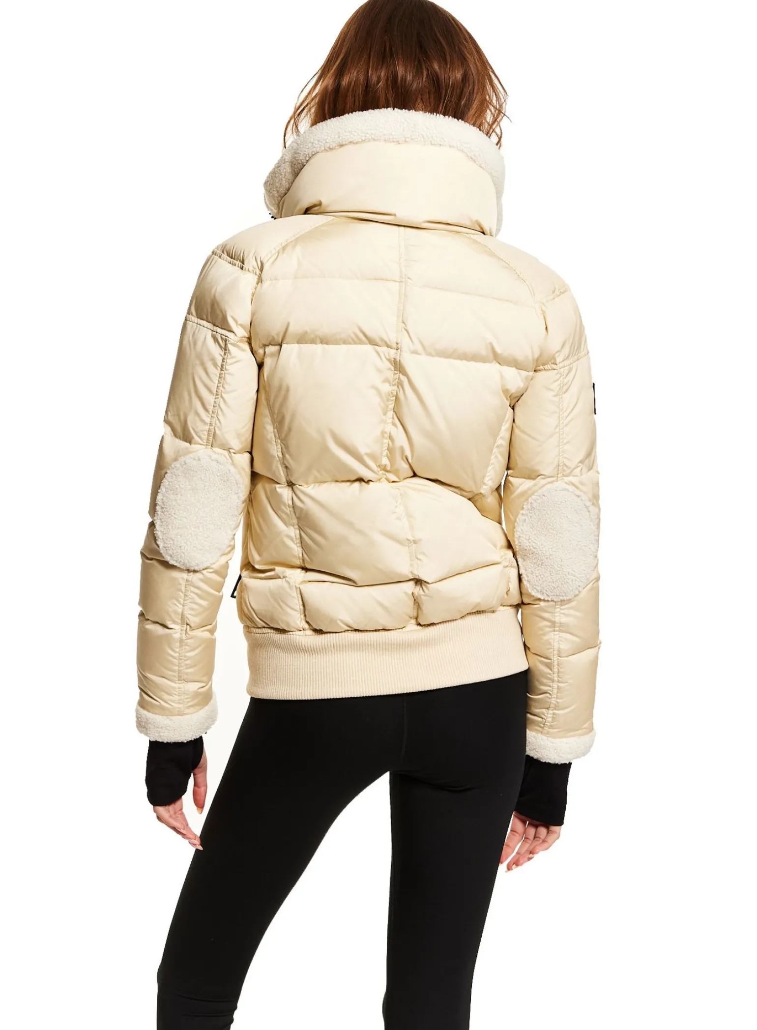 This Quilted, Bomber Style Jacket Is Crafted From A Densely Woven Nylon, And Filled With Down To Achieve Warmth And An Ultra Soft Feel. The Ellie Is Wind Resistant, Water Repellent, And Features A Stand Shearling Collar, Shearling Elbow Patches, Center Front Zip Closure, Spandex Thumbhole Cuffs, 2 Lower Zip Pockets, Snap Sleeve And Pocket Detail, And A Knit Waistband.