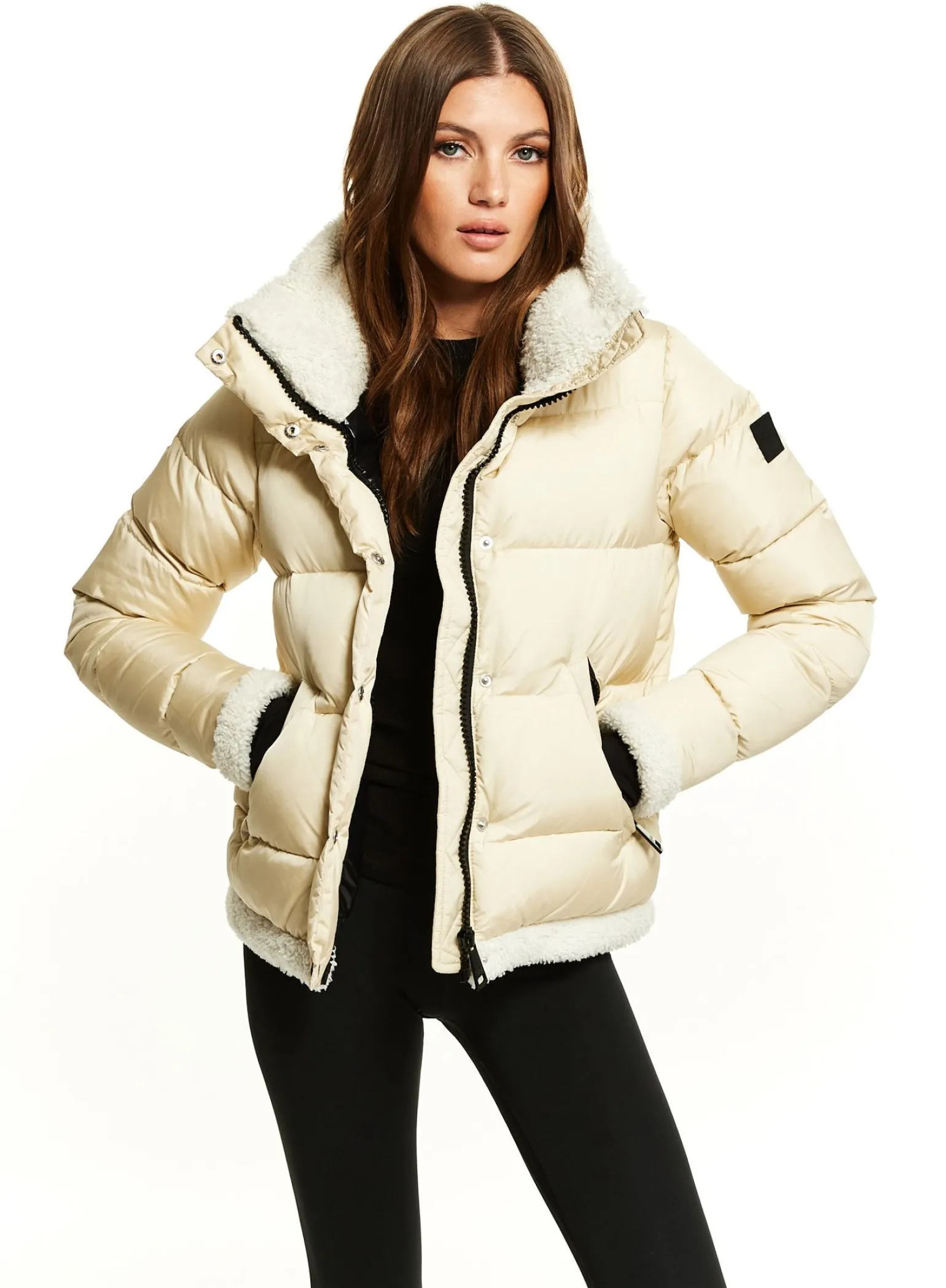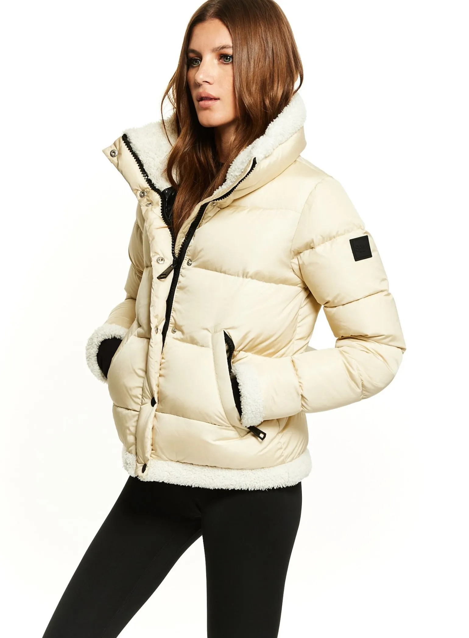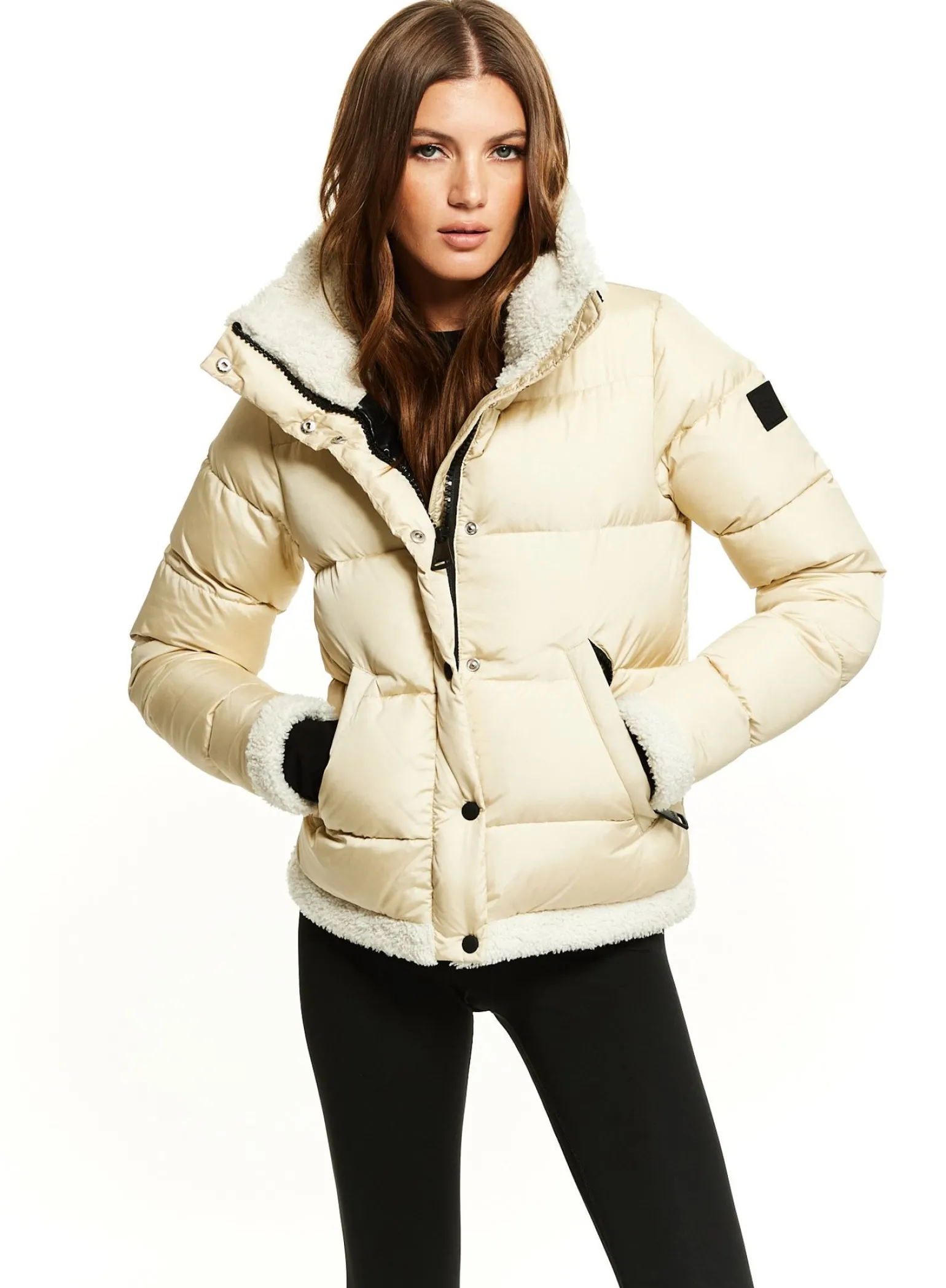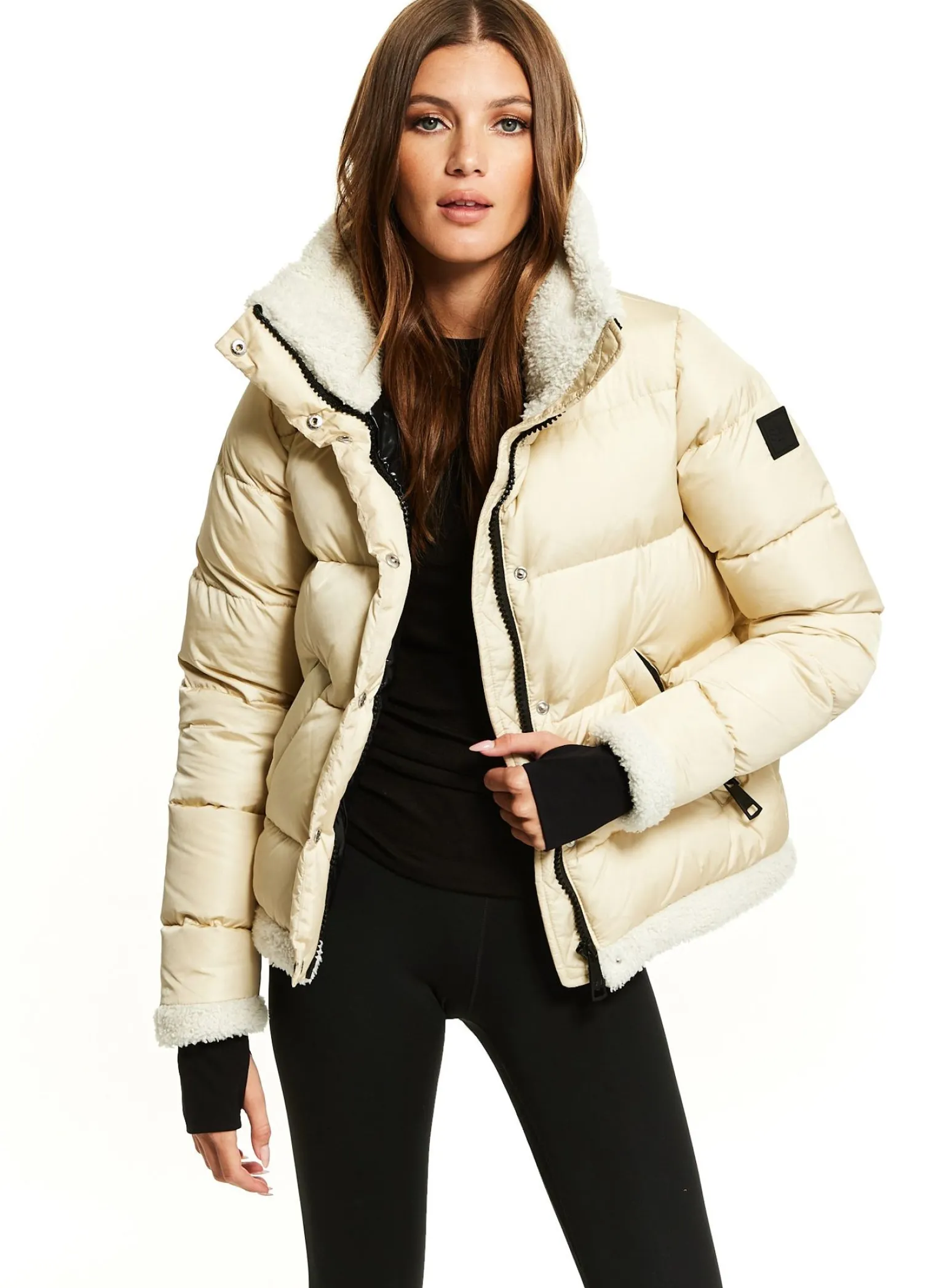 This Quilted, Down Puffer Jacket Is Crafted From A Densely Woven Nylon, And Filled With Down To Achieve Warmth And An Ultra Soft Feel. The Gigi Is Wind Resistant, Water Repellent, And Features A Shearling Stand Collar, Shearling Trim On The Cuffs And Hem, Spandex Wrist Cuffs With Thumbholes, A Center Front Zip And Snap Placket Closure, And Lower Zip Pockets.