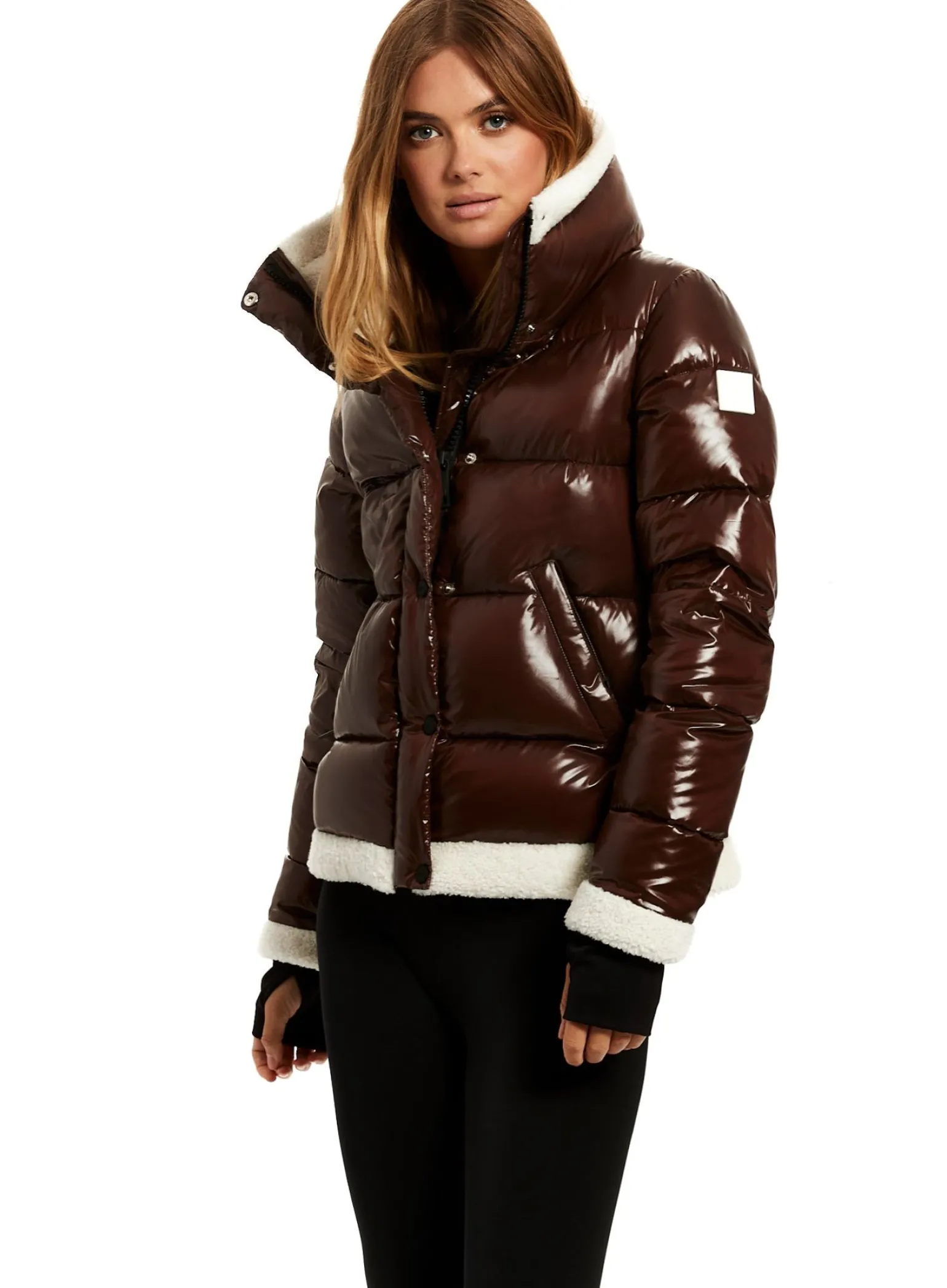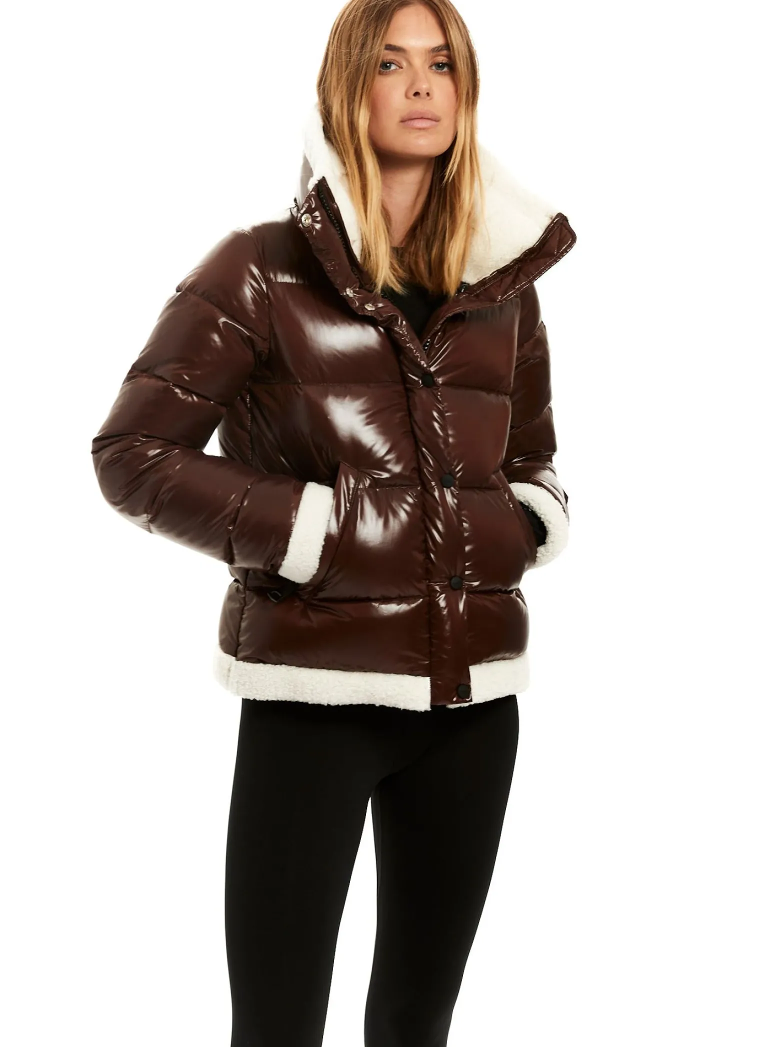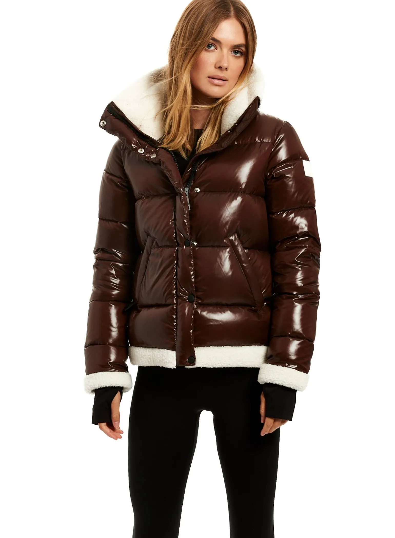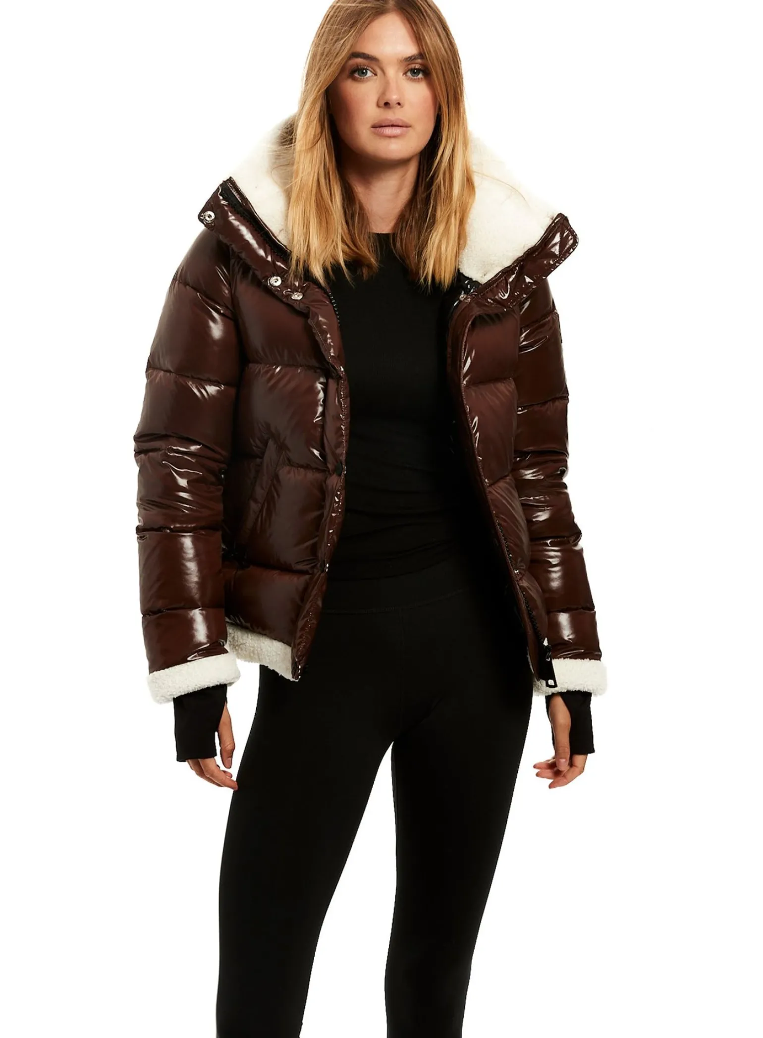 This Quilted, Down Puffer Jacket Is Crafted From A Densely Woven Nylon, And Filled With Down To Achieve Warmth And An Ultra Soft Feel. The Gigi Is Wind Resistant, Water Repellent, And Features A Shearling Stand Collar, Shearling Trim On The Cuffs And Hem, White Logo Patch On The Arm, Spandex Wrist Cuffs With Thumbholes, A Center Front Zip And Snap Placket Closure, And Lower Zip Pockets.