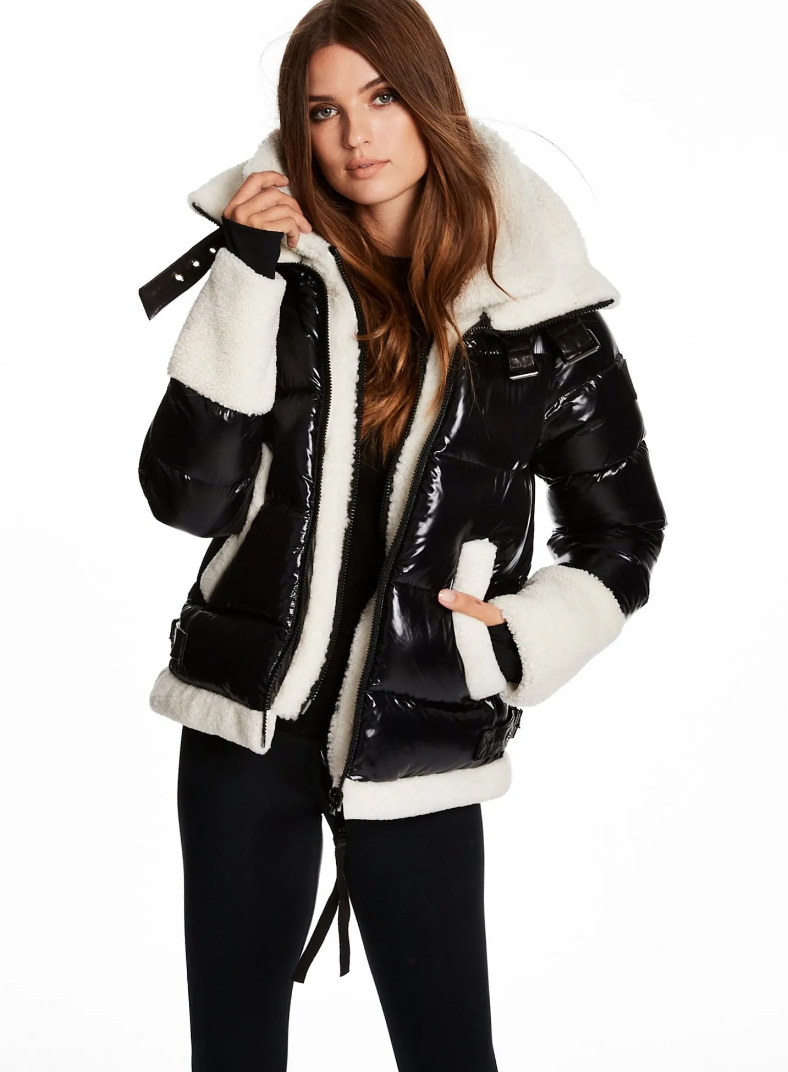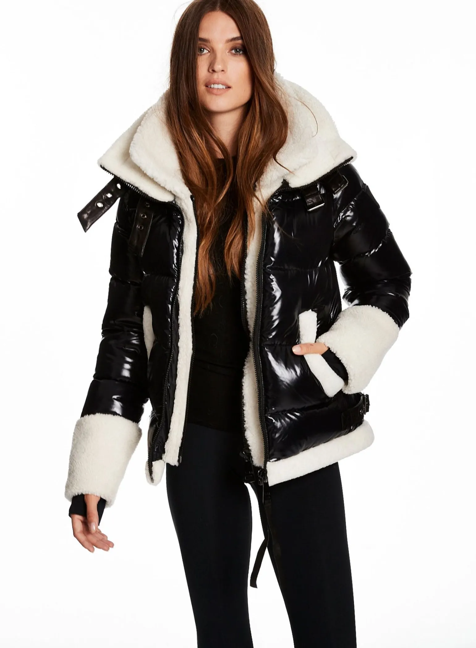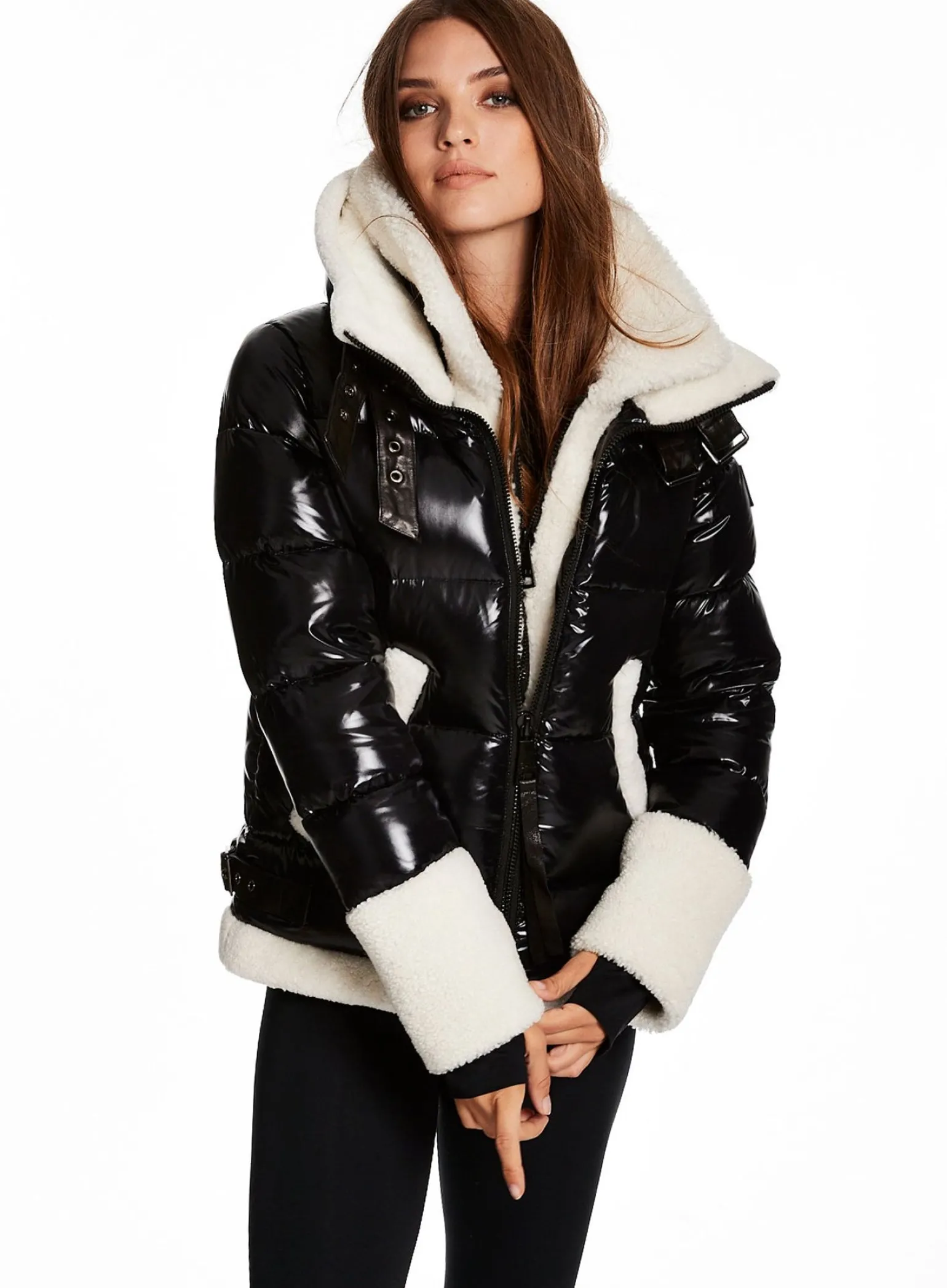 This Puffer Jacket Is Crafted From A Densely Woven Nylon Yarn, And Filled With Duck Down To Achieve Warmth And An Ultra Soft Feel. It Is Lightweight, Wind Resistant, And Water-Repellent. The Heidi Features A Shearling Stand Collar And Attached Shearling Bib, Shearling Trim On The Cuffs And Hem, Spandex Wrist Cuffs With Thumbholes, Center Front Zip, And Lower Zip Pockets.