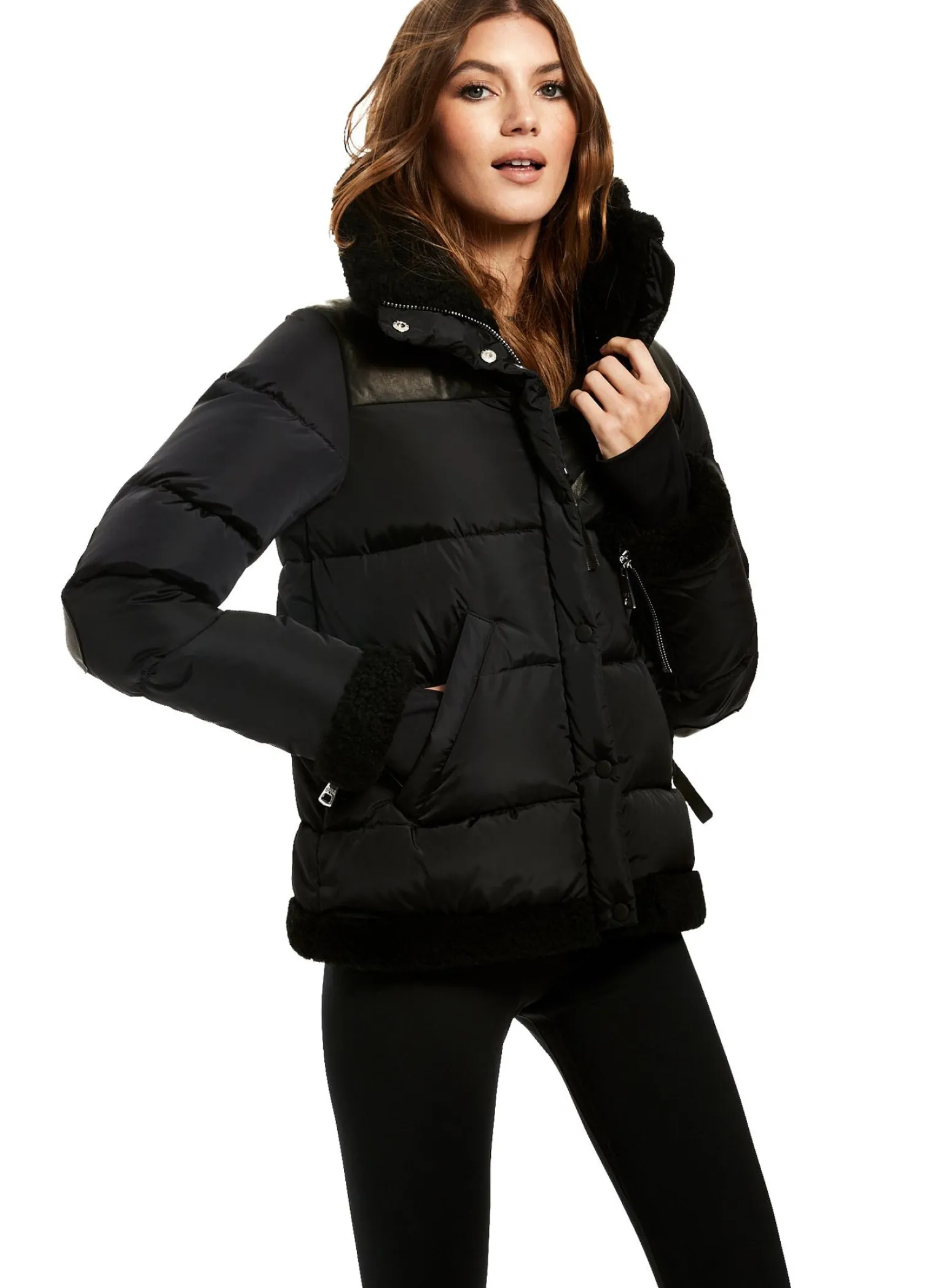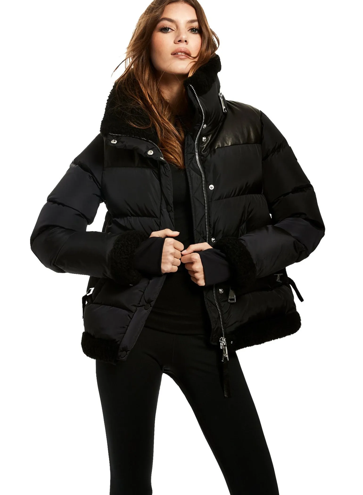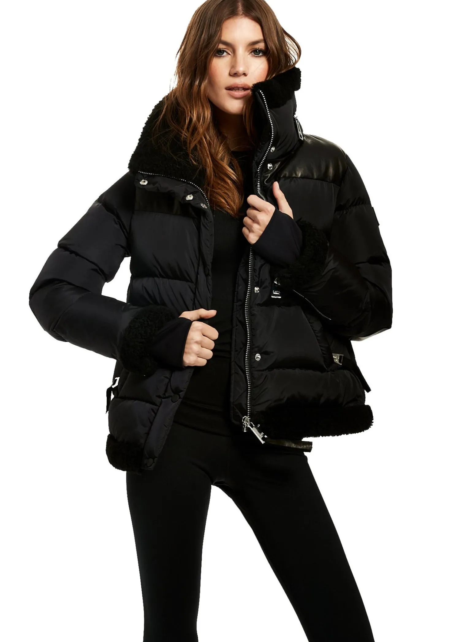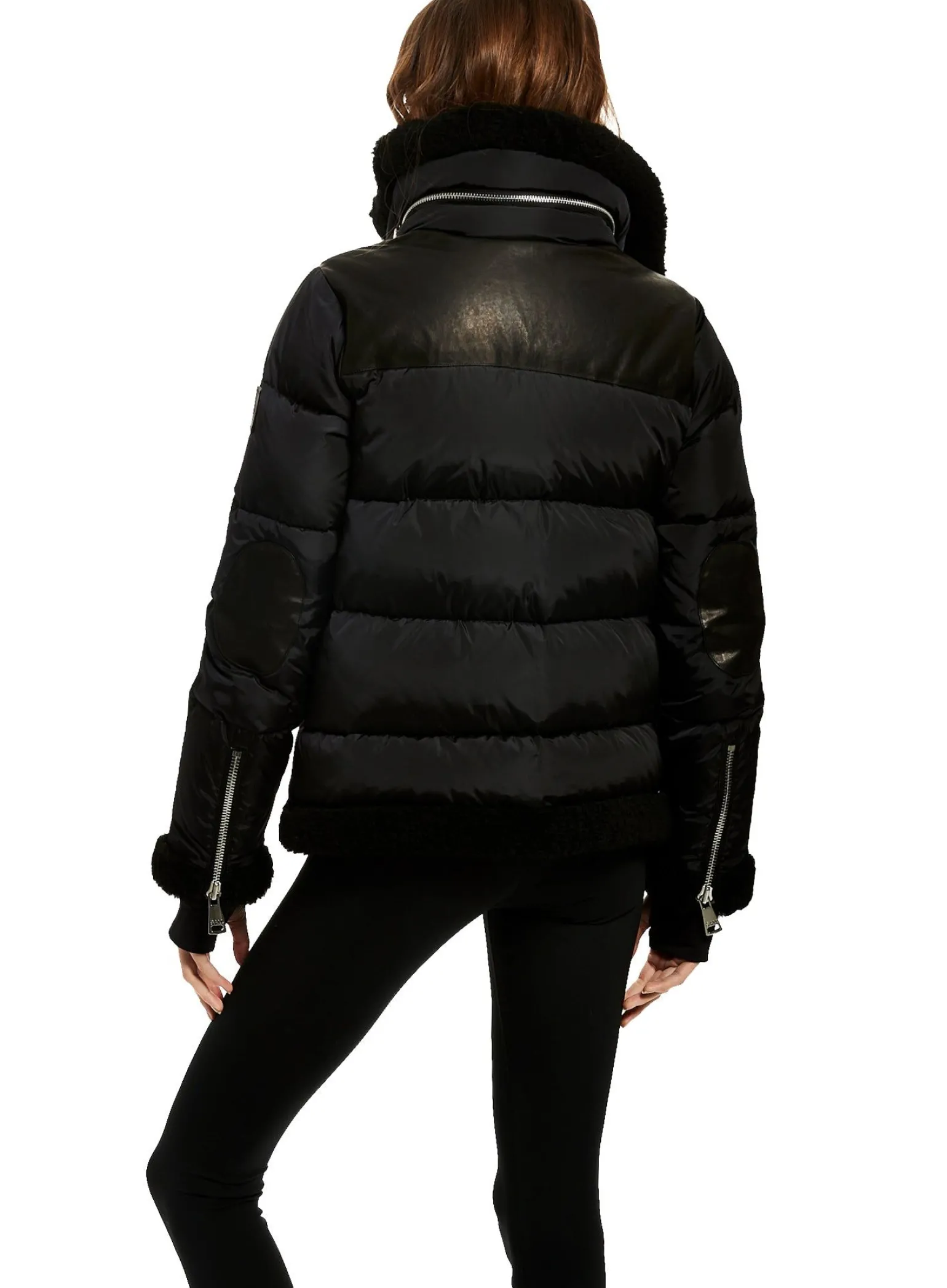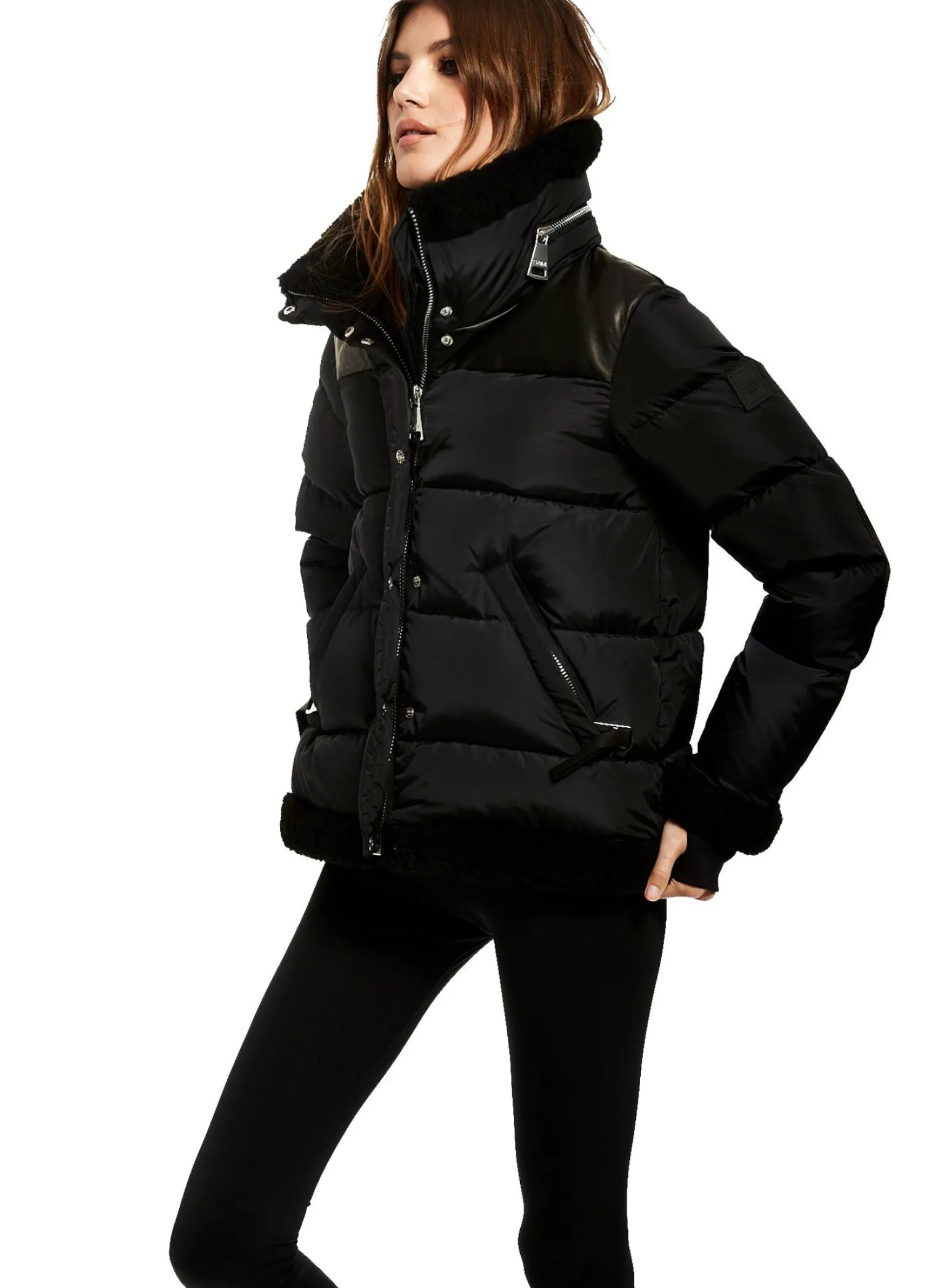 This Quilted Puffer Jacket Is Crafted From A Densely Woven Matte Nylon, And Filled With Down To Achieve Warmth And An Ultra Soft Feel. The Sari Is Wind Resistant, Water Repellent, And Features A Shearling Stand Collar With A Zip That Conceals A Roll-Out Hood, Shearling Trim Waist And Cuffs, A Leather Yoke, Leather Elbow Patches, Zips At The Cuffs, And Spandex Wrist Cuffs With Thumbholes, A Center Front Zip And Snap Placket Closure, And Lower Zip Pockets.