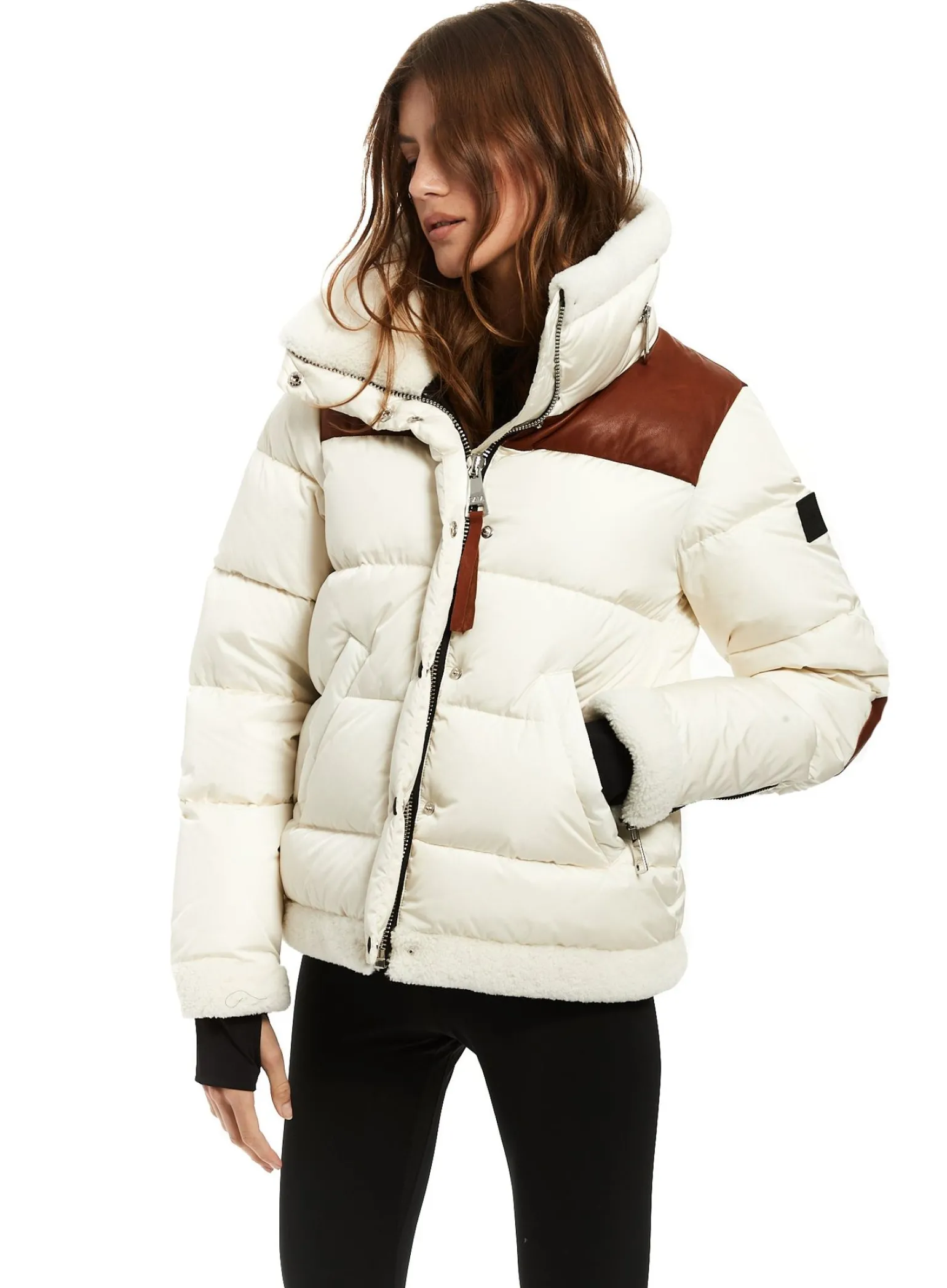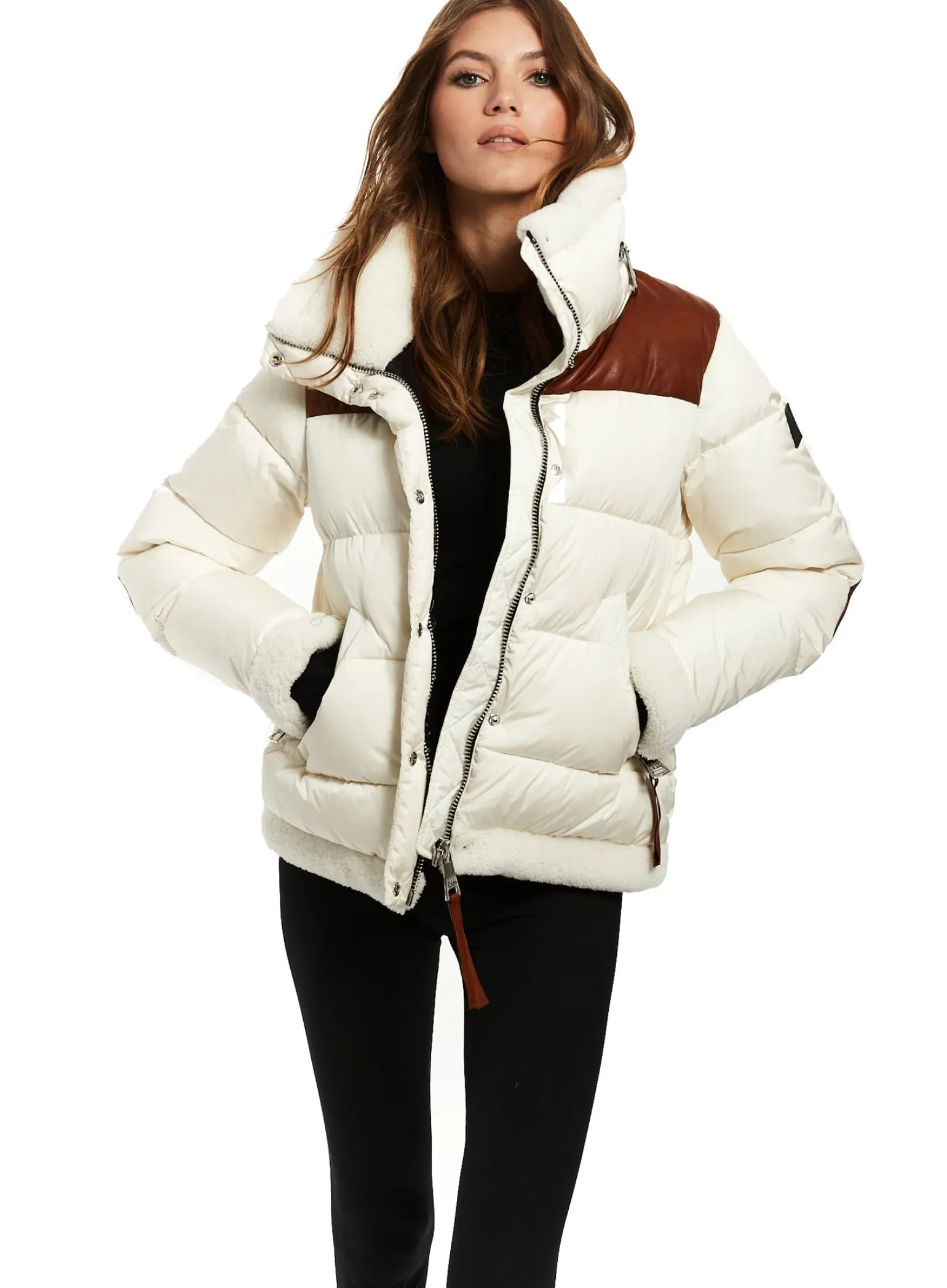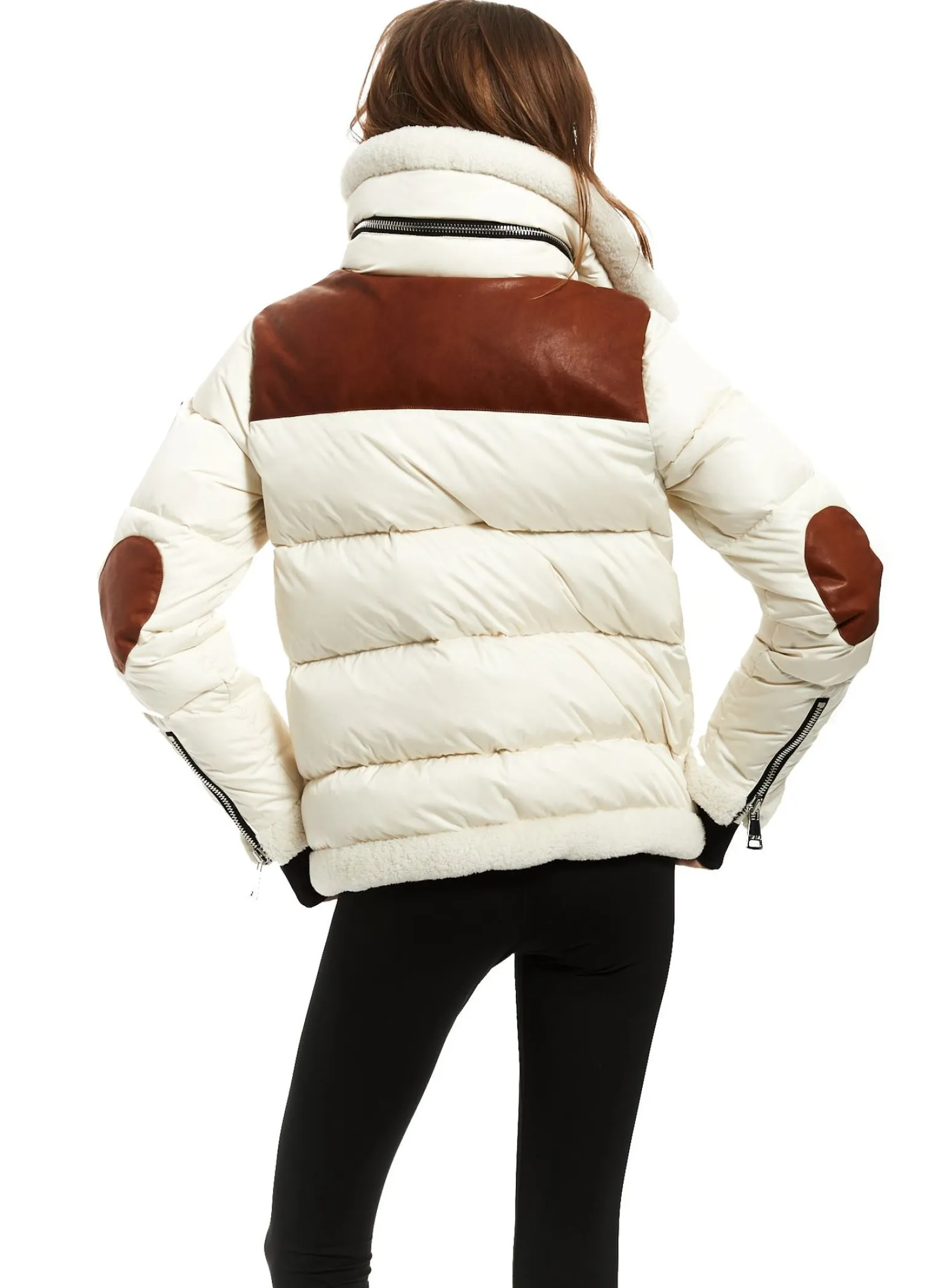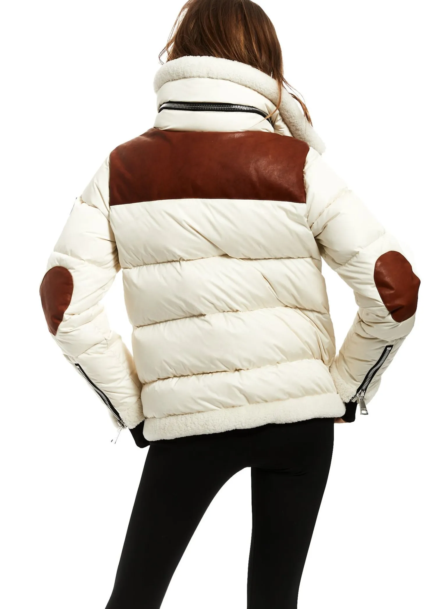 This Quilted Puffer Jacket Is Crafted From A Densely Woven Matte Nylon, And Filled With Down To Achieve Warmth And An Ultra Soft Feel. The Sari Is Wind Resistant, Water Repellent, And Features A Shearling Stand Collar With A Zip That Conceals A Roll-Out Hood, Shearling Trim Waist And Cuffs, A Leather Yoke, Leather Elbow Patches, Zips At The Cuffs, And Spandex Wrist Cuffs With Thumbholes, A Center Front Zip And Snap Placket Closure, And Lower Zip Pockets.