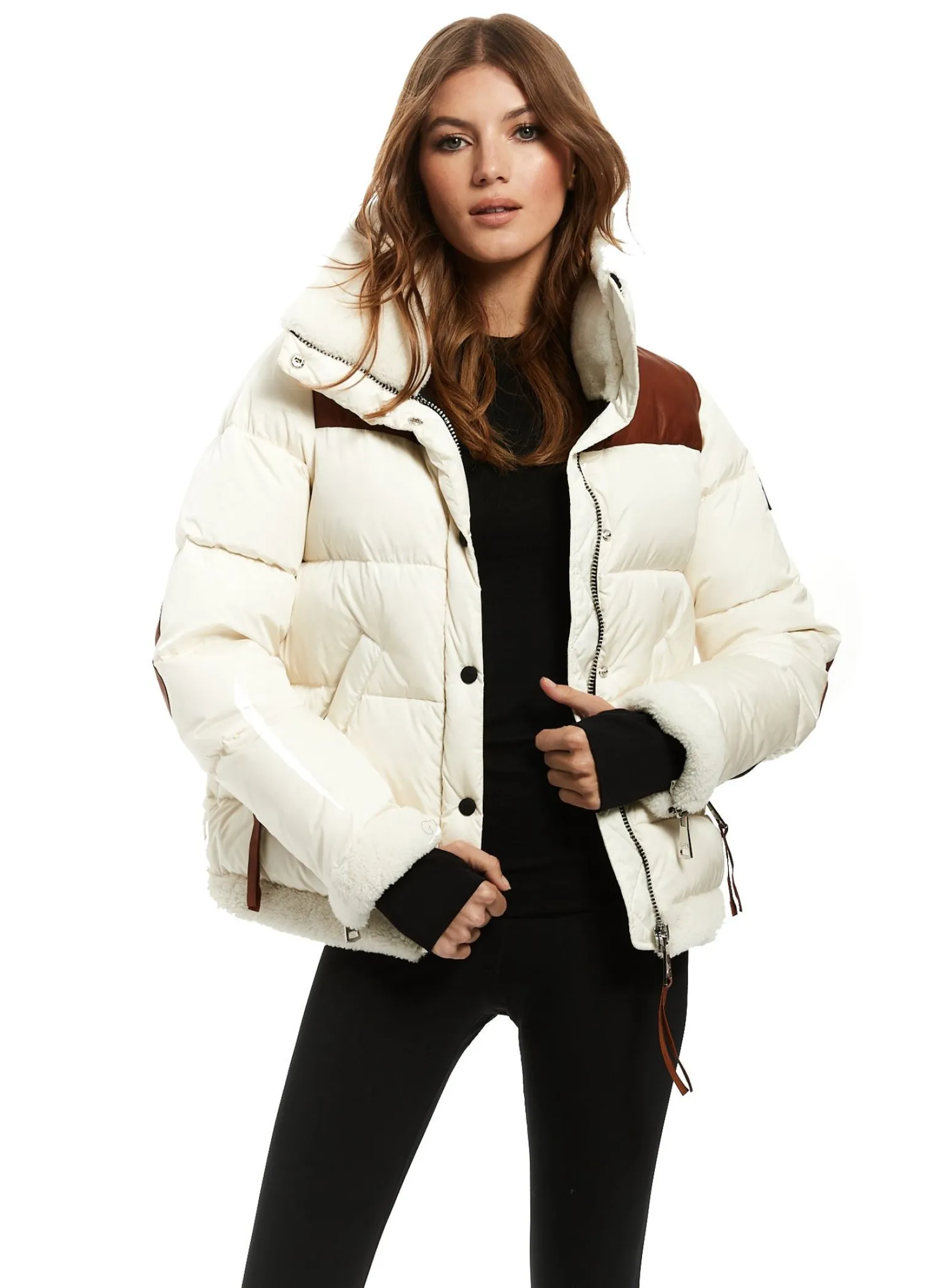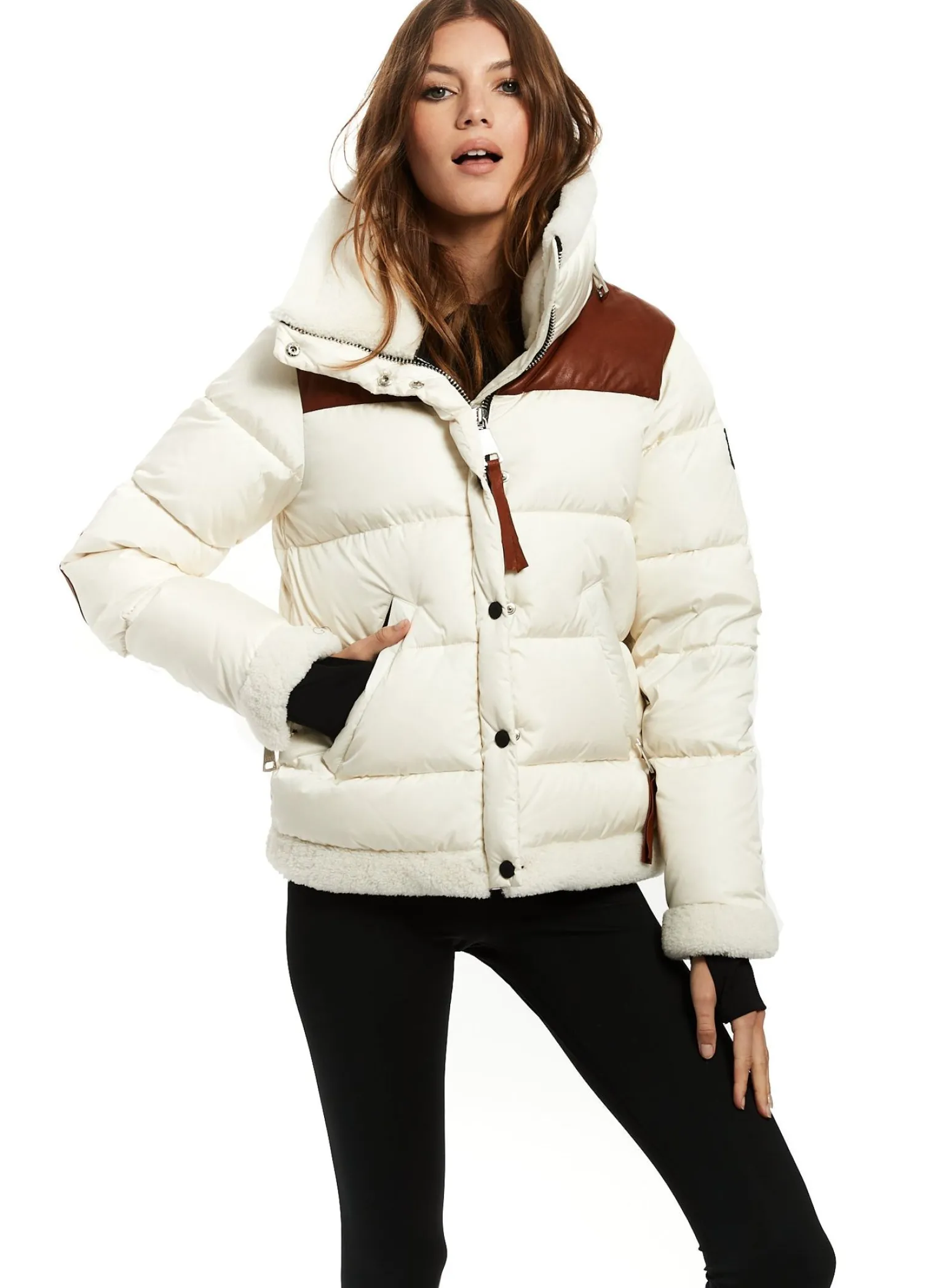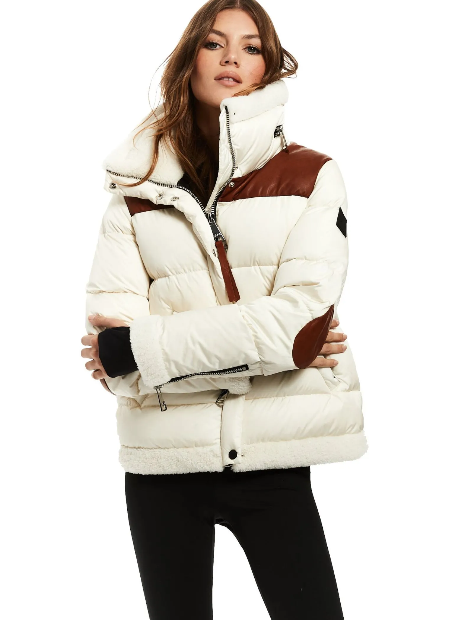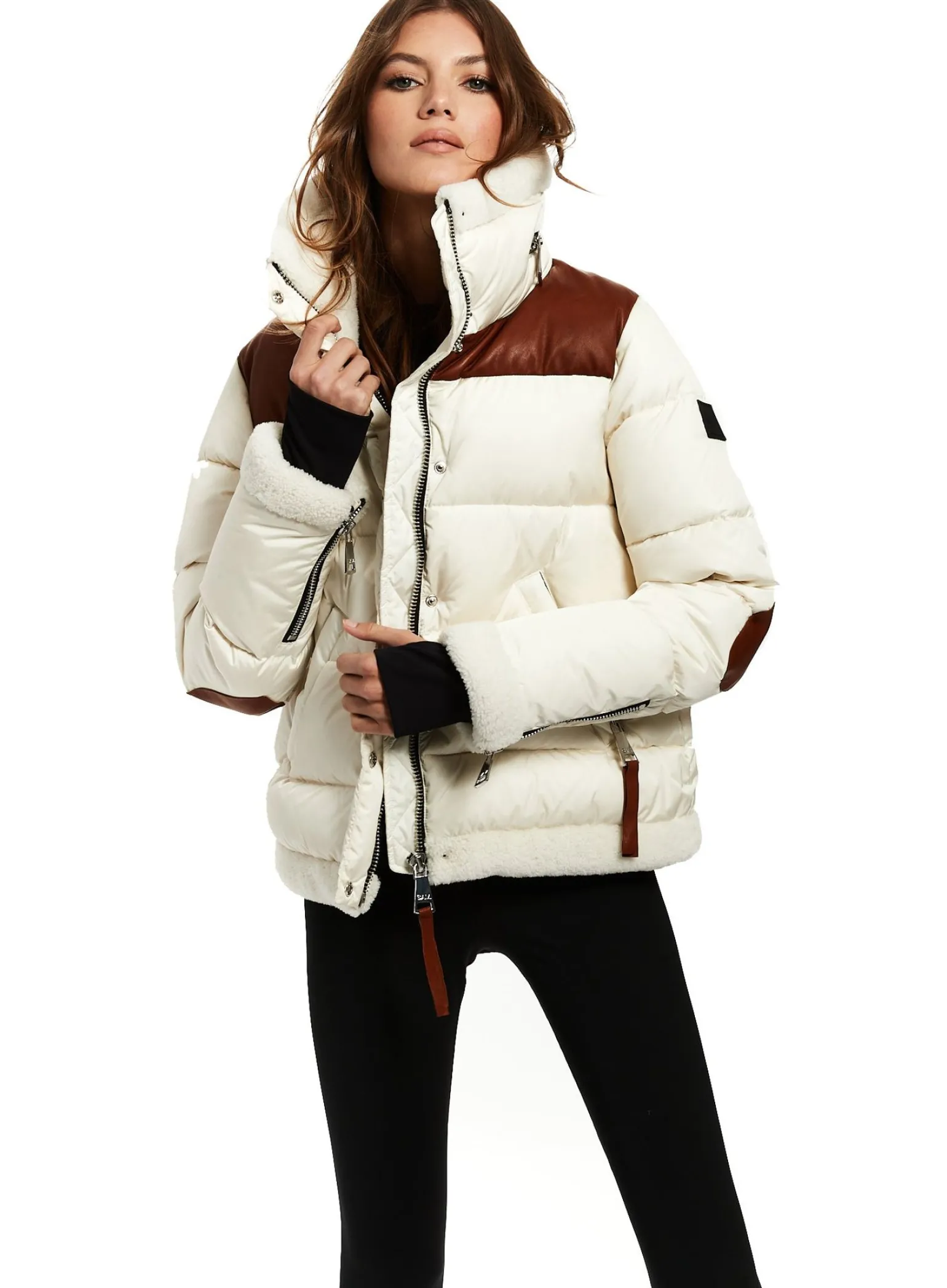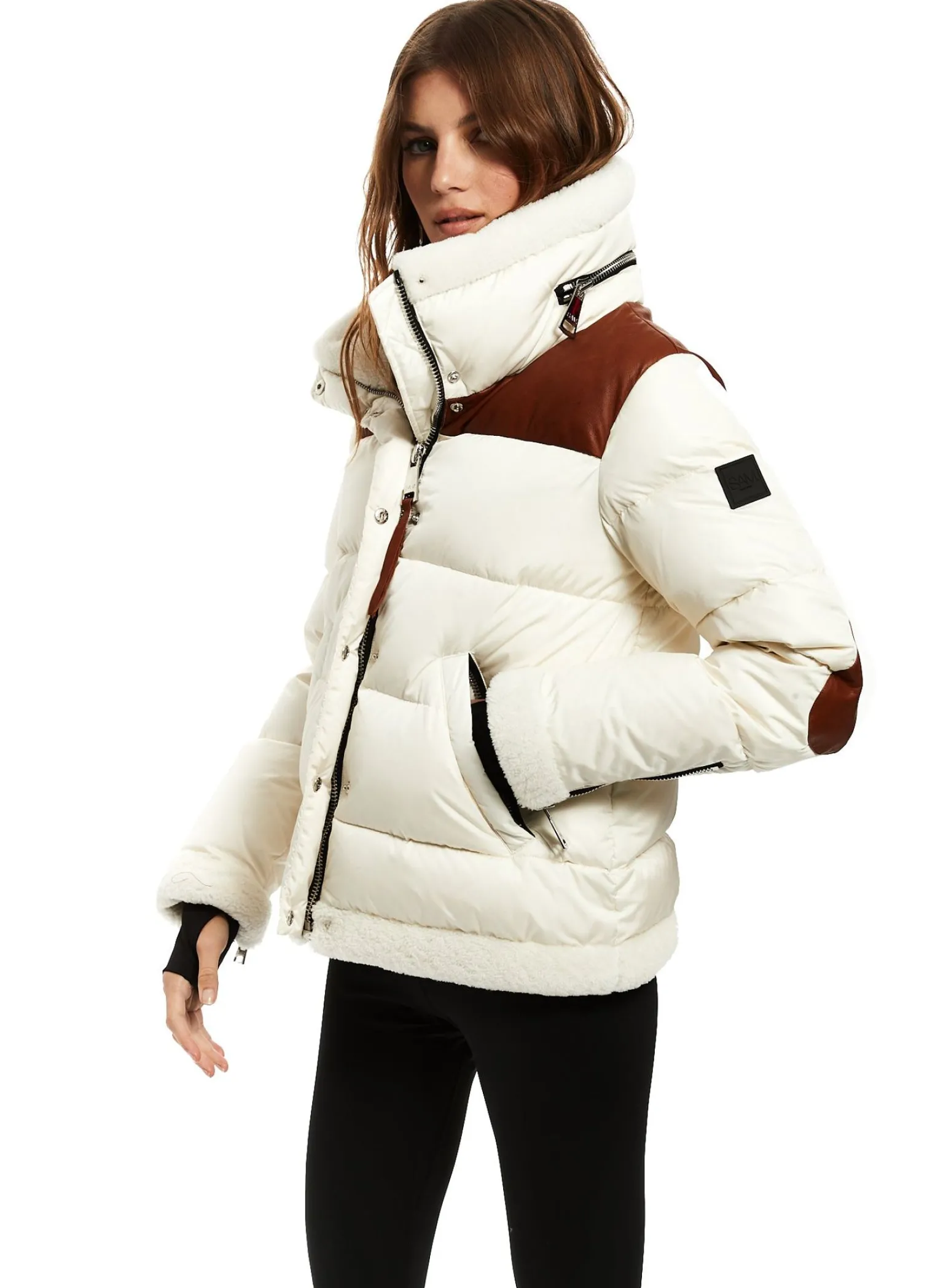 This Quilted Puffer Jacket Is Crafted From A Densely Woven Matte Nylon, And Filled With Down To Achieve Warmth And An Ultra Soft Feel. The Sari Is Wind Resistant, Water Repellent, And Features A Shearling Stand Collar With A Zip That Conceals A Roll-Out Hood, Shearling Trim Waist And Cuffs, A Leather Yoke, Leather Elbow Patches, Zips At The Cuffs, And Spandex Wrist Cuffs With Thumbholes, A Center Front Zip And Snap Placket Closure, And Lower Zip Pockets.