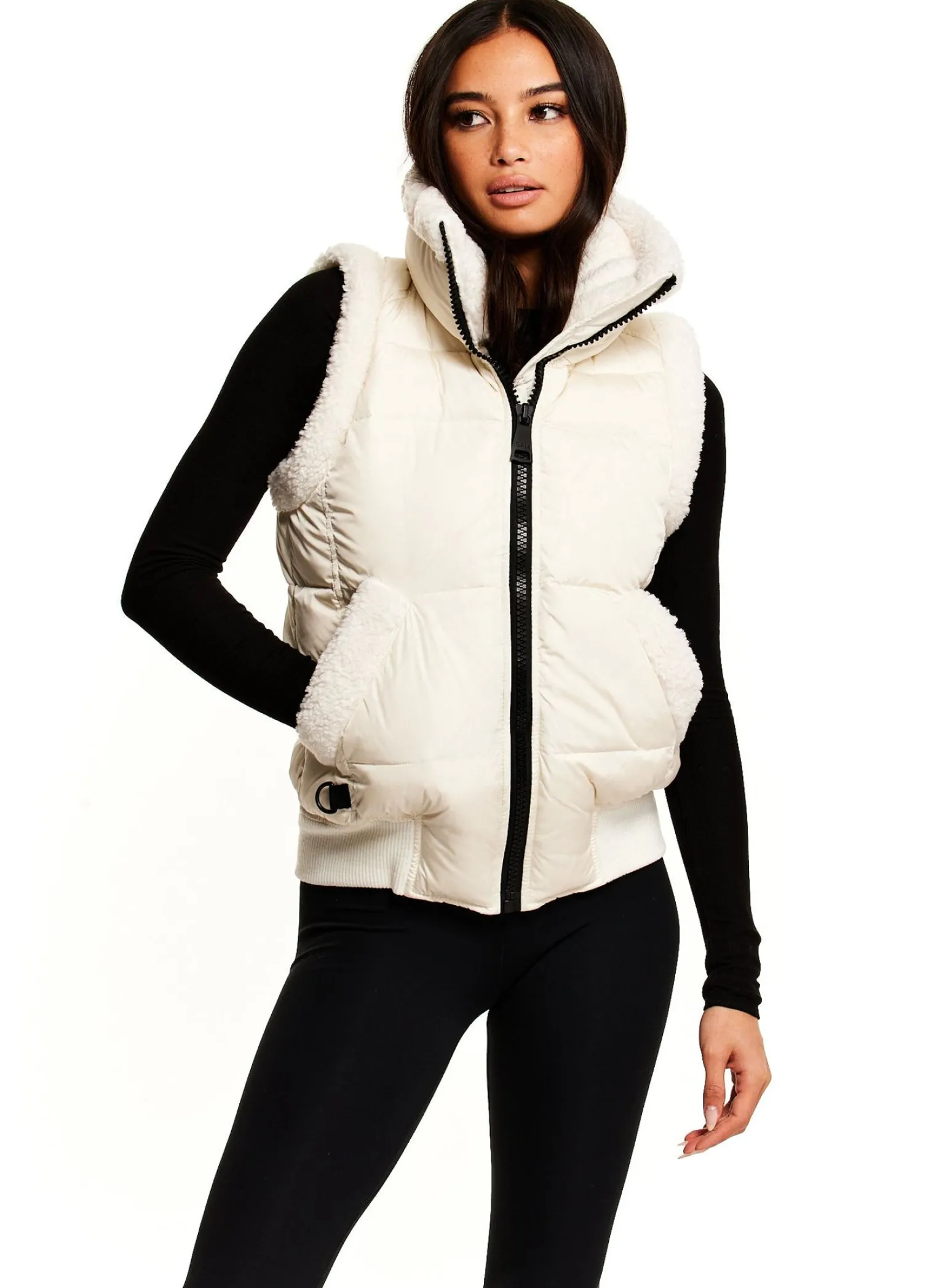 This Quilted Down Vest Is Crafted From A Densely Woven Matte Nylon, And Filled With Down To Achieve Warmth And An Ultra Soft Feel. The Billie Vest Is Wind Resistant, Water Repellent, And Features A Stand Faux Shearling Sherpa Collar And Trim, Center Front Zip Closure, And A Knit Waistband.