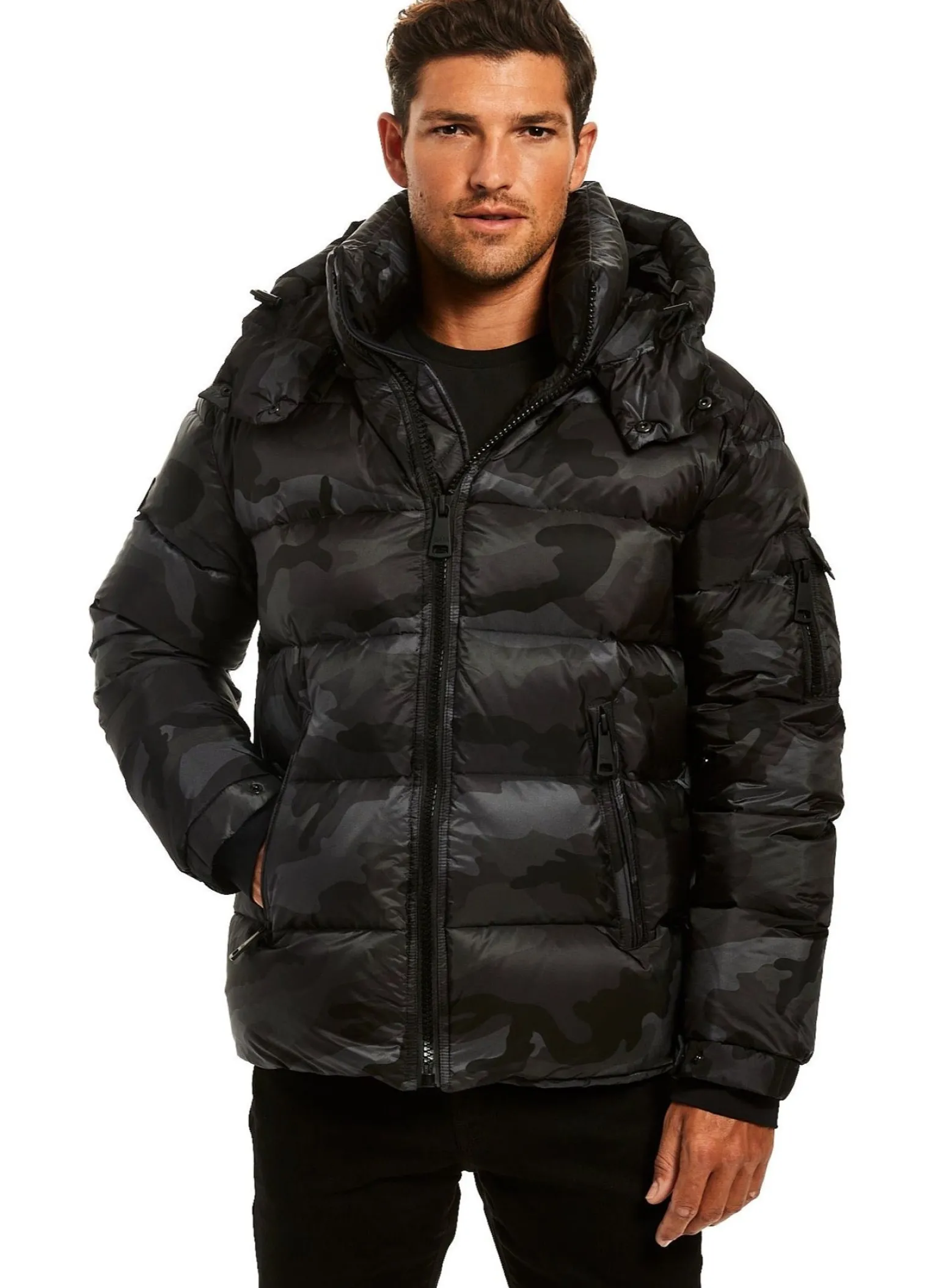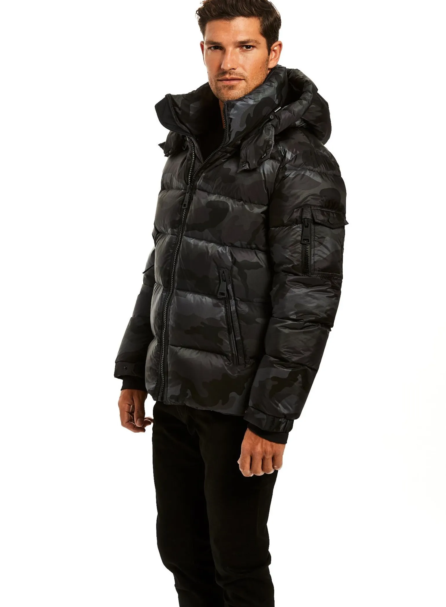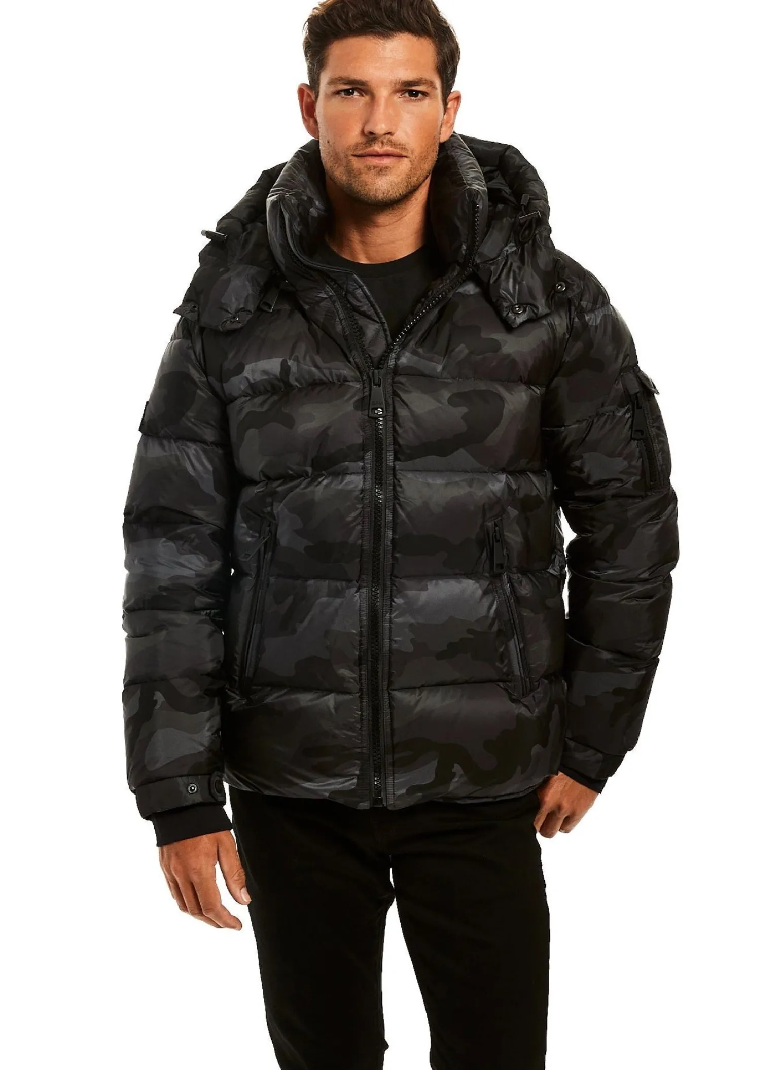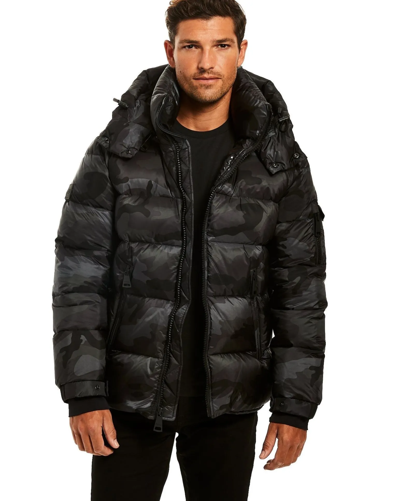This Camo Print, Quilted, Down Jacket Is Crafted From A Densely Woven Nylon. It Is Lightweight, Wind Resistant, Water Repellent, And Filled With Down To Achieve Warmth And An Ultra Soft Feel. The Coat Features A Stand Collar, A Detachable Hood, Center Front Zip Closure, Neoprene Storm Cuffs, And 2 Lower Microfleece Lined Zip Pockets.