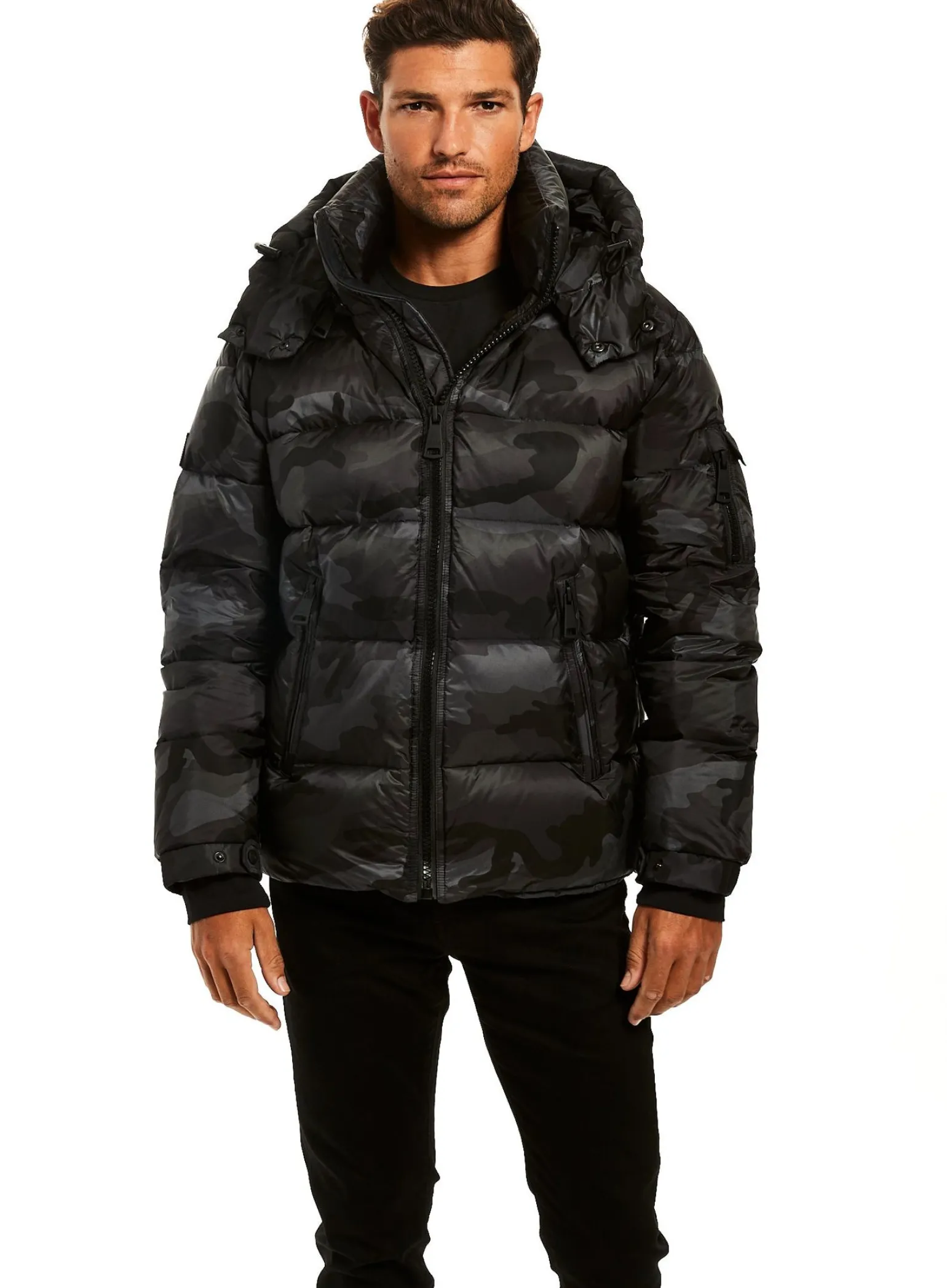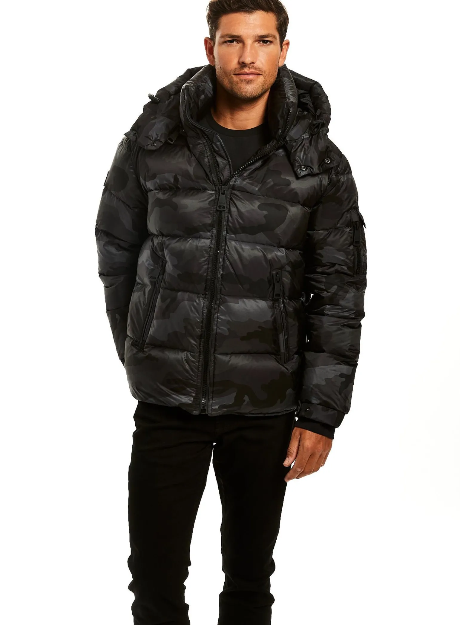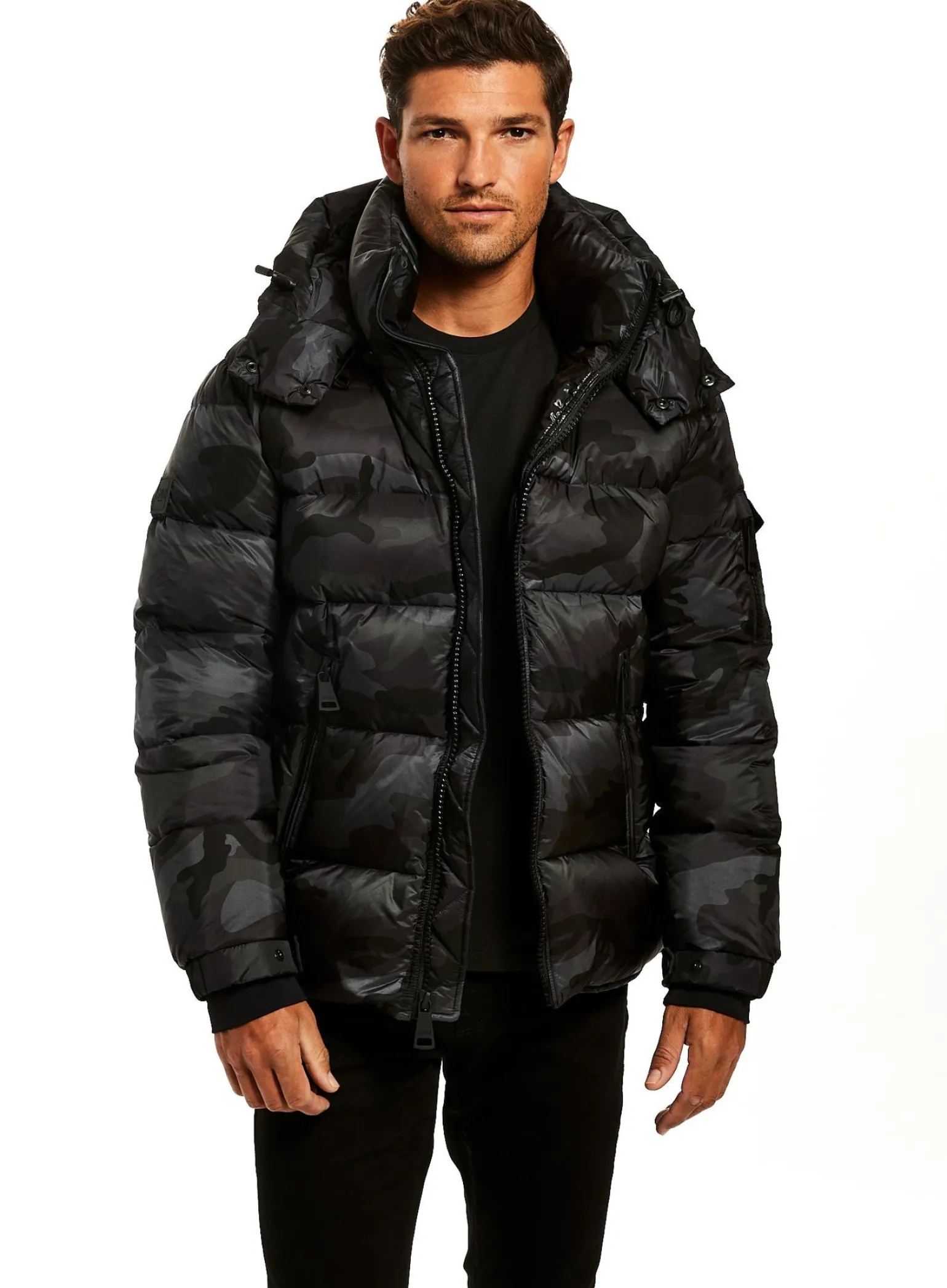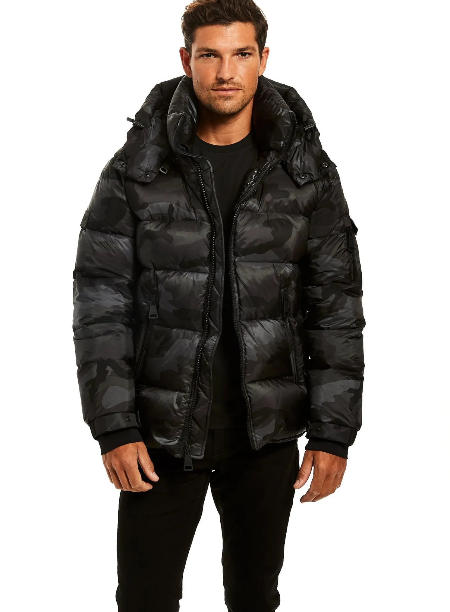 This Camo Print, Quilted, Down Jacket Is Crafted From A Densely Woven Nylon. It Is Lightweight, Wind Resistant, Water Repellent, And Filled With Down To Achieve Warmth And An Ultra Soft Feel. The Coat Features A Stand Collar, A Detachable Hood, Center Front Zip Closure, Neoprene Storm Cuffs, And 2 Lower Microfleece Lined Zip Pockets.