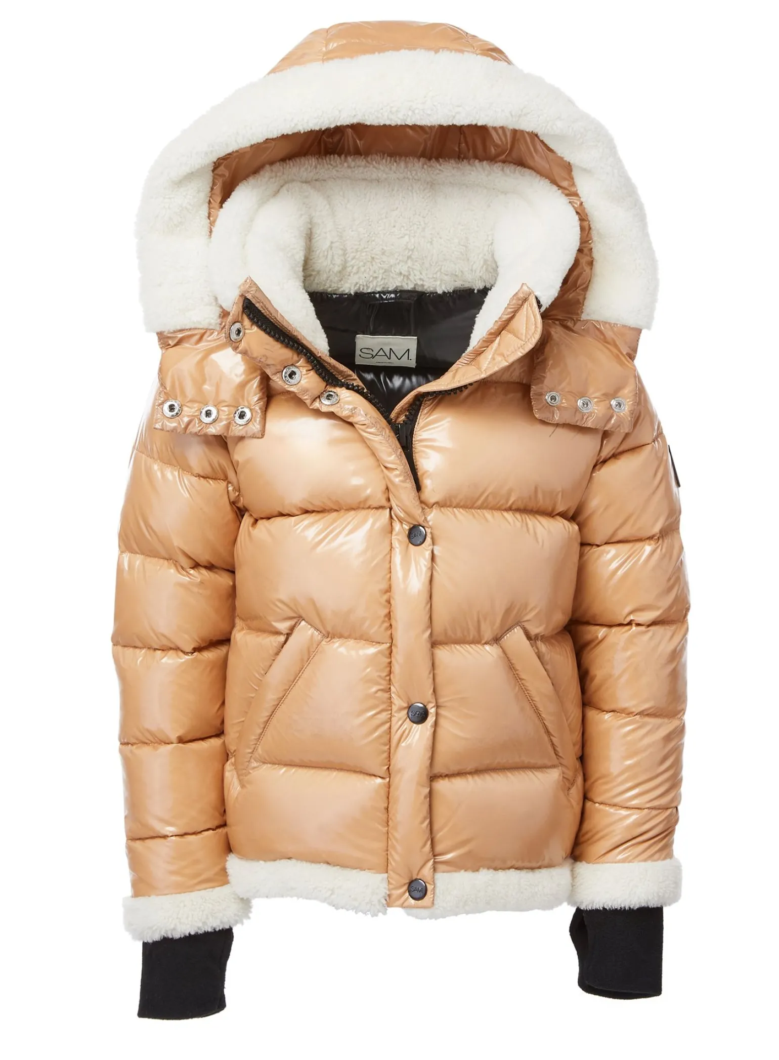 This Channel-Quilted, Down Jacket Is Crafted From A Shiny Nylon Fabric. It Is Lightweight, Yet Protective From Wind And Water, And Filled With Fine Down To Achieve Warmth And An Ultra Soft Feel. The Avery Features Shearling Trim On The Cuffs, A Shearling Stand Collar, A Detachable Shearling Lined Hood, Fleece Wrist Cuffs With Thumbholes, Center Front Zip Closure With Snap Placket, And Lower Zip Pockets.