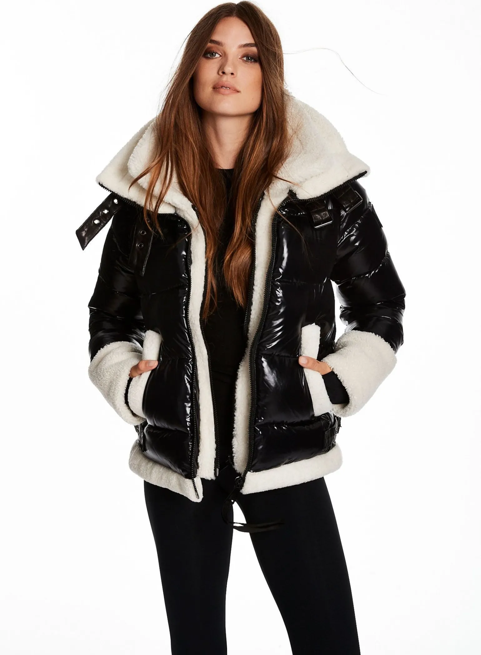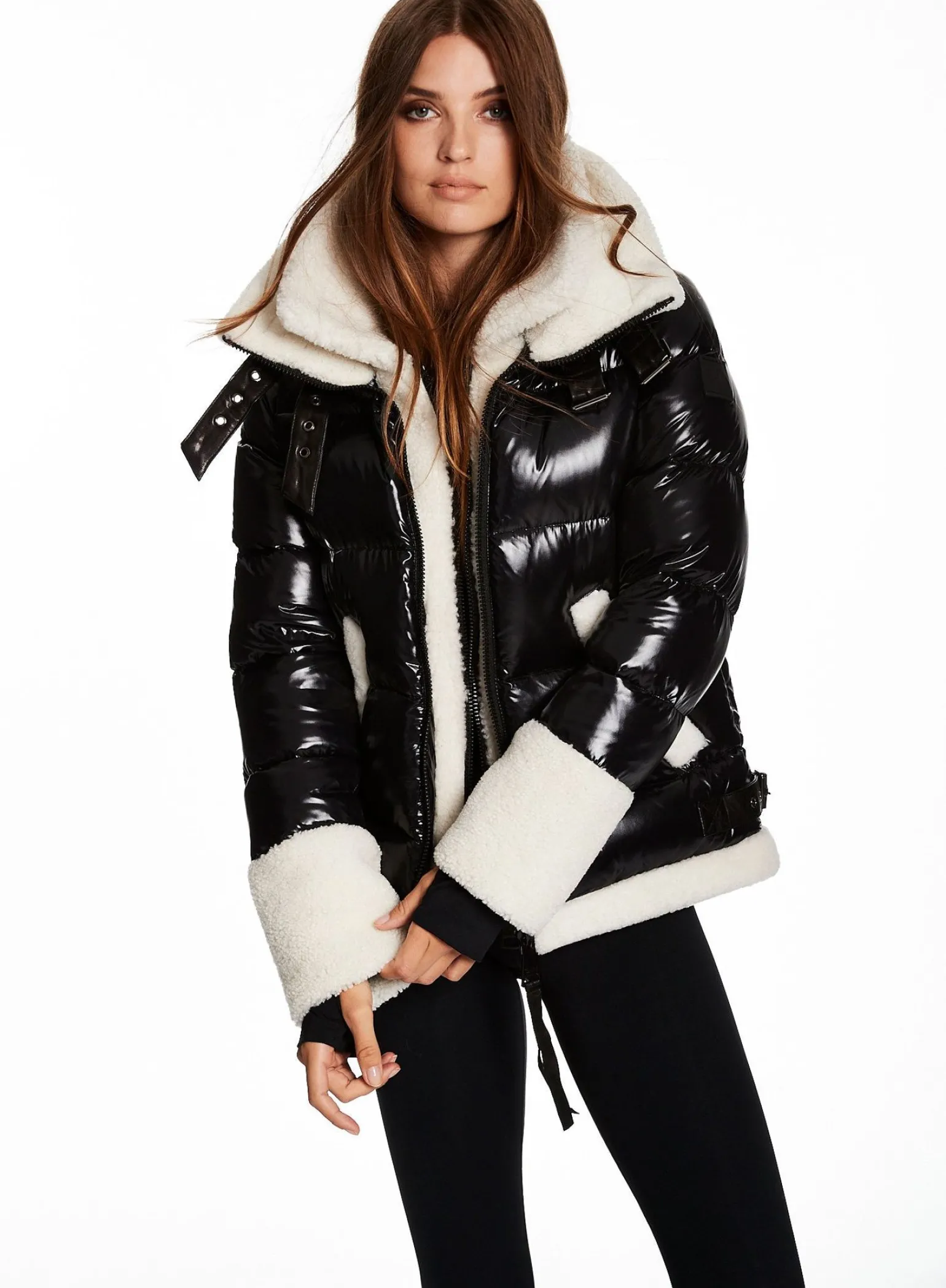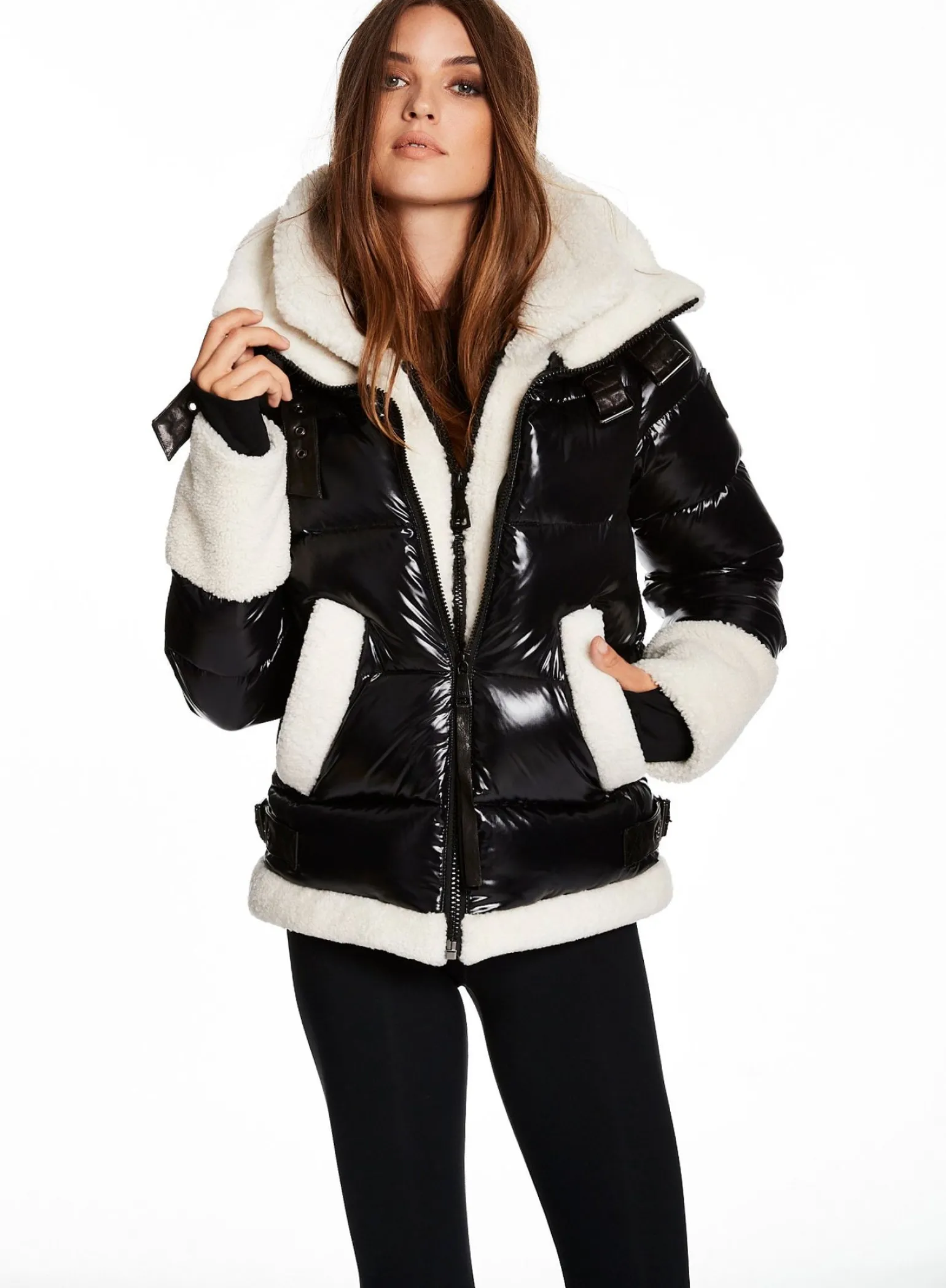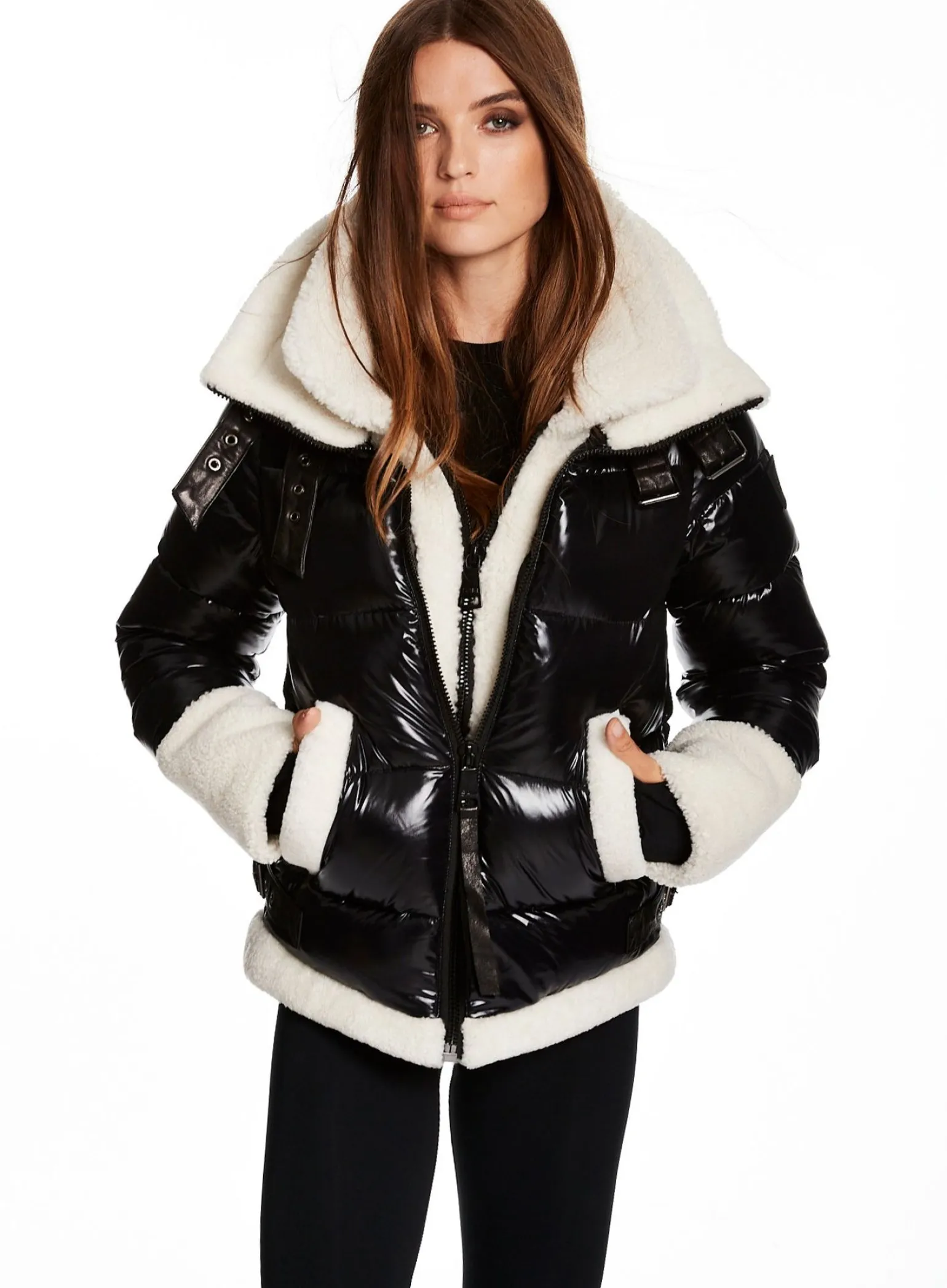 This Puffer Jacket Is Crafted From A Densely Woven Nylon Yarn, And Filled With Duck Down To Achieve Warmth And An Ultra Soft Feel. It Is Lightweight, Wind Resistant, And Water-Repellent. The Heidi Features A Shearling Stand Collar And Attached Shearling Bib, Shearling Trim On The Cuffs And Hem, Spandex Wrist Cuffs With Thumbholes, Center Front Zip, And Lower Zip Pockets.