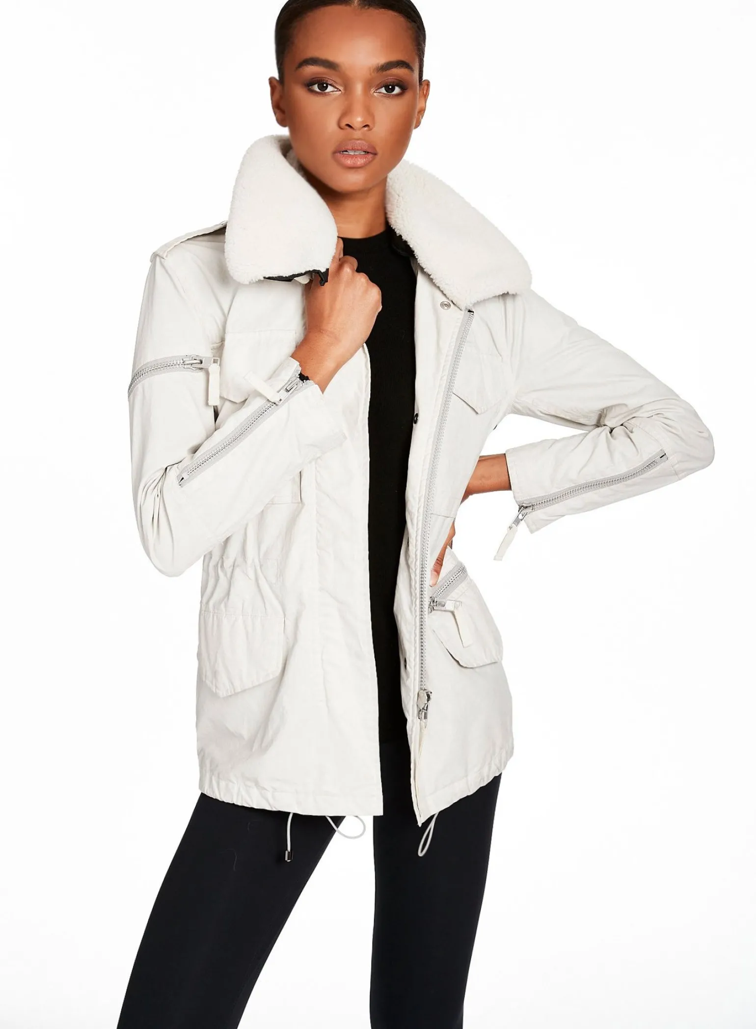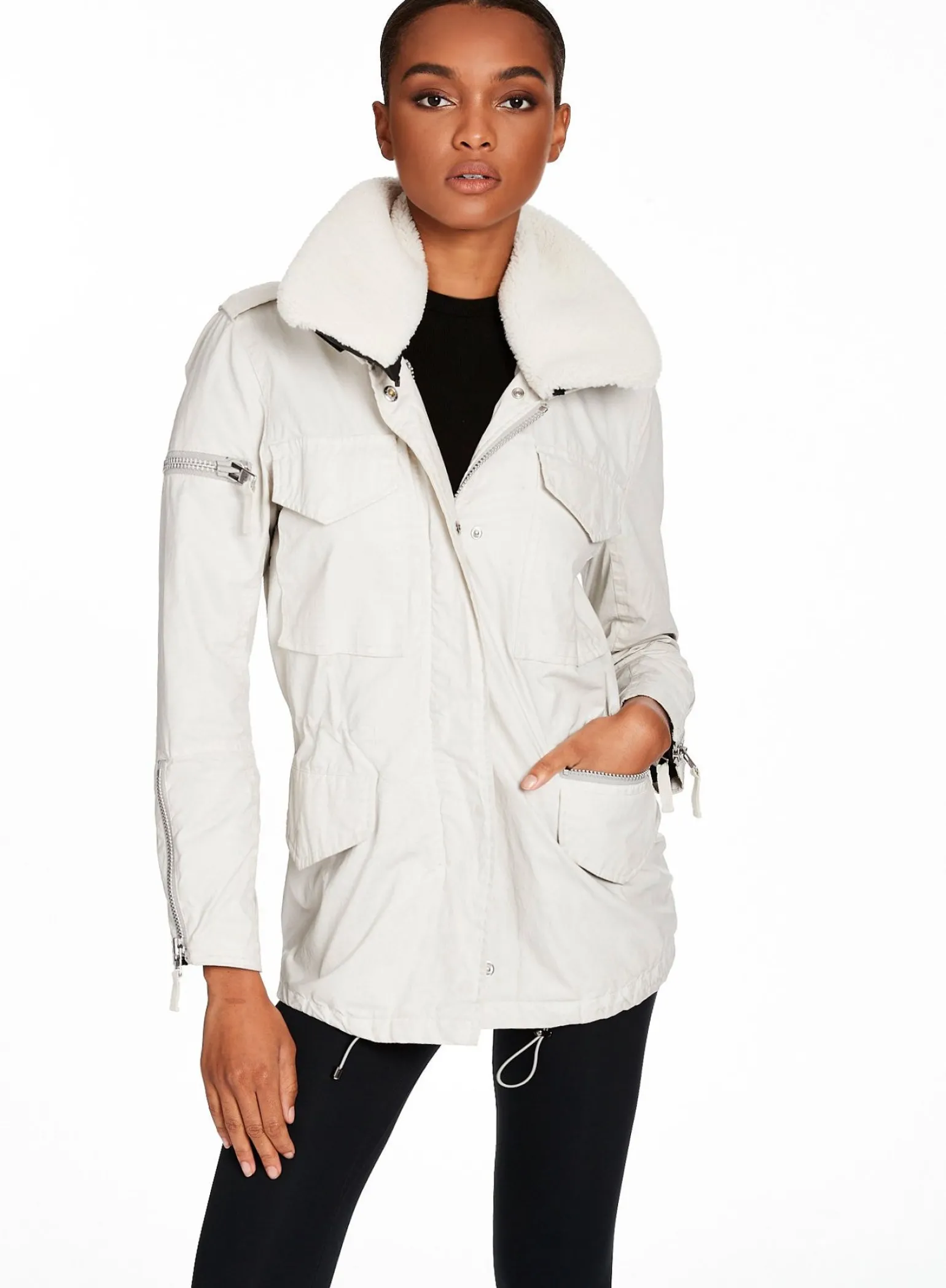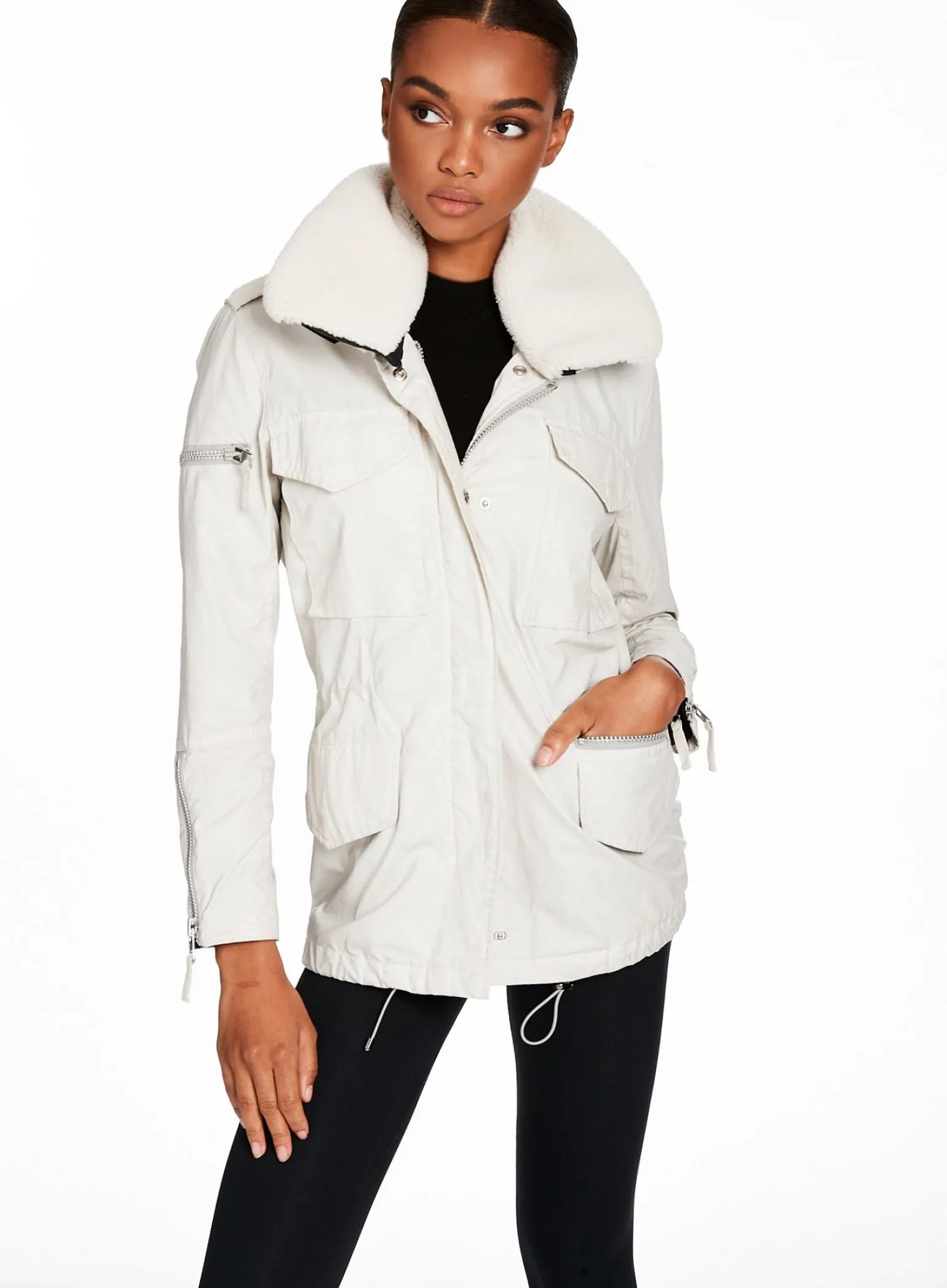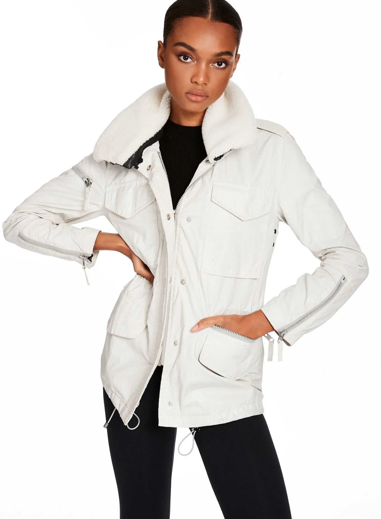 The Kate Is Perfect For Year Round Warmth And Function. This Adjustable Drawstring Parka Is Crafted From A Cotton Twill That Has Been Treated With Three Layers Of Polyurethane Resins, Making The Garment Wind Resistant, Water Repellent, And Easy To Care For. The Fabric Has Been Tumbled To Accentuate A Distressed Feel, And Is Intended To Break In With Wear. The Kate Shell Is Insulated With 3Mthinsulate Padding To Ensure Warmth Without Adding Any Bulk, And It Features A Detachable Shearling Collar, A Roll-Out Hood That Zips Out From The Jacket Collar, 4 Cargo Pockets, Center Front Zip And Snap Placket Closure, A Hidden Adjustable Drawstring Waist, And Adjustable Drawstring Hem.
