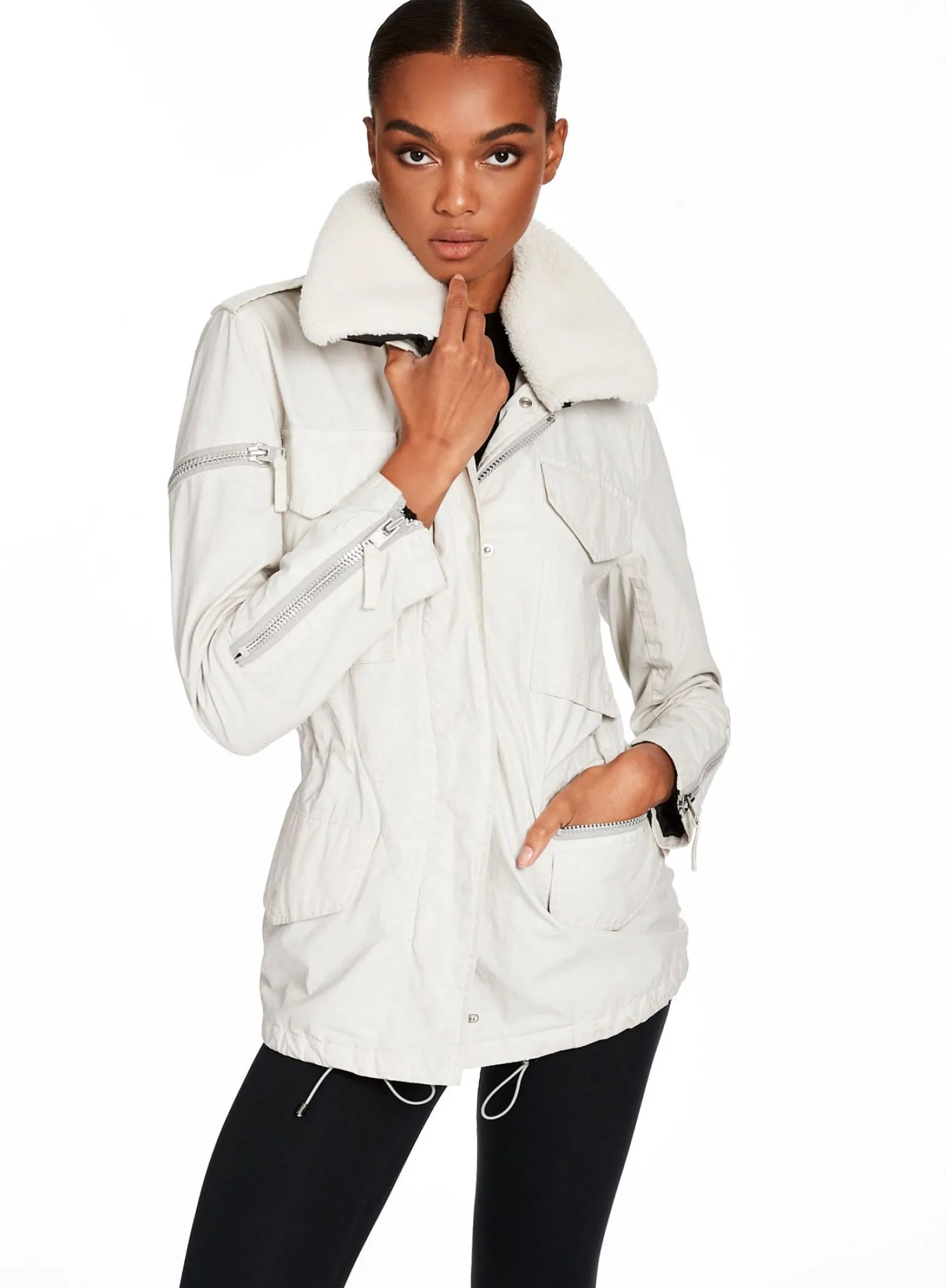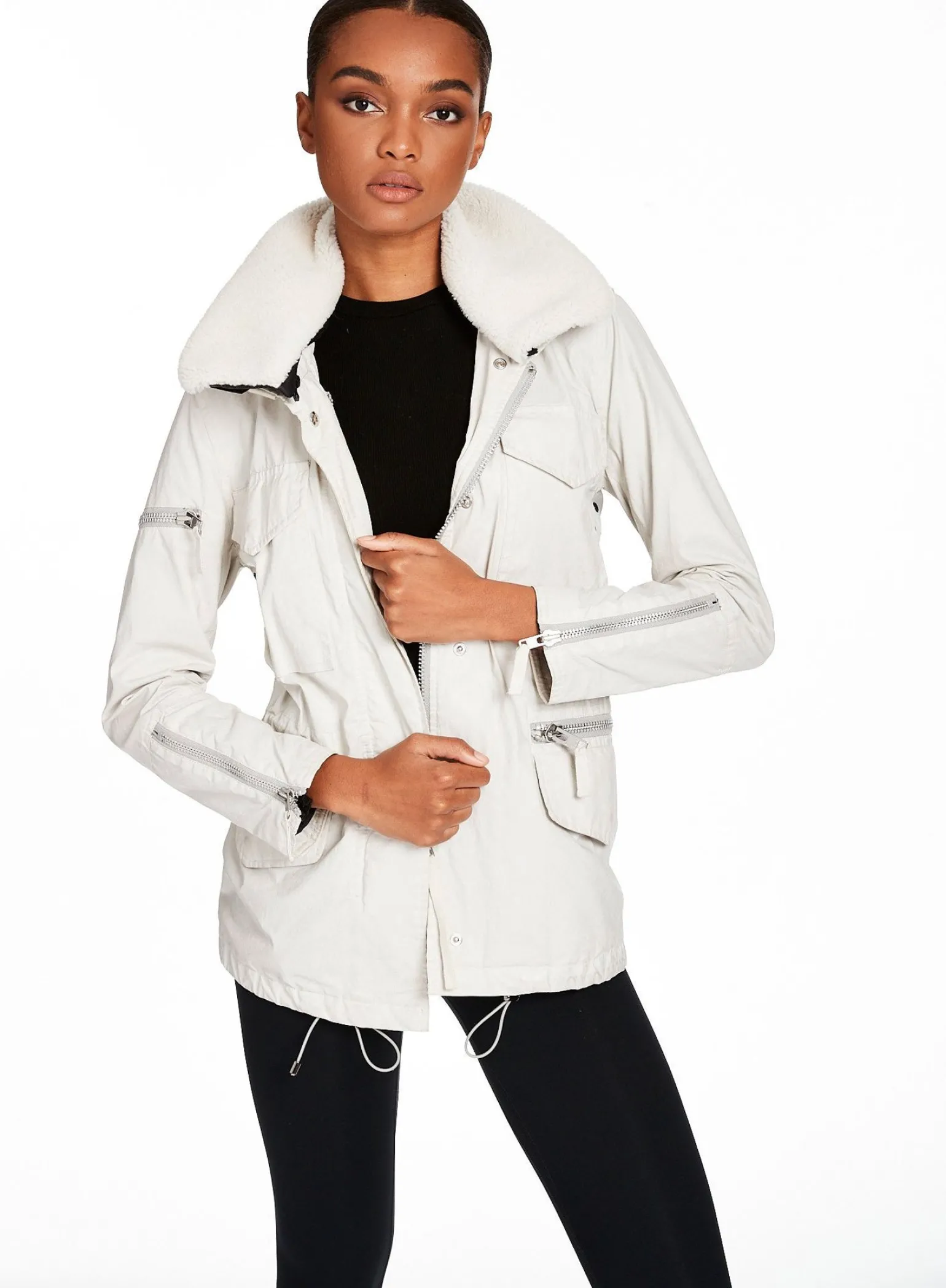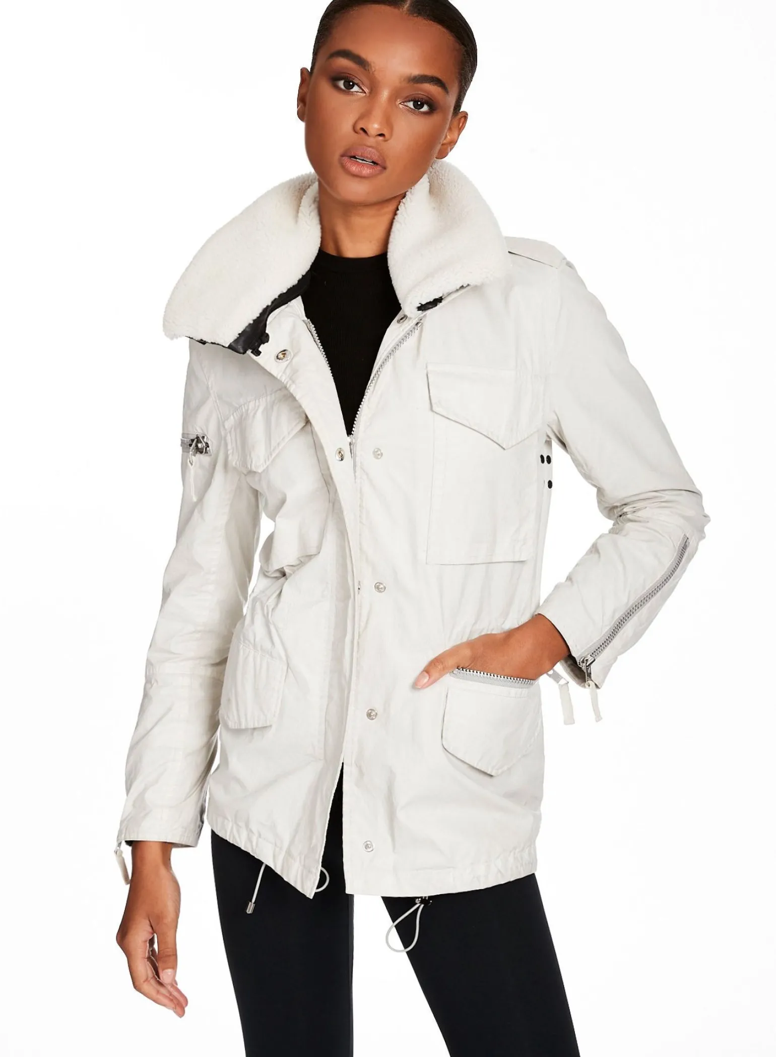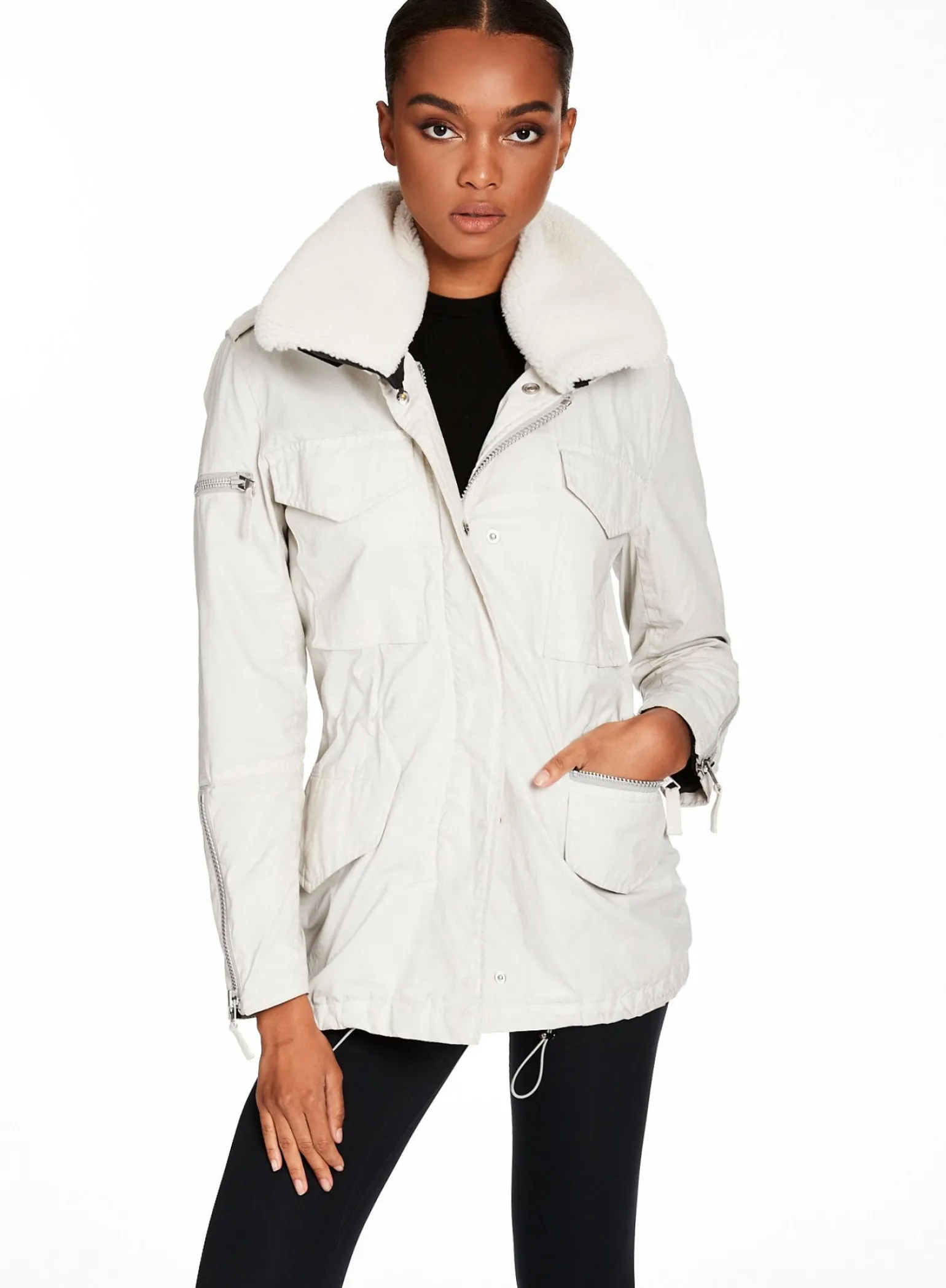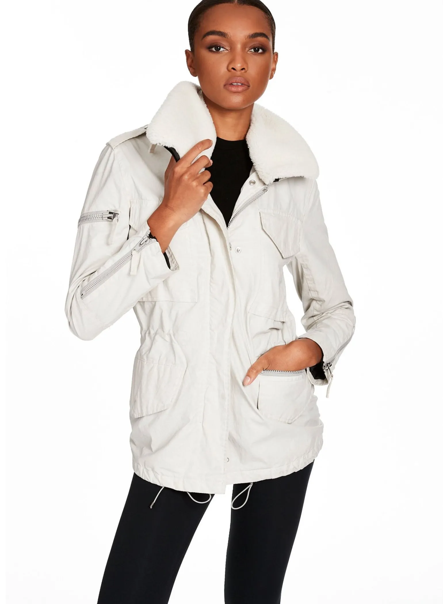 The Kate Is Perfect For Year Round Warmth And Function. This Adjustable Drawstring Parka Is Crafted From A Cotton Twill That Has Been Treated With Three Layers Of Polyurethane Resins, Making The Garment Wind Resistant, Water Repellent, And Easy To Care For. The Fabric Has Been Tumbled To Accentuate A Distressed Feel, And Is Intended To Break In With Wear. The Kate Shell Is Insulated With 3Mthinsulate Padding To Ensure Warmth Without Adding Any Bulk, And It Features A Detachable Shearling Collar, A Roll-Out Hood That Zips Out From The Jacket Collar, 4 Cargo Pockets, Center Front Zip And Snap Placket Closure, A Hidden Adjustable Drawstring Waist, And Adjustable Drawstring Hem.