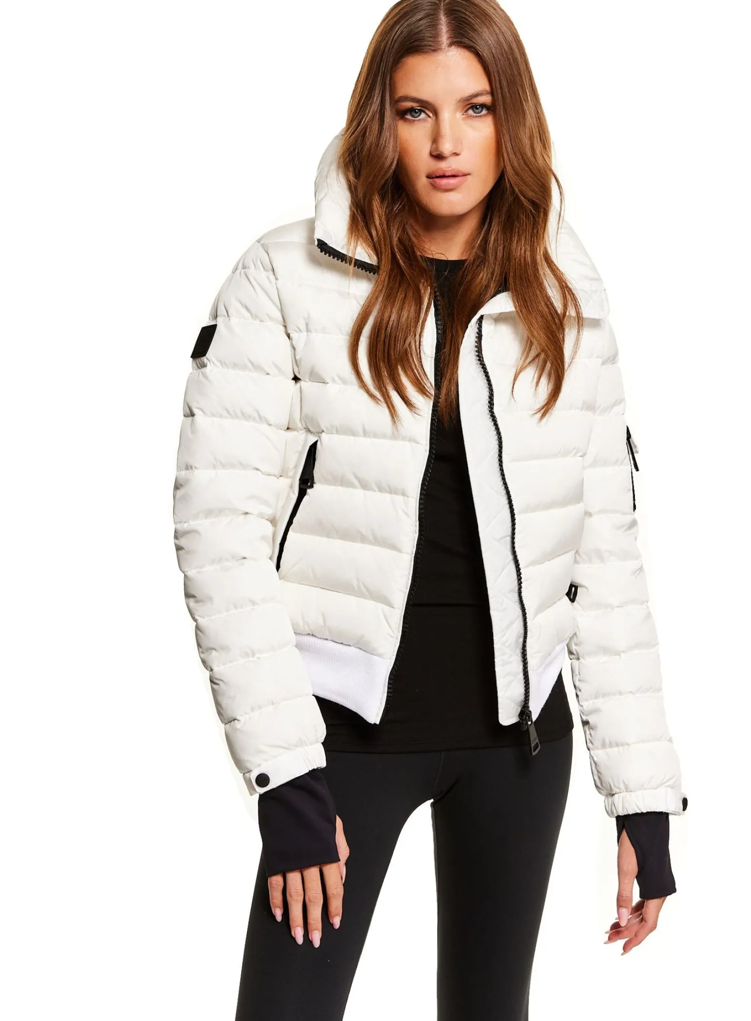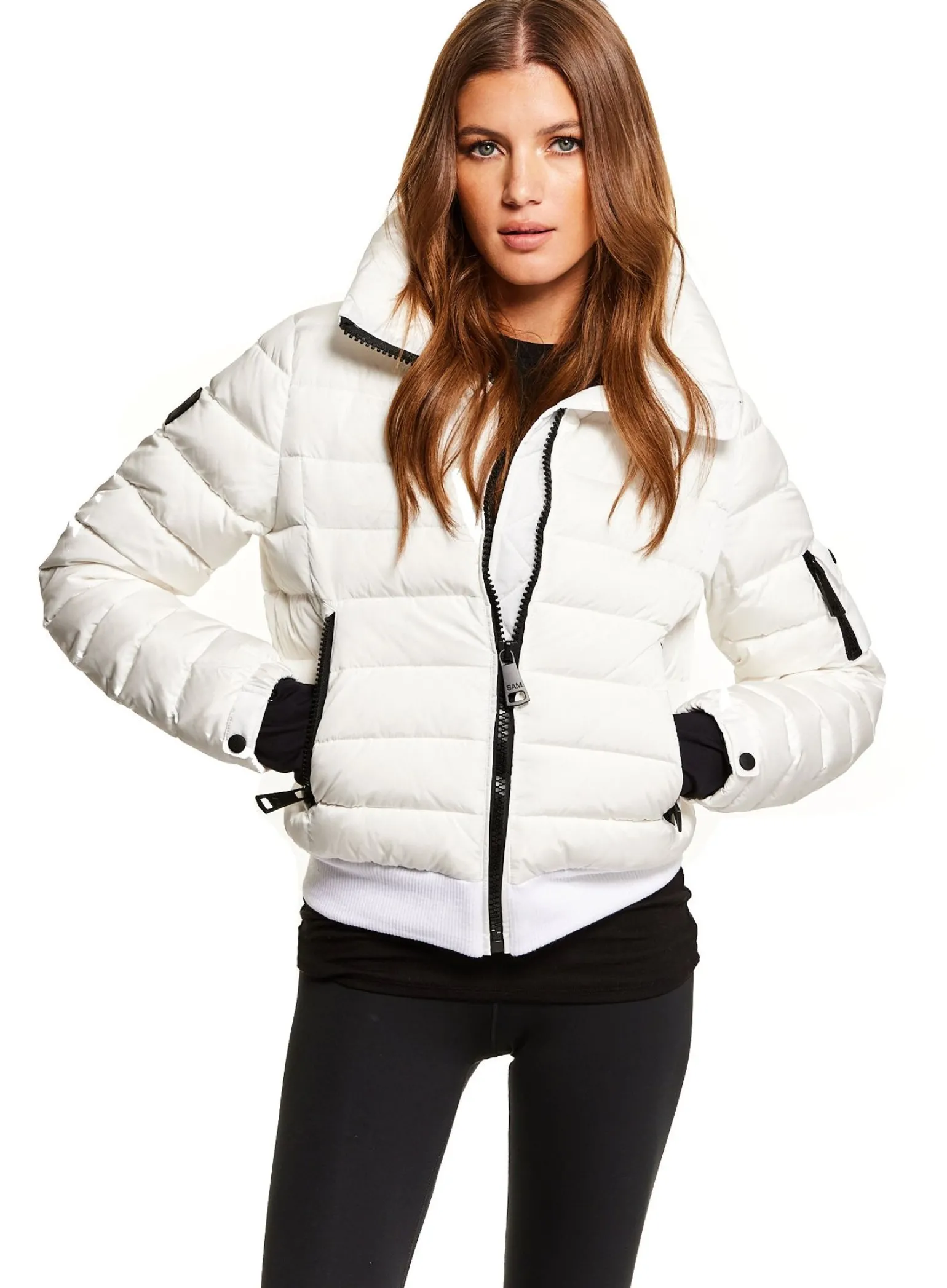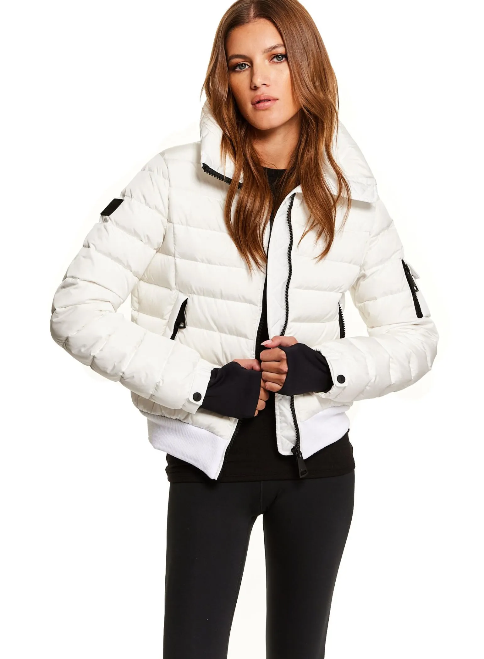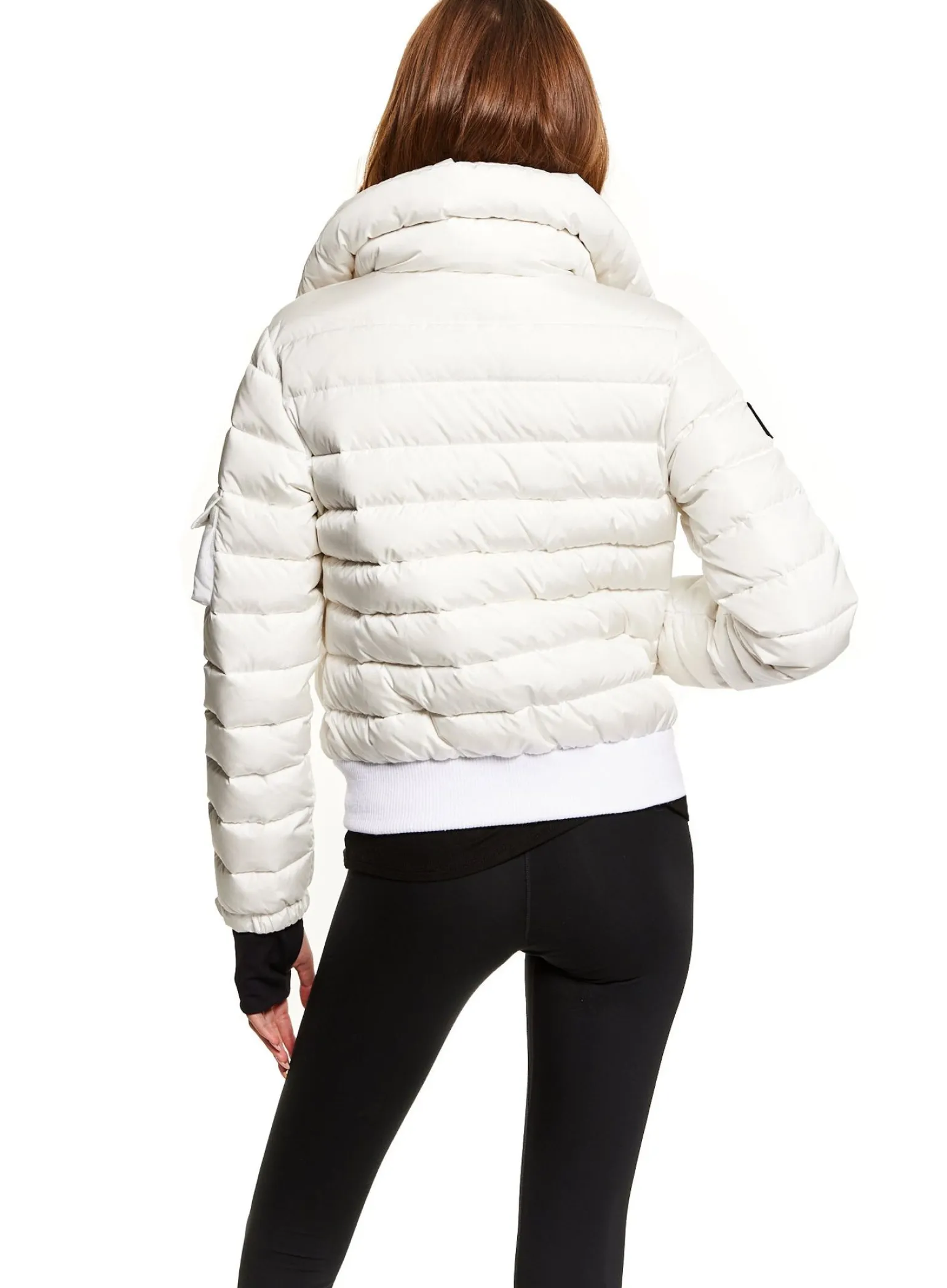 This Quilted, Bomber Style, Down Jacket Is Crafted From A Densely Woven Nylon, And Filled With Down To Achieve Warmth And An Ultra Soft Feel. The Luna Is Lightweight, Wind Resistant, And Water Repellent, Making It Perfect For Year-Round Wear And Function. It Features A Stand Collar, Center Front Zip Closure, 3 Stripes Across The Chest, Arms, And Back, Spandex Thumbhole Cuffs, 2 Lower Zip Pockets, Snap Sleeve And Pocket Detail, And A Knit Waistband.