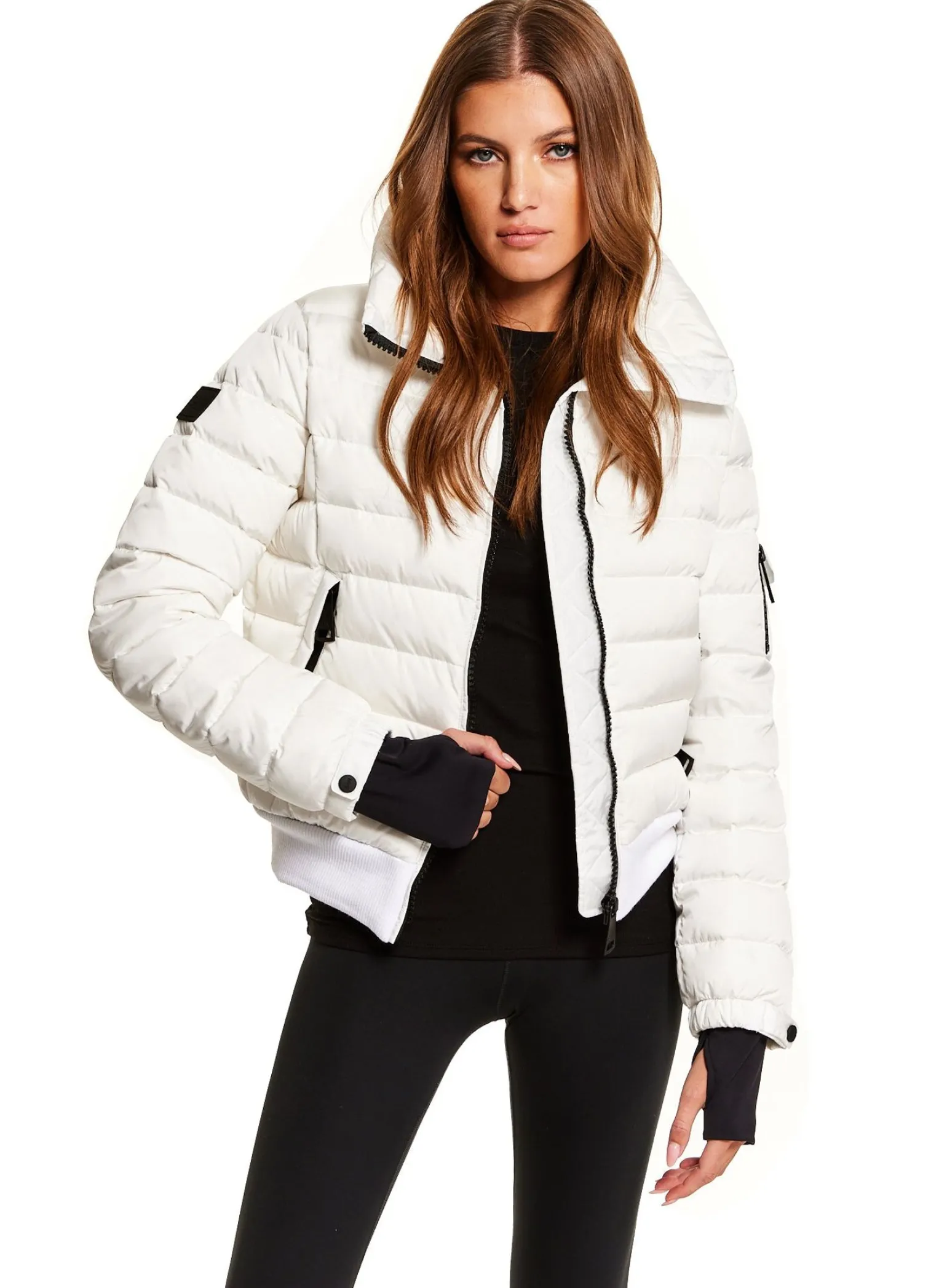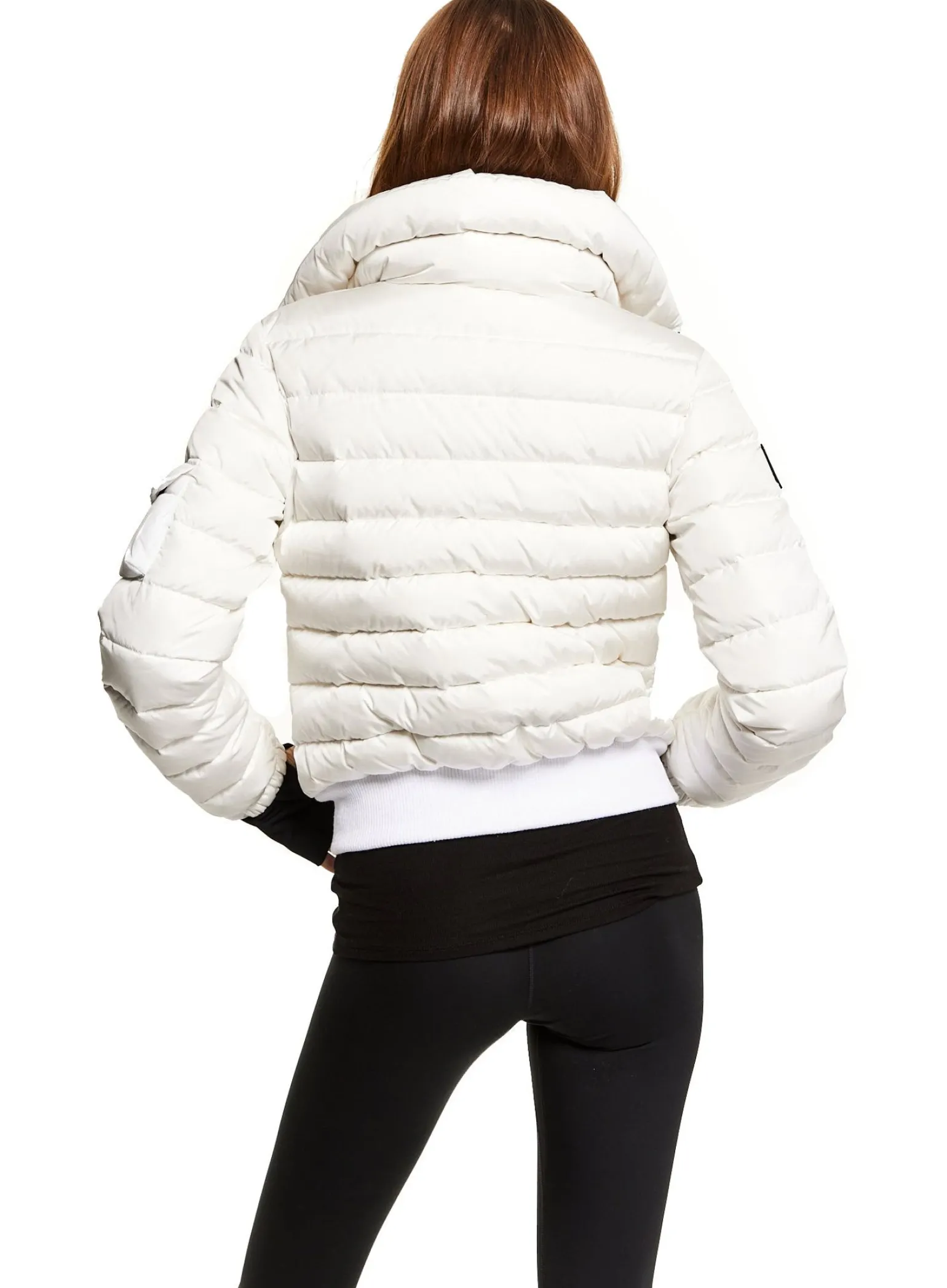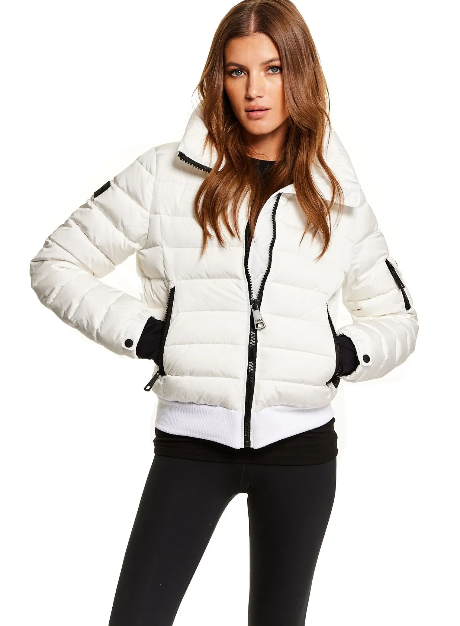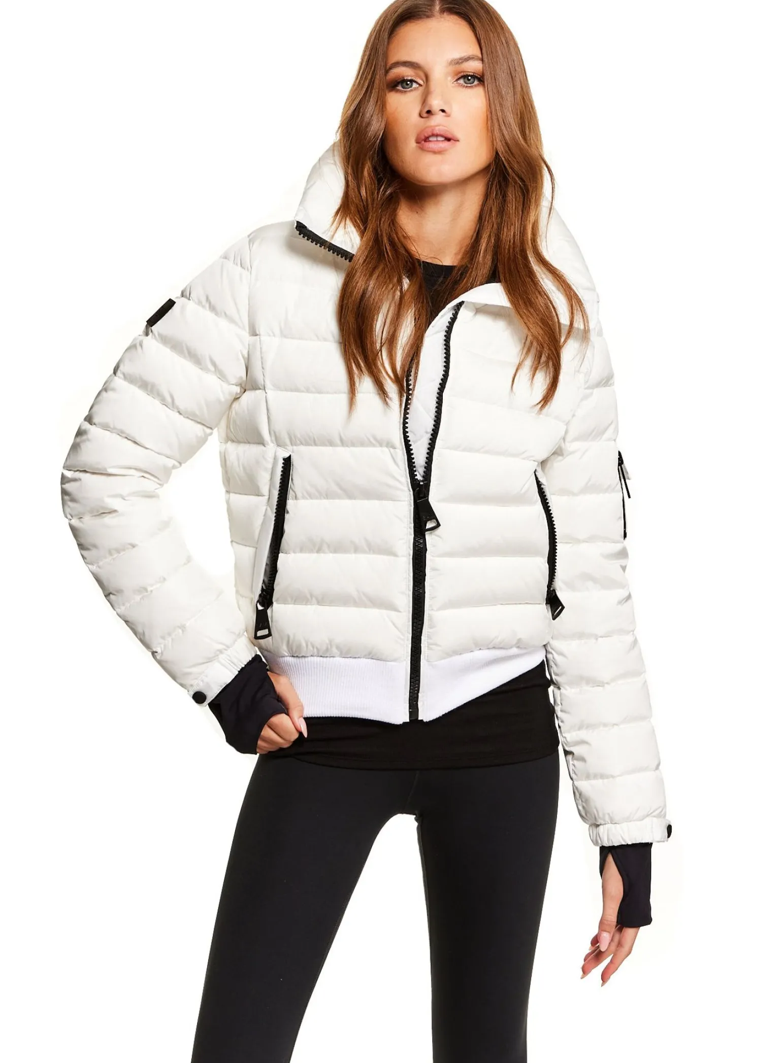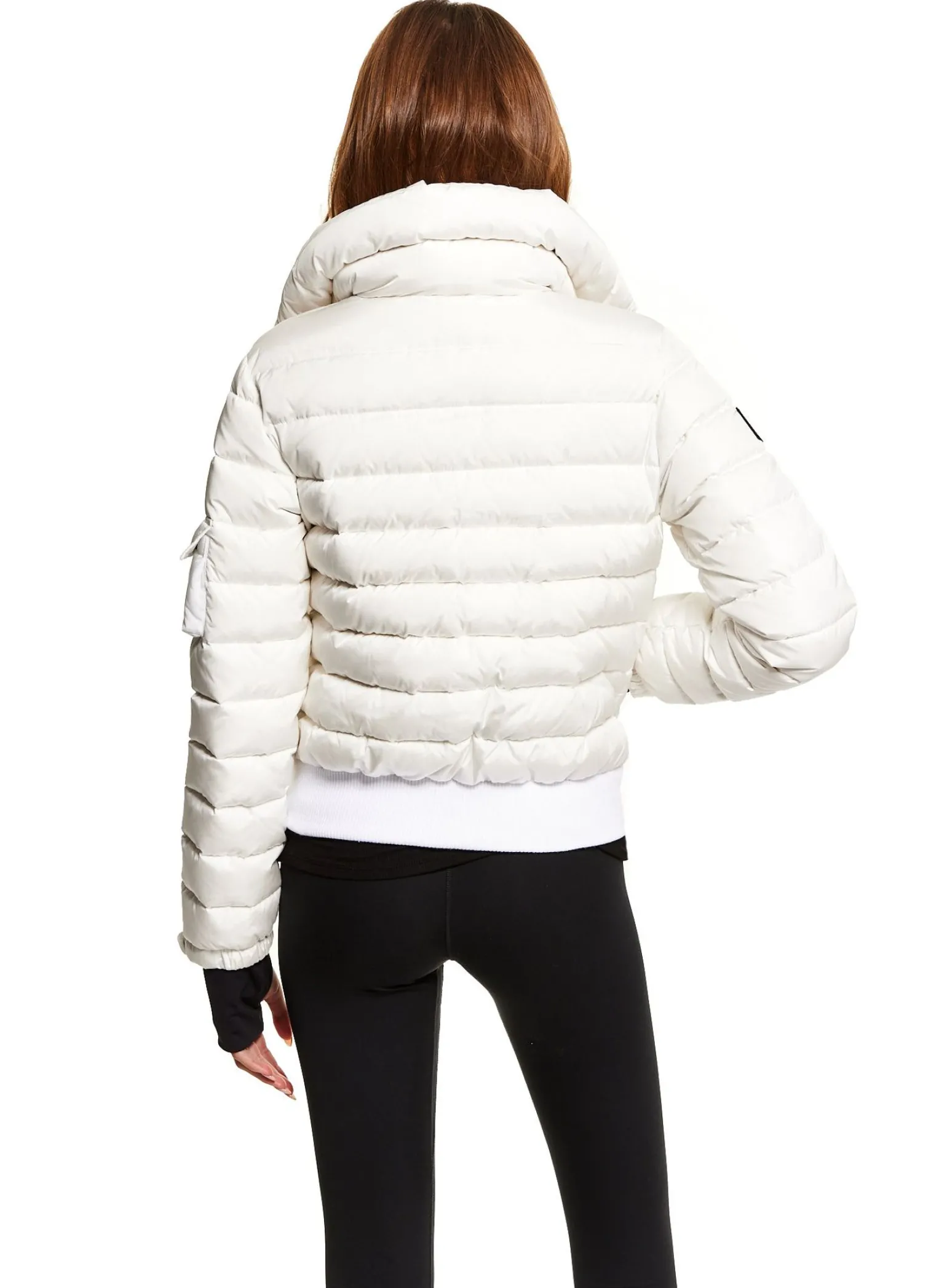 This Quilted, Bomber Style, Down Jacket Is Crafted From A Densely Woven Nylon, And Filled With Down To Achieve Warmth And An Ultra Soft Feel. The Luna Is Lightweight, Wind Resistant, And Water Repellent, Making It Perfect For Year-Round Wear And Function. It Features A Stand Collar, Center Front Zip Closure, 3 Stripes Across The Chest, Arms, And Back, Spandex Thumbhole Cuffs, 2 Lower Zip Pockets, Snap Sleeve And Pocket Detail, And A Knit Waistband.