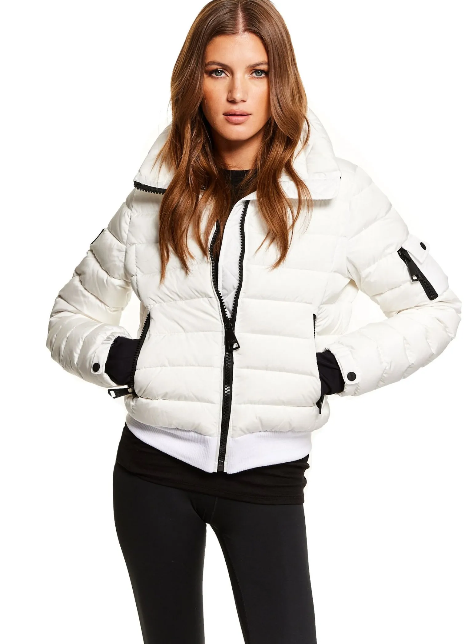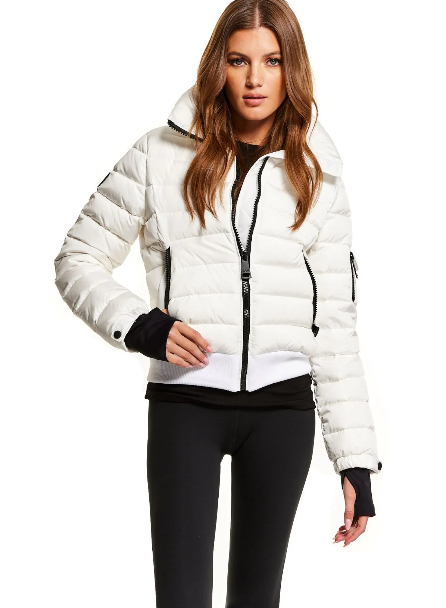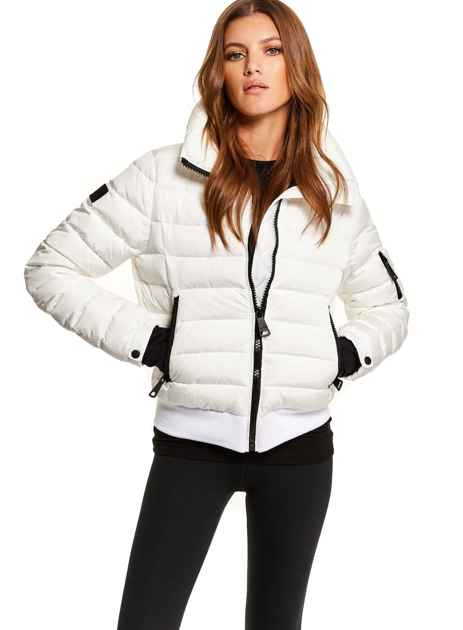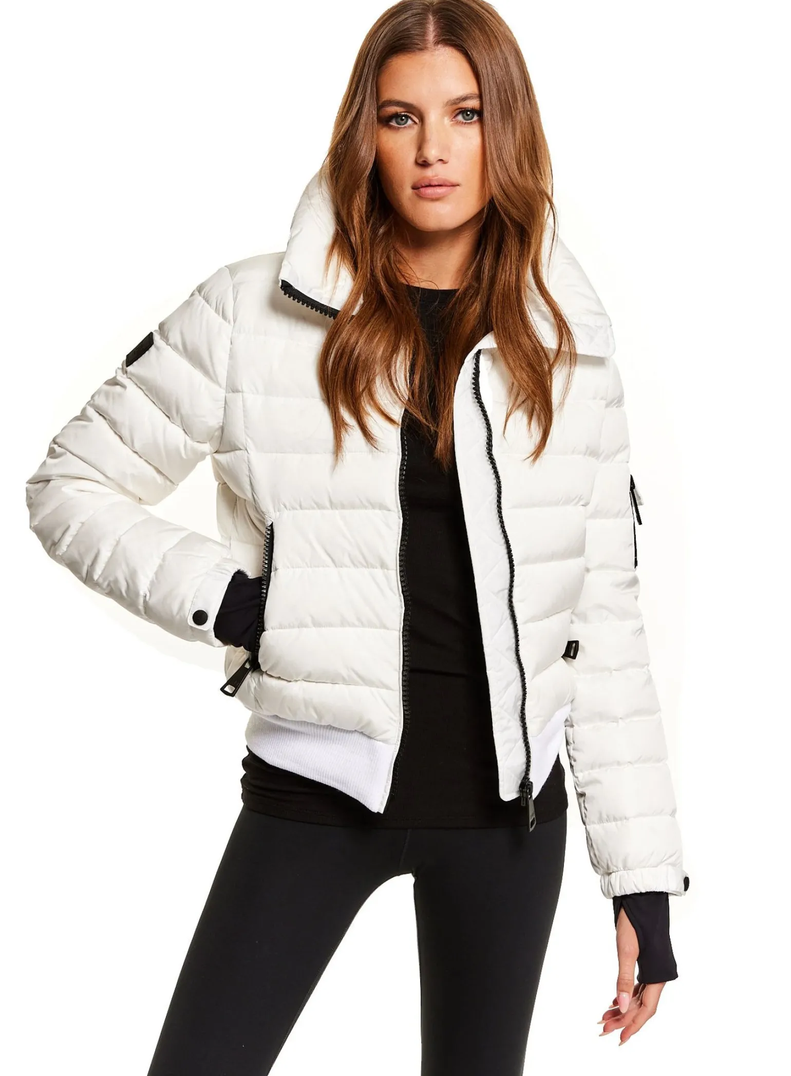 This Quilted, Bomber Style, Down Jacket Is Crafted From A Densely Woven Nylon, And Filled With Down To Achieve Warmth And An Ultra Soft Feel. The Luna Is Lightweight, Wind Resistant, And Water Repellent, Making It Perfect For Year-Round Wear And Function. It Features A Stand Collar, Center Front Zip Closure, 3 Stripes Across The Chest, Arms, And Back, Spandex Thumbhole Cuffs, 2 Lower Zip Pockets, Snap Sleeve And Pocket Detail, And A Knit Waistband.