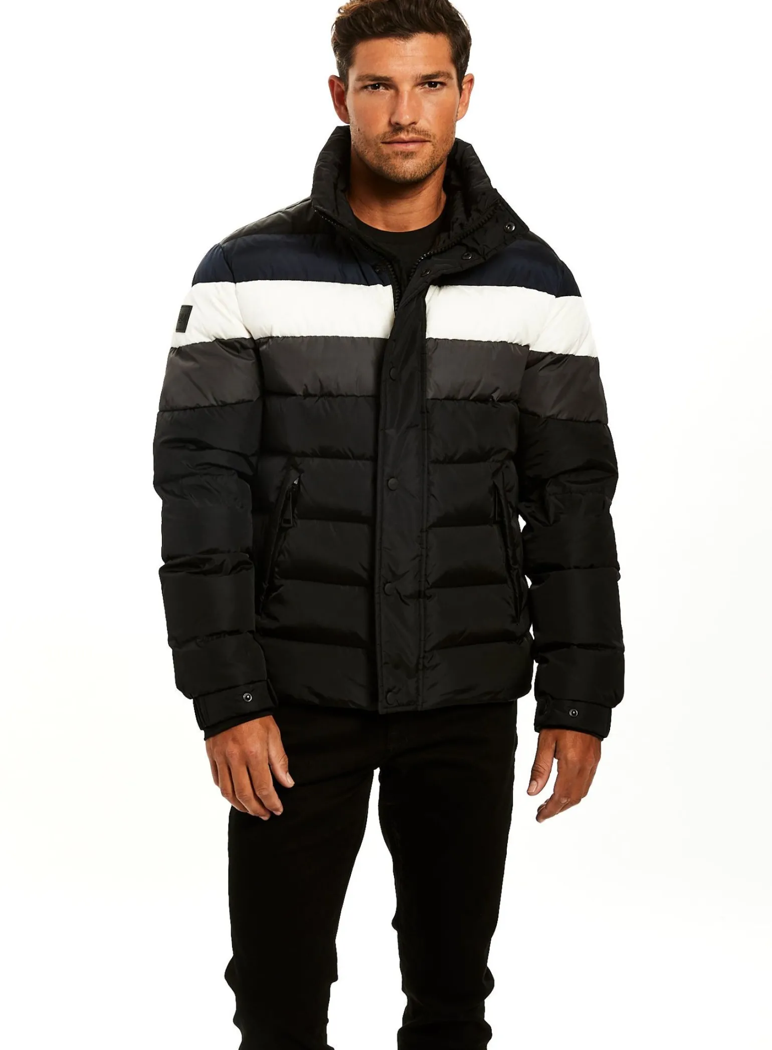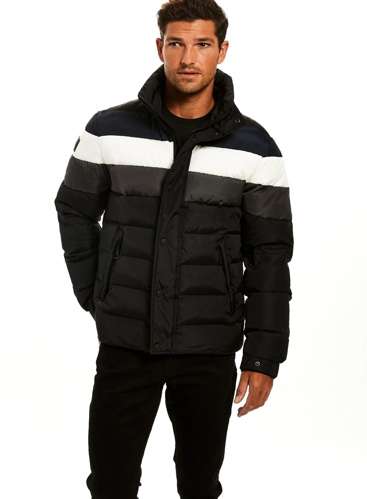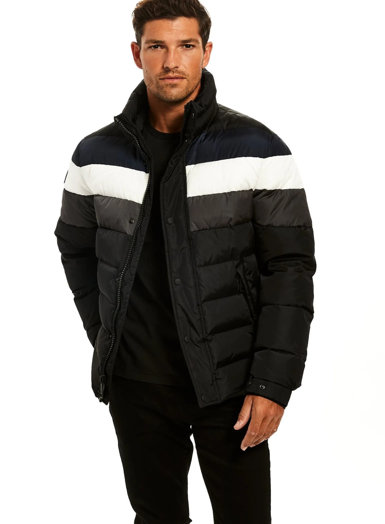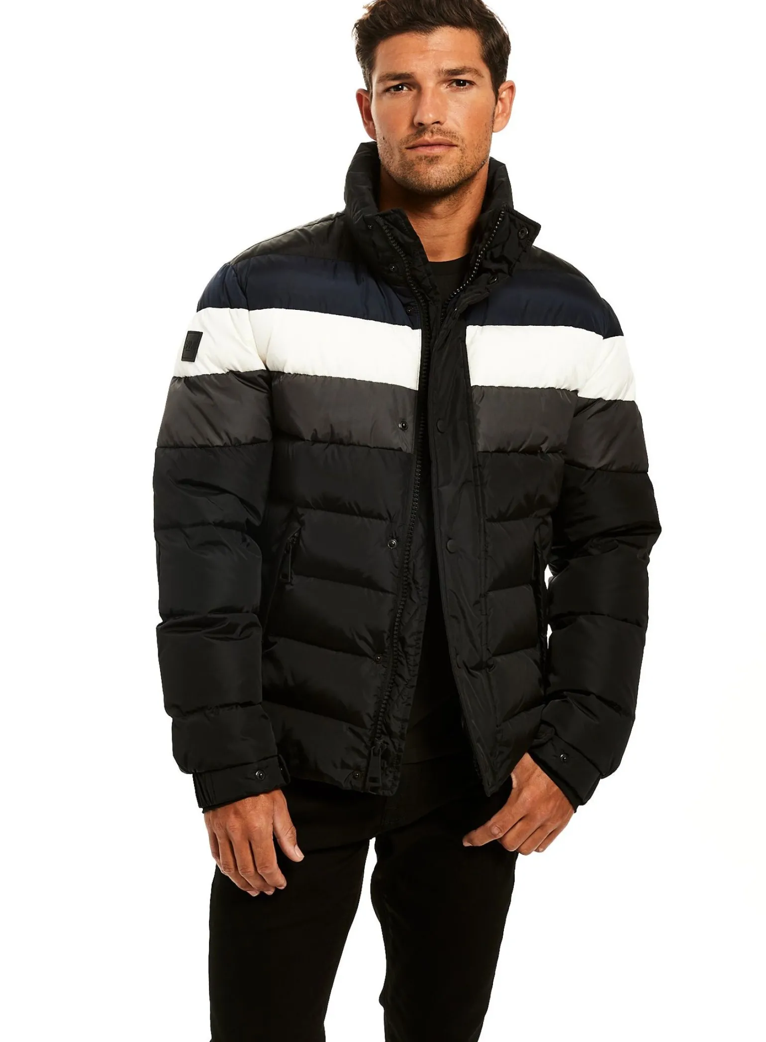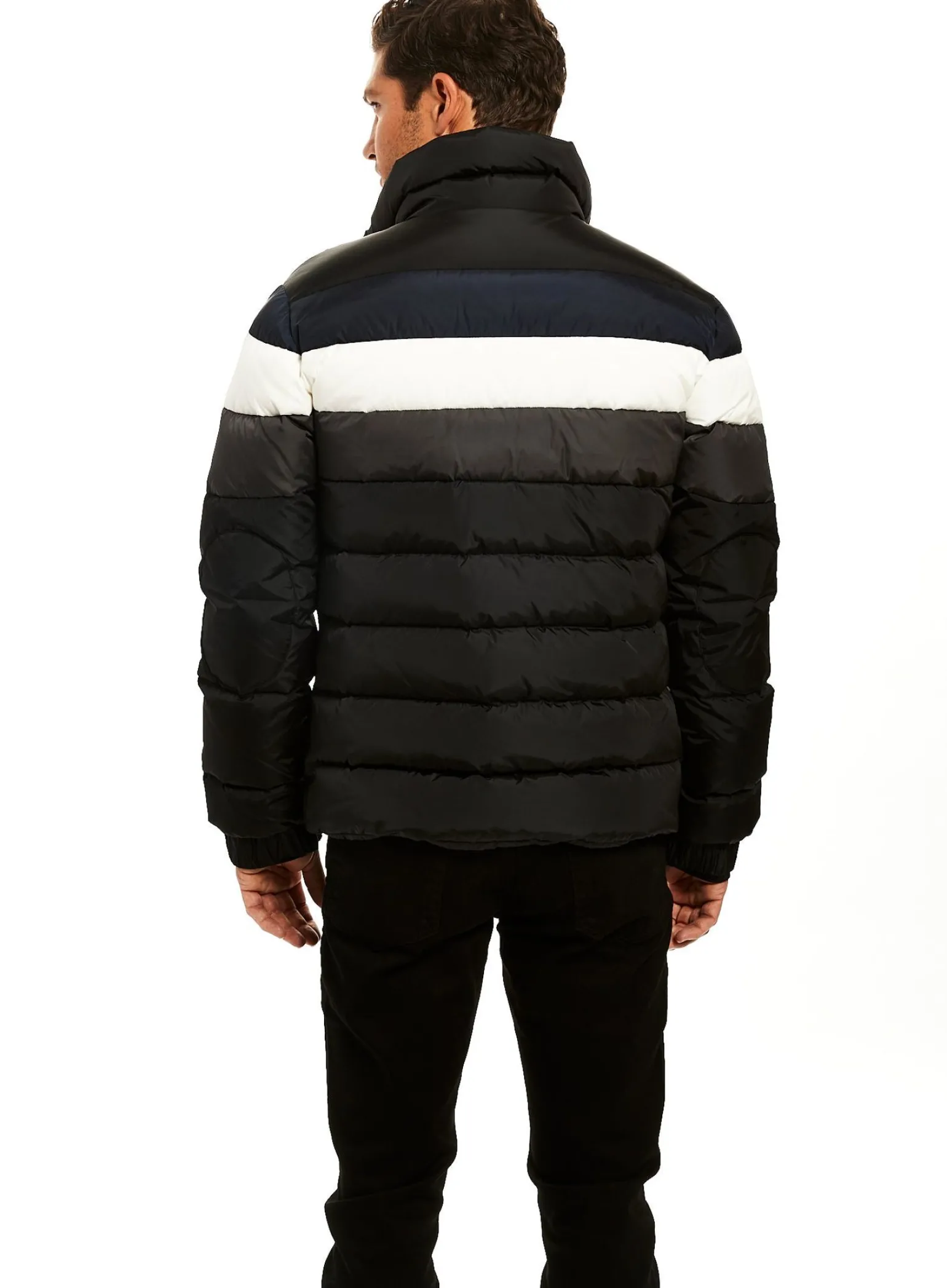 This Quilted, Down Jacket Is Crafted From A Densely Woven Matte Nylon. It Is Lightweight, Wind Resistant, Water Repellent, And Filled With Down. The Tight Quilting Makes The Jacket Perfect For Both Transitional Weather And Year Round Warmth. The Jacket Features A Stand Collar, Center Front Zip Closure With A Snap Placket, Three Horizontal Stripes Across The Chest, Shoulder, And Back, A Stand Collar, And 2 Front Zip Pockets.
