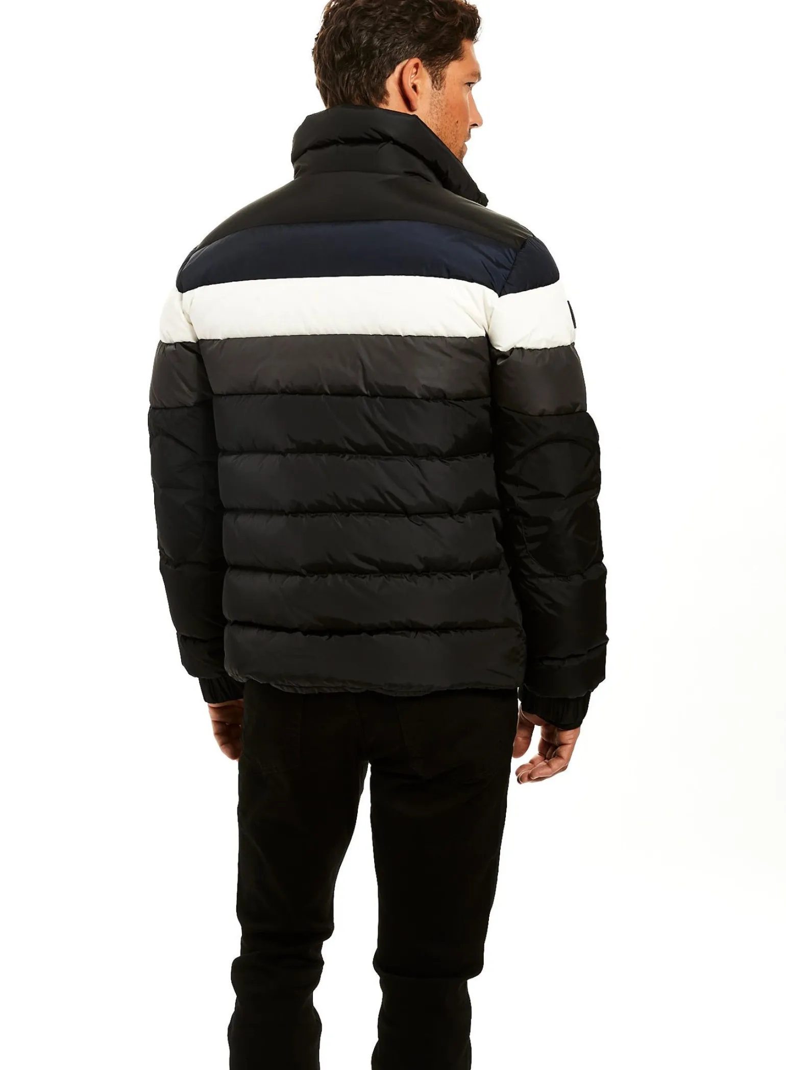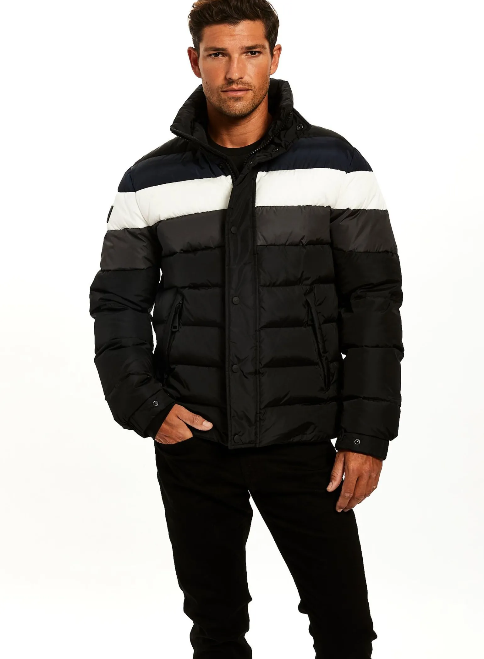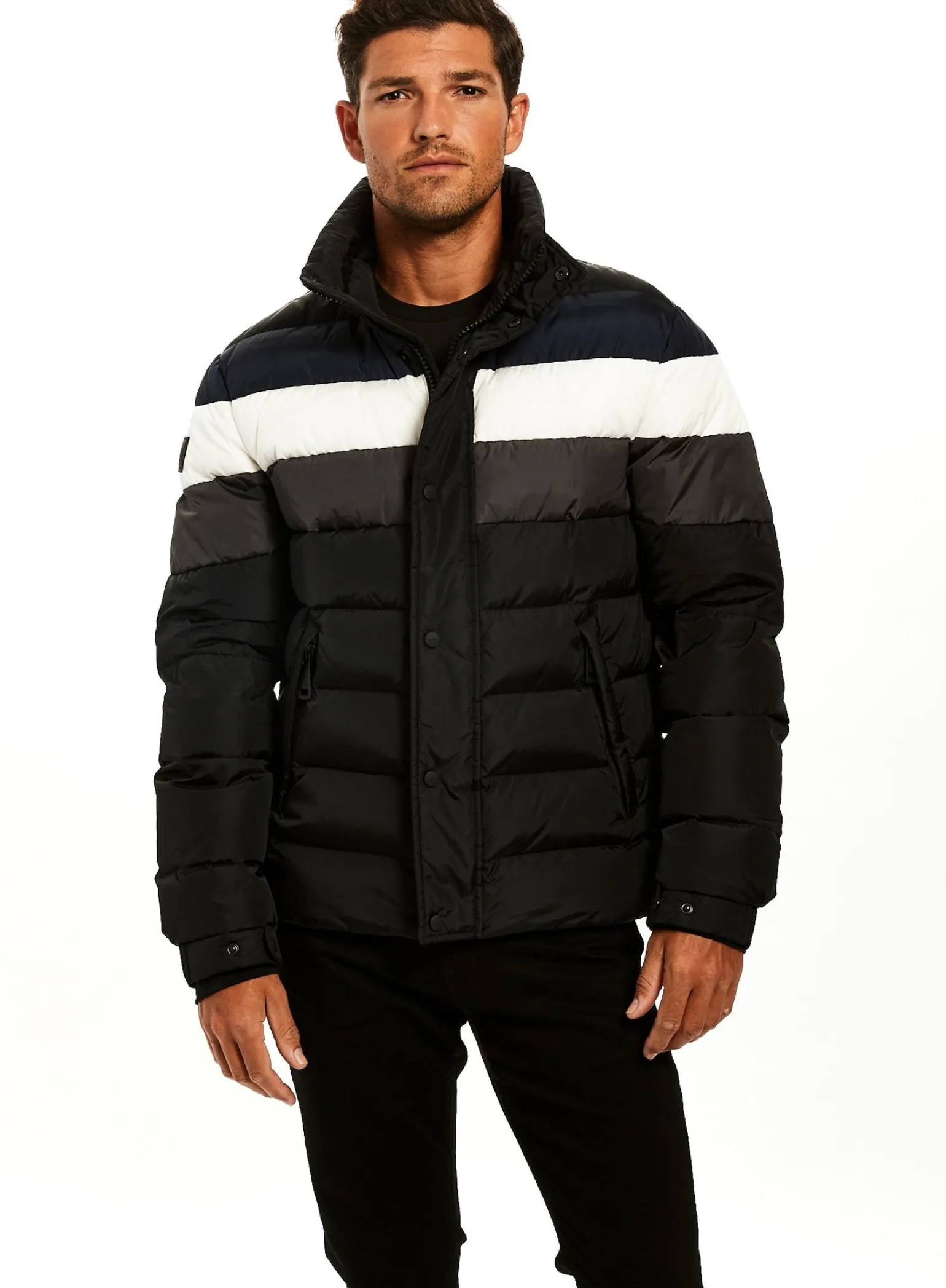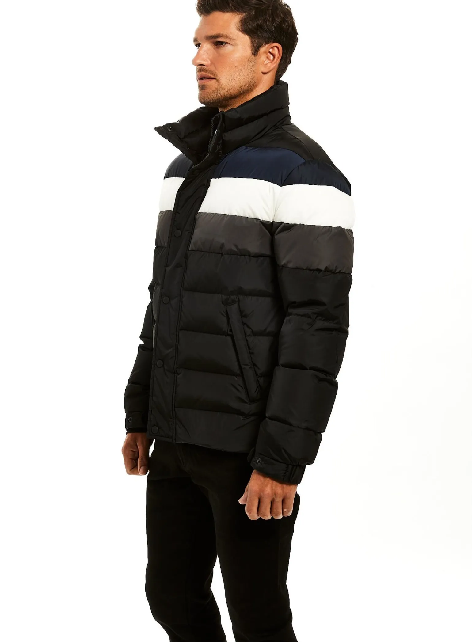 This Quilted, Down Jacket Is Crafted From A Densely Woven Matte Nylon. It Is Lightweight, Wind Resistant, Water Repellent, And Filled With Down. The Tight Quilting Makes The Jacket Perfect For Both Transitional Weather And Year Round Warmth. The Jacket Features A Stand Collar, Center Front Zip Closure With A Snap Placket, Three Horizontal Stripes Across The Chest, Shoulder, And Back, A Stand Collar, And 2 Front Zip Pockets.