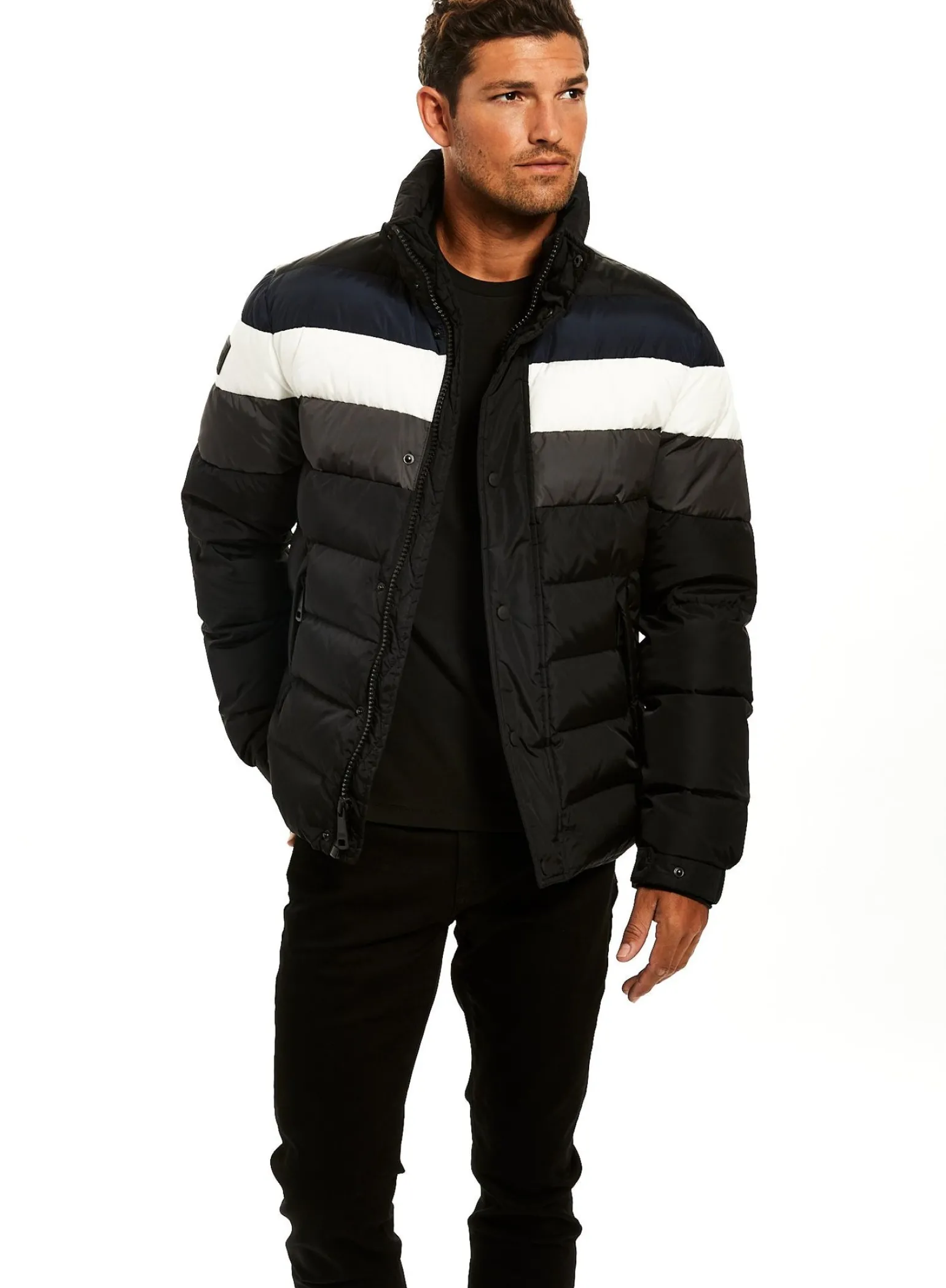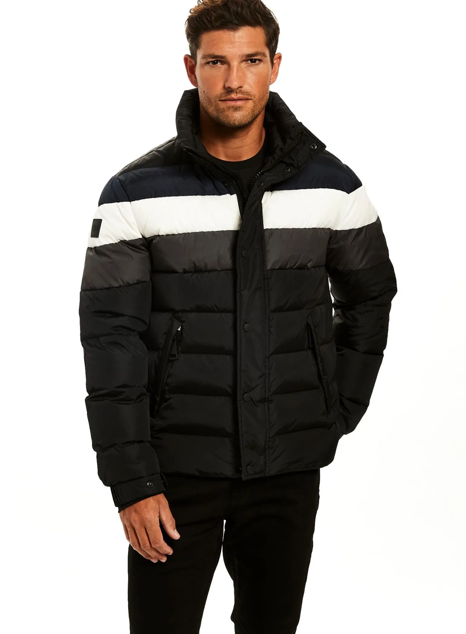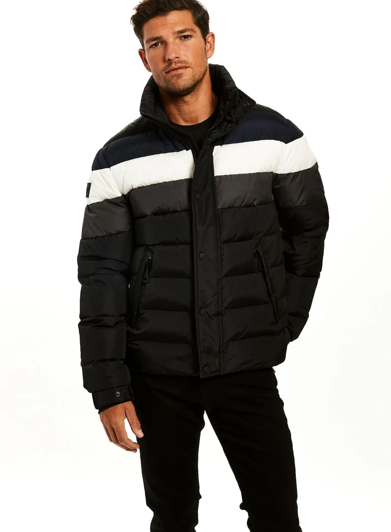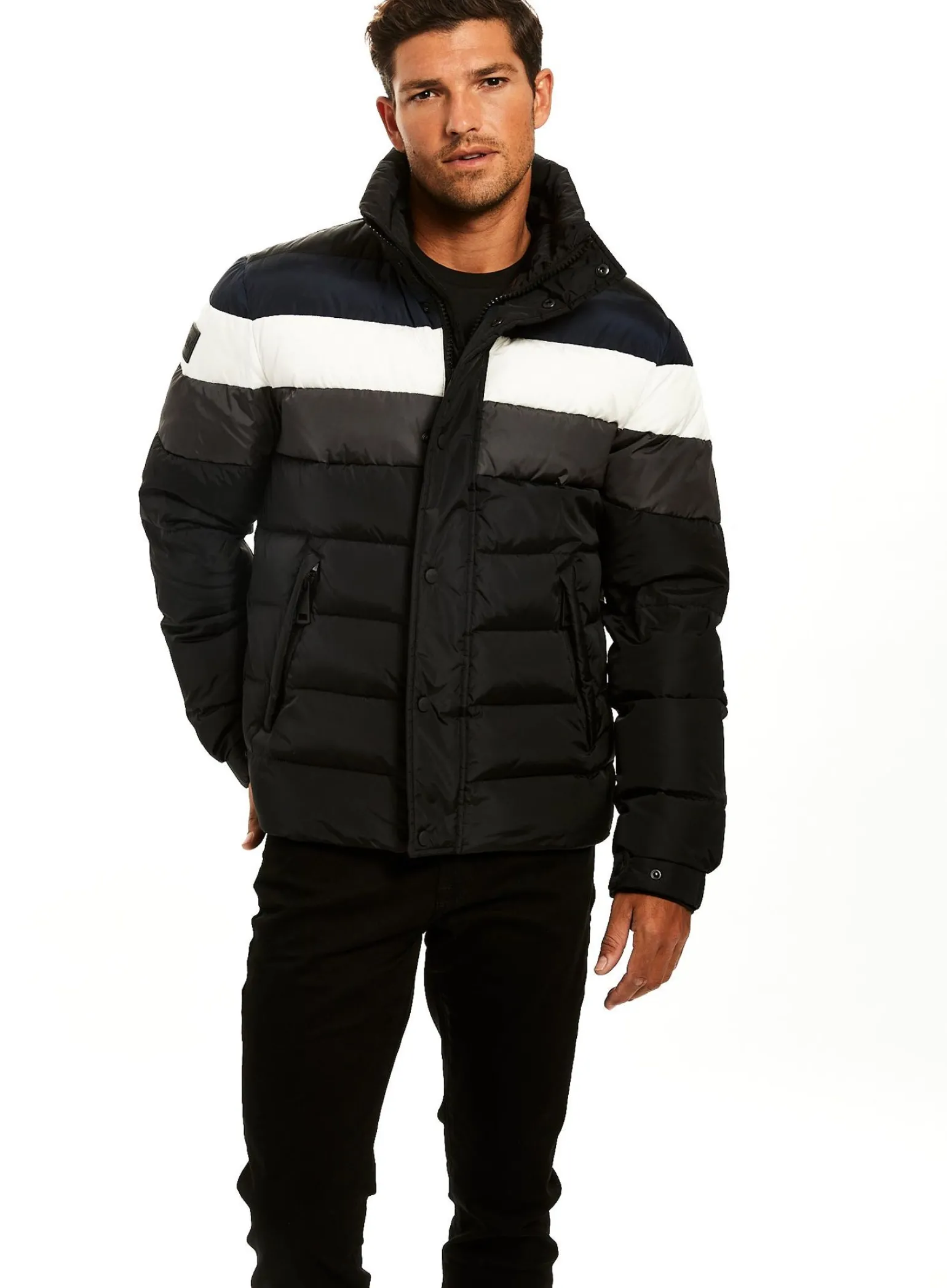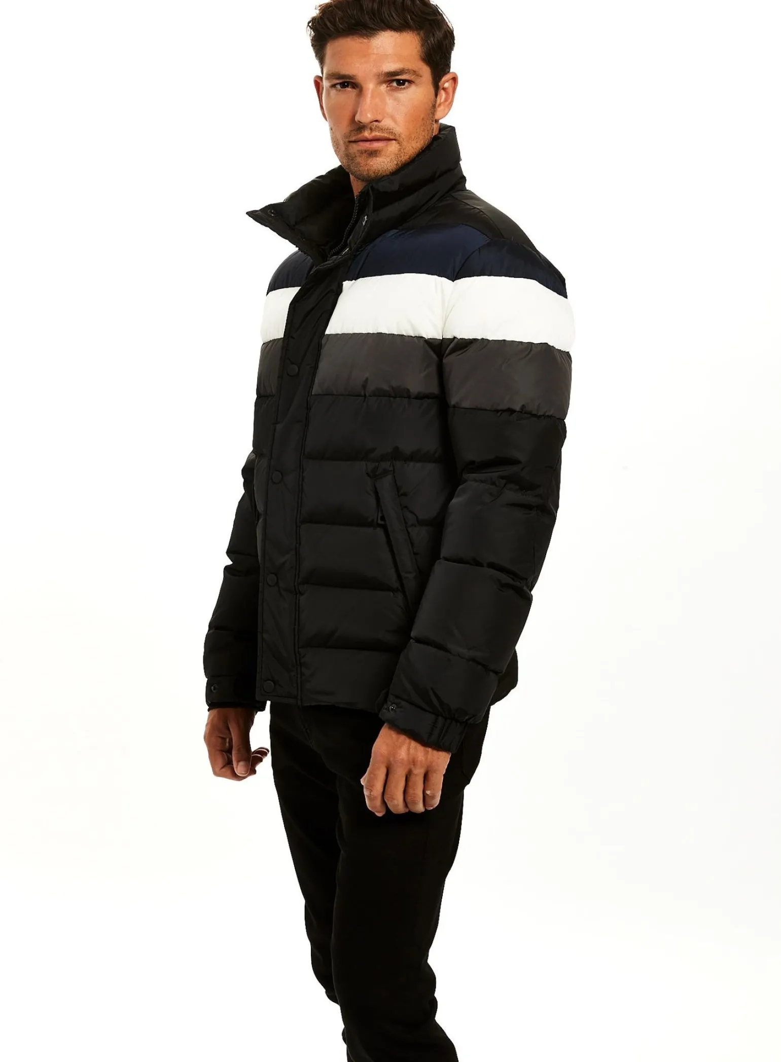 This Quilted, Down Jacket Is Crafted From A Densely Woven Matte Nylon. It Is Lightweight, Wind Resistant, Water Repellent, And Filled With Down. The Tight Quilting Makes The Jacket Perfect For Both Transitional Weather And Year Round Warmth. The Jacket Features A Stand Collar, Center Front Zip Closure With A Snap Placket, Three Horizontal Stripes Across The Chest, Shoulder, And Back, A Stand Collar, And 2 Front Zip Pockets.