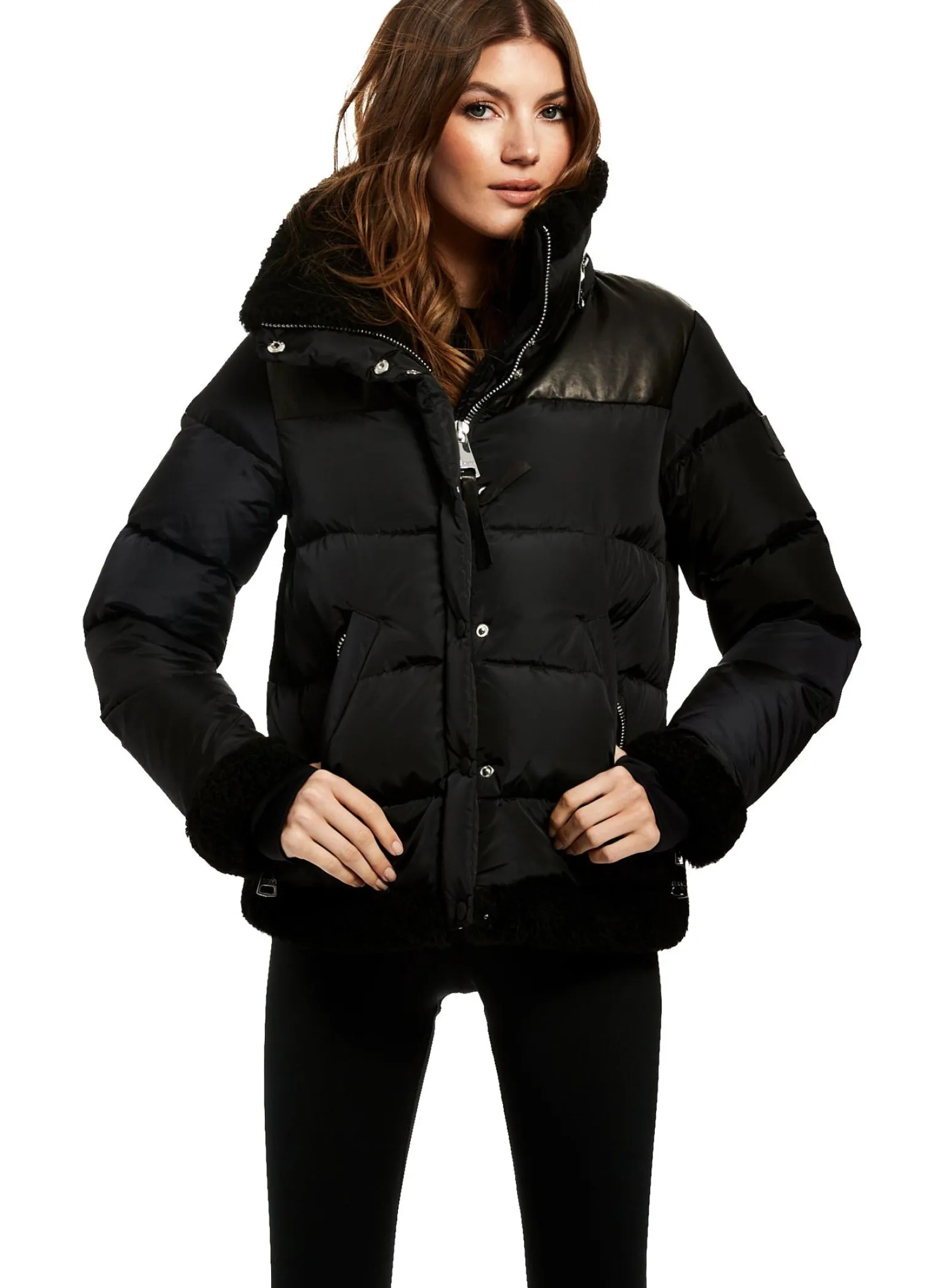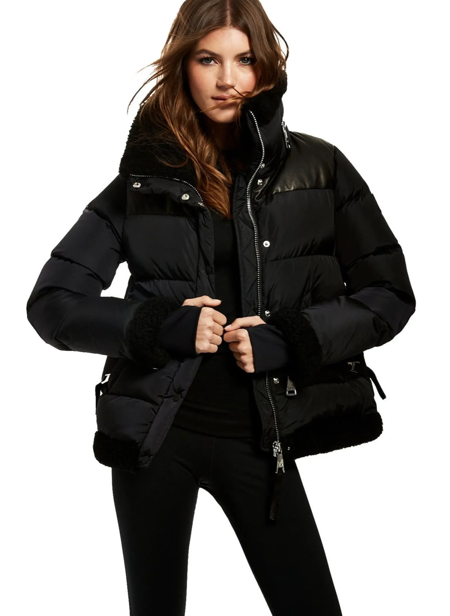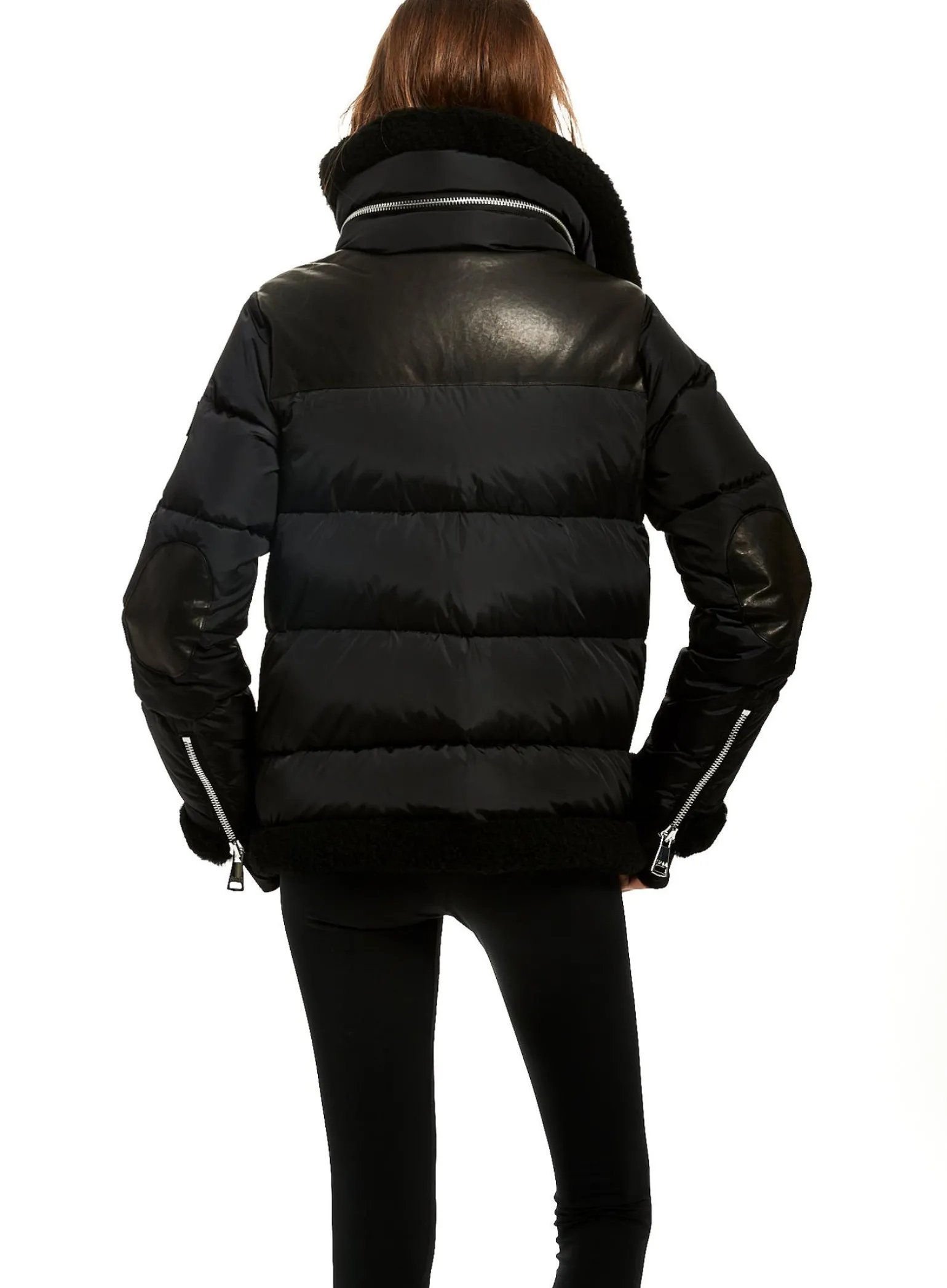 This Quilted Puffer Jacket Is Crafted From A Densely Woven Matte Nylon, And Filled With Down To Achieve Warmth And An Ultra Soft Feel. The Sari Is Wind Resistant, Water Repellent, And Features A Shearling Stand Collar With A Zip That Conceals A Roll-Out Hood, Shearling Trim Waist And Cuffs, A Leather Yoke, Leather Elbow Patches, Zips At The Cuffs, And Spandex Wrist Cuffs With Thumbholes, A Center Front Zip And Snap Placket Closure, And Lower Zip Pockets.