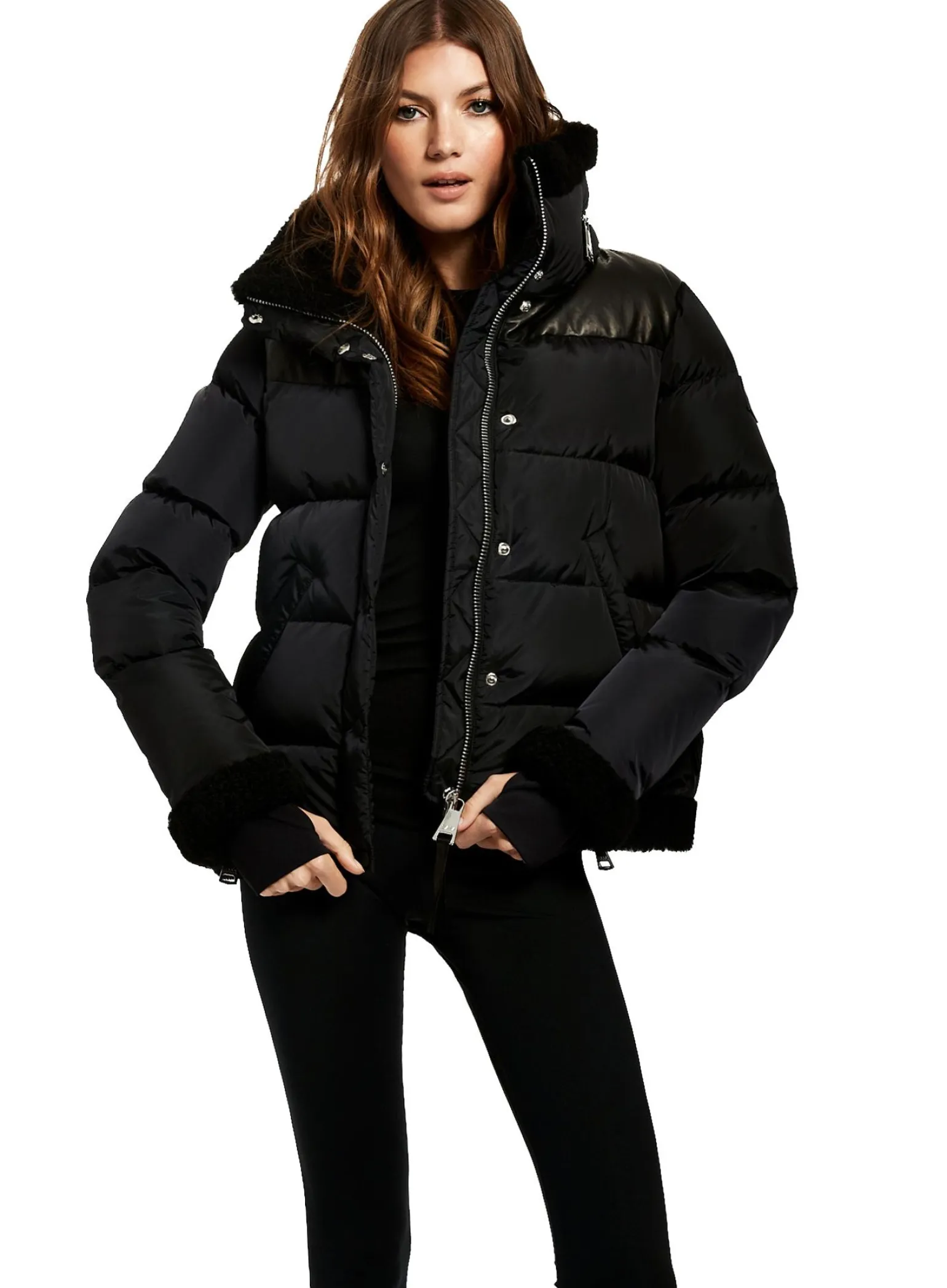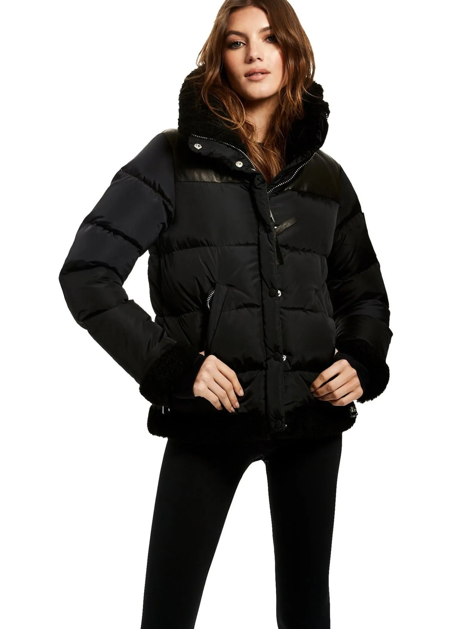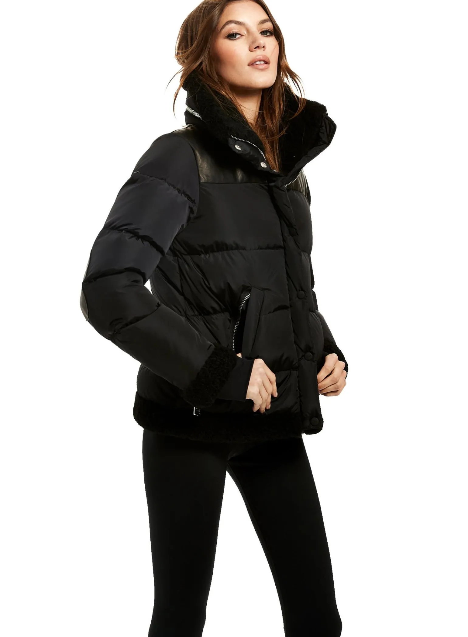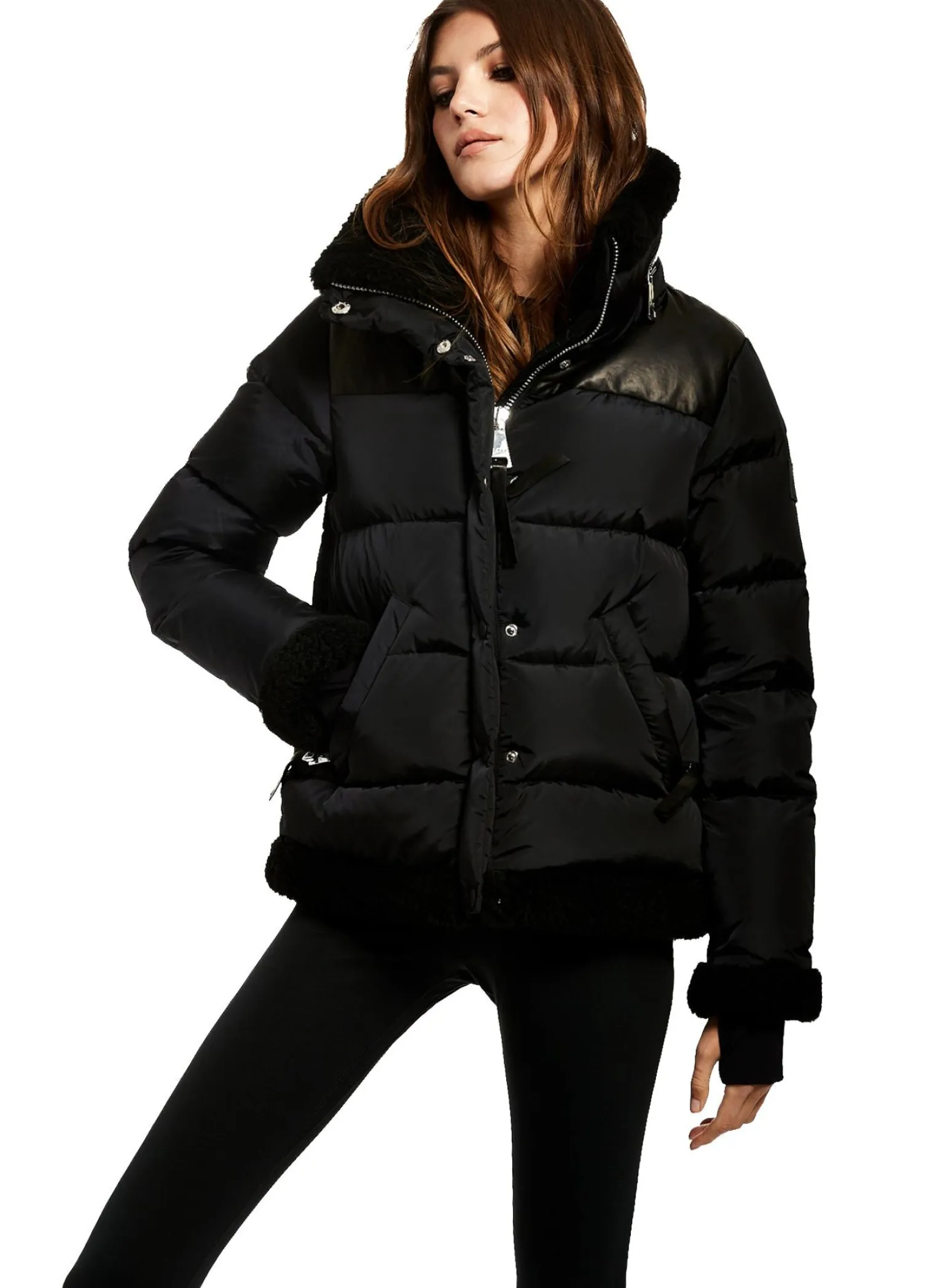 This Quilted Puffer Jacket Is Crafted From A Densely Woven Matte Nylon, And Filled With Down To Achieve Warmth And An Ultra Soft Feel. The Sari Is Wind Resistant, Water Repellent, And Features A Shearling Stand Collar With A Zip That Conceals A Roll-Out Hood, Shearling Trim Waist And Cuffs, A Leather Yoke, Leather Elbow Patches, Zips At The Cuffs, And Spandex Wrist Cuffs With Thumbholes, A Center Front Zip And Snap Placket Closure, And Lower Zip Pockets.