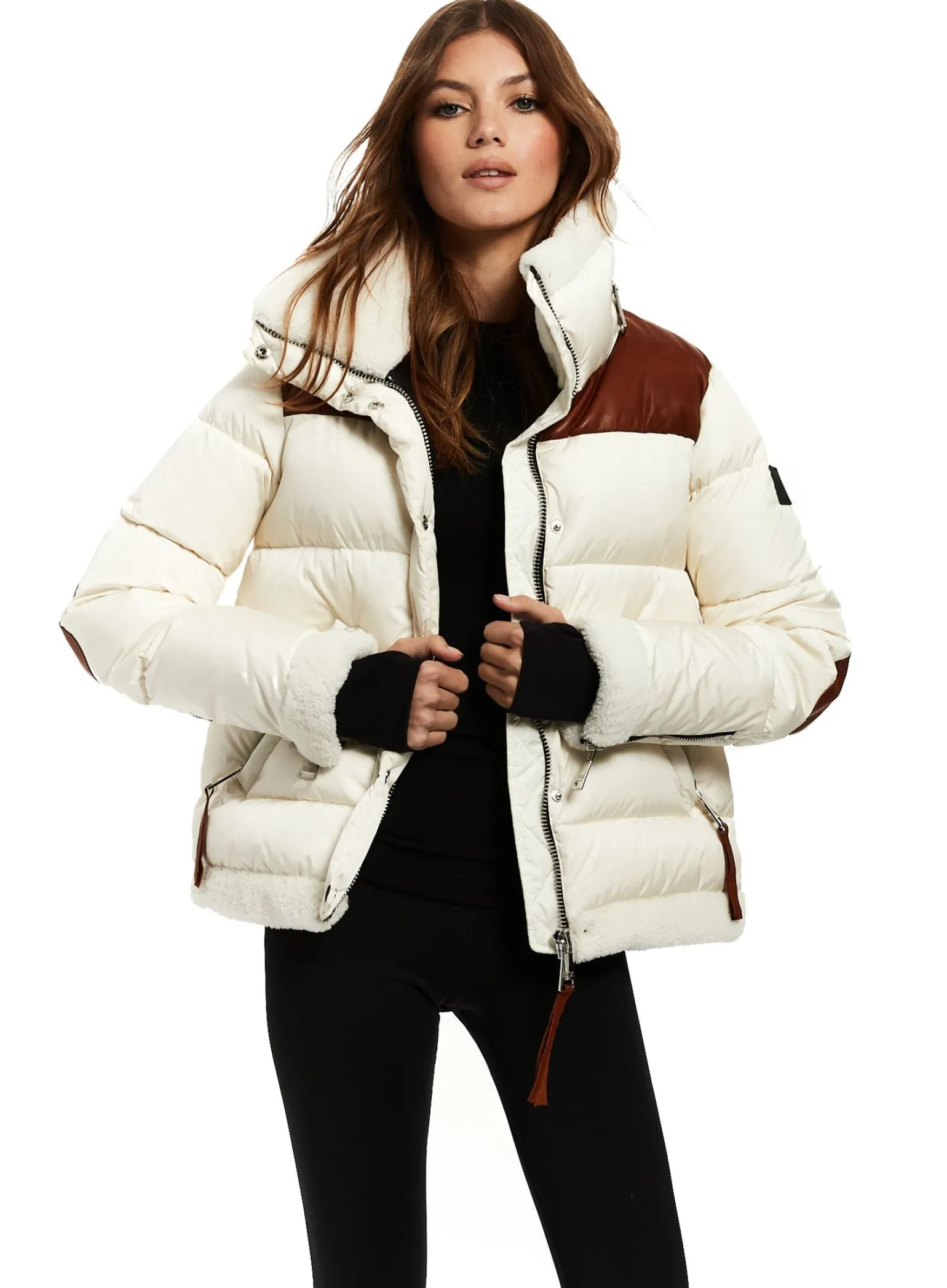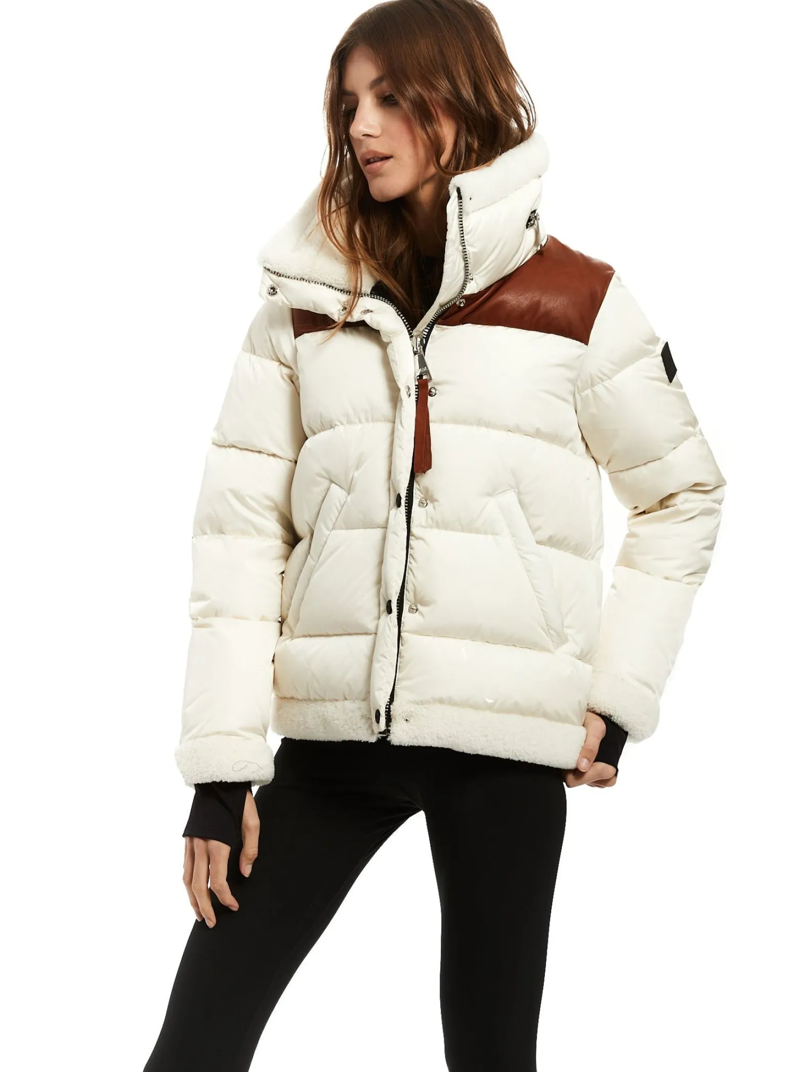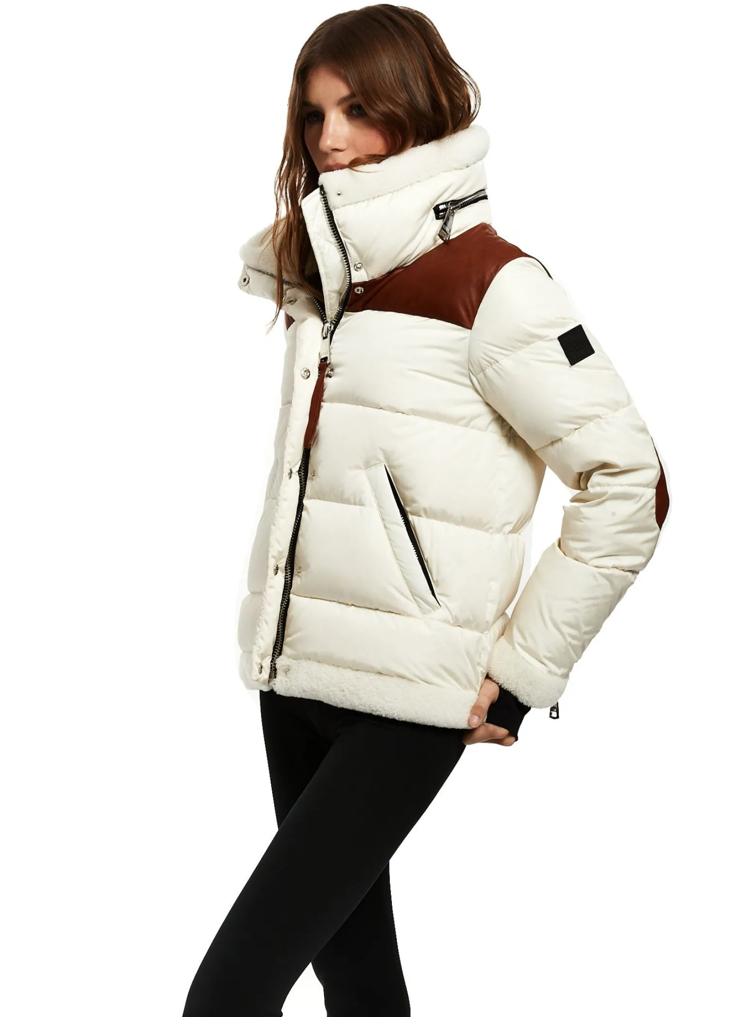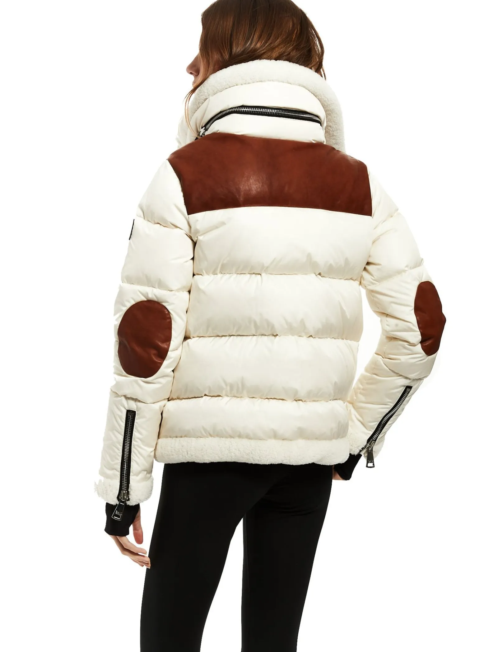 This Quilted Puffer Jacket Is Crafted From A Densely Woven Matte Nylon, And Filled With Down To Achieve Warmth And An Ultra Soft Feel. The Sari Is Wind Resistant, Water Repellent, And Features A Shearling Stand Collar With A Zip That Conceals A Roll-Out Hood, Shearling Trim Waist And Cuffs, A Leather Yoke, Leather Elbow Patches, Zips At The Cuffs, And Spandex Wrist Cuffs With Thumbholes, A Center Front Zip And Snap Placket Closure, And Lower Zip Pockets.