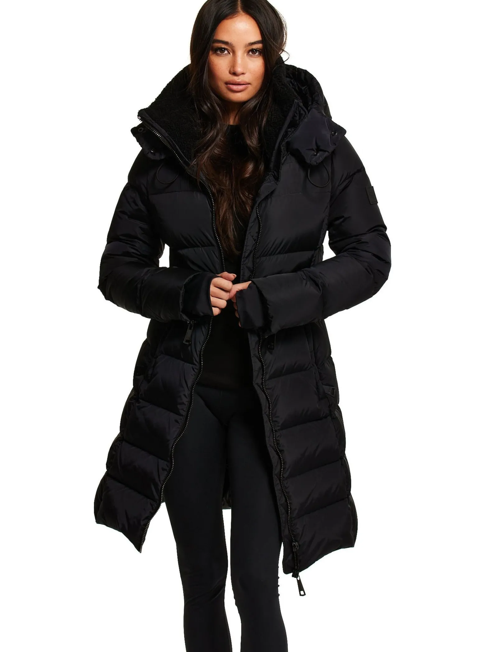 This Super Sleek A-Line Shaped Coat Is Crafted From A Densely Woven Nylon, And Filled With Down To Achieve Warmth And An Ultra Soft Feel. It Hits At The Knee And Is Lightweight, Wind Resistant, And Water Repellent. The Savannah Features Spandex Wrist Cuffs With Thumbholes, A Shearling Collar, Detachable Zip-Off Hood, Zips At The Cuffs, And 2 Lower Zip Pockets.