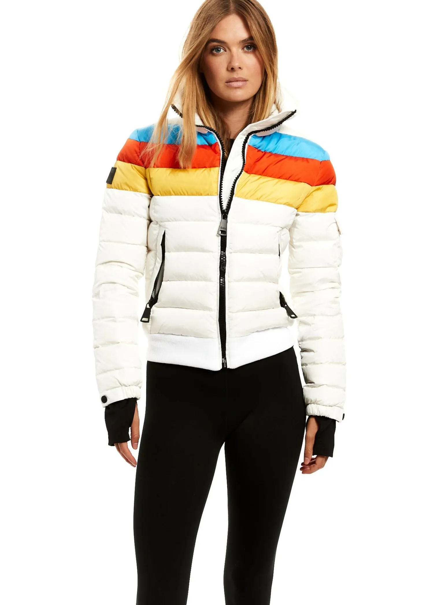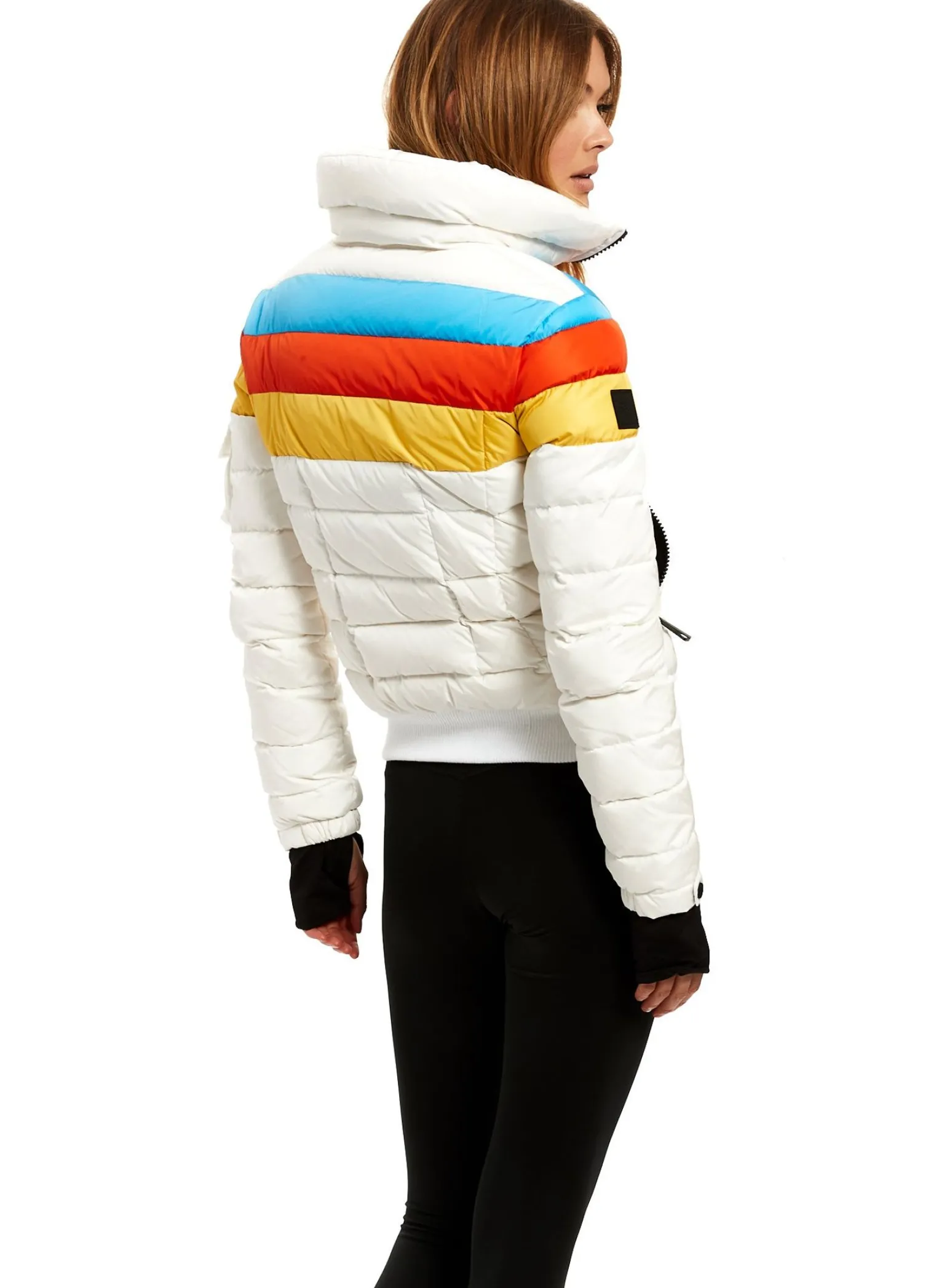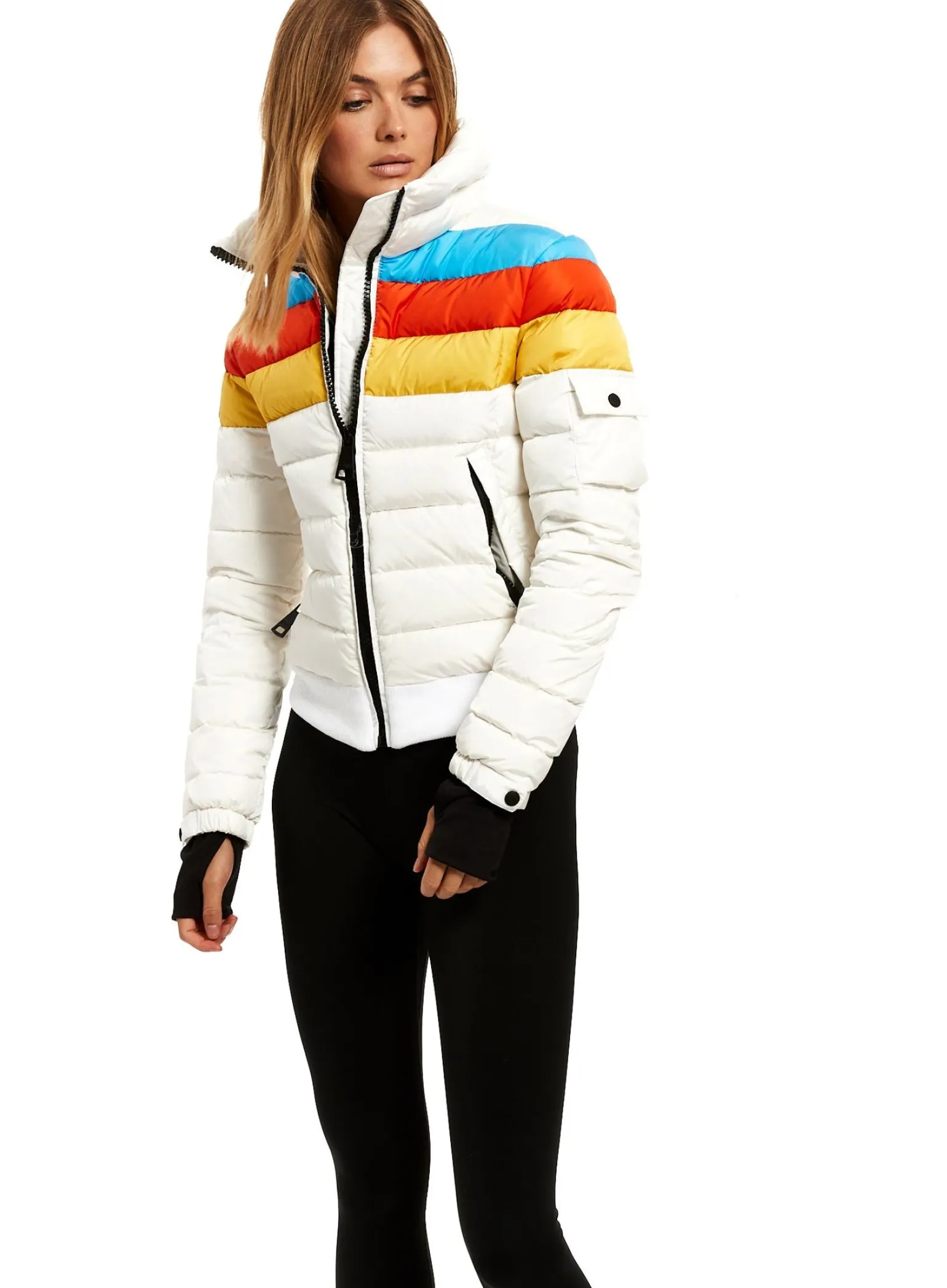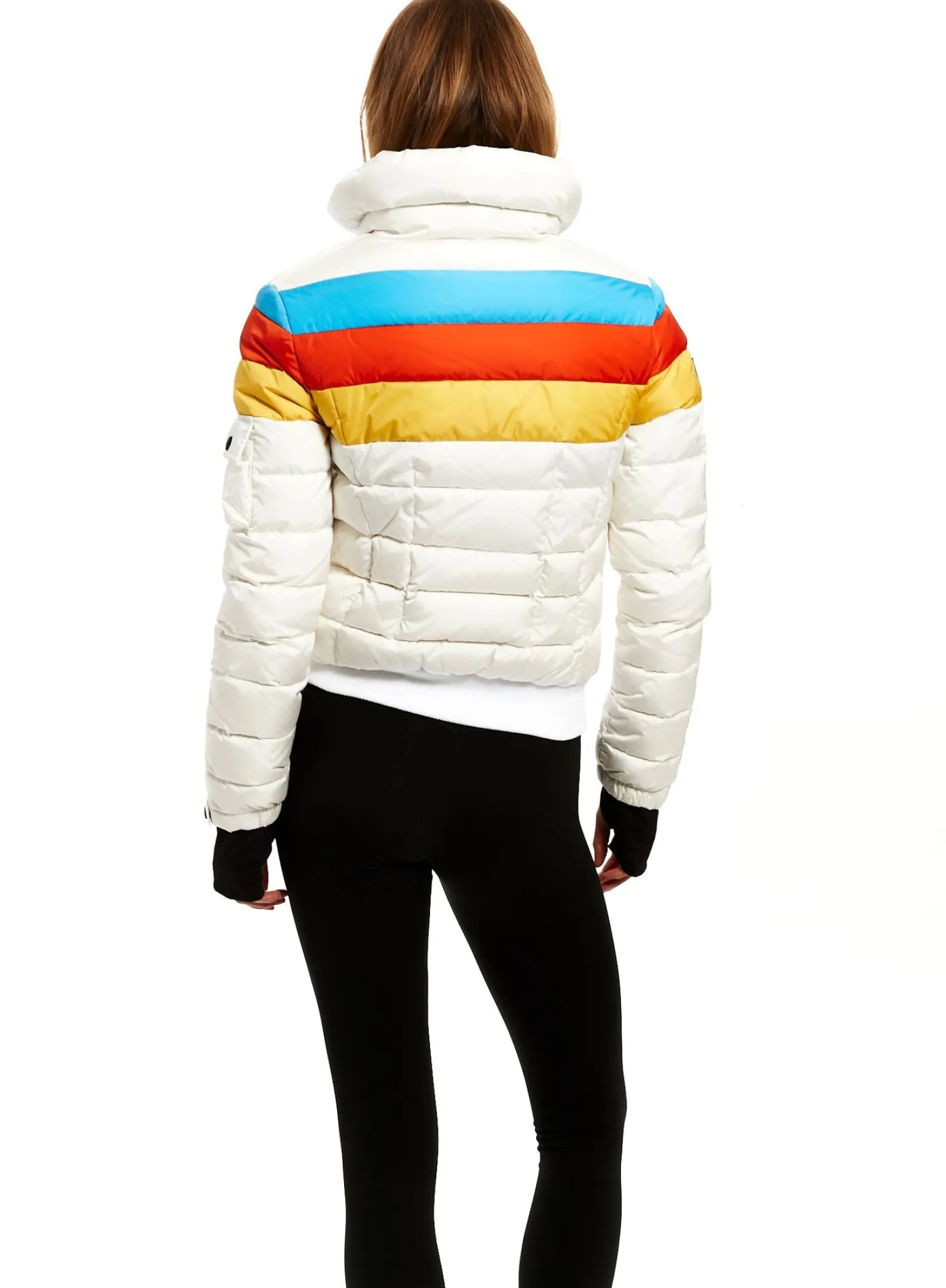 This Quilted, Bomber Style, Puffer Jacket Is Crafted From A Densely Woven Matte Nylon, And Filled With Down To Achieve Warmth And An Ultra Soft Feel. The Starburst Is Lightweight, Wind Resistant, And Water Repellent, Making It Perfect For Year-Round Wear And Function. It Features A Stand Collar, Center Front Zip Closure, 3 Stripes Across The Chest, Arms, And Back, Spandex Thumbhole Cuffs, 2 Lower Zip Pockets, Snap Sleeve And Pocket Detail, And A Knit Waistband.