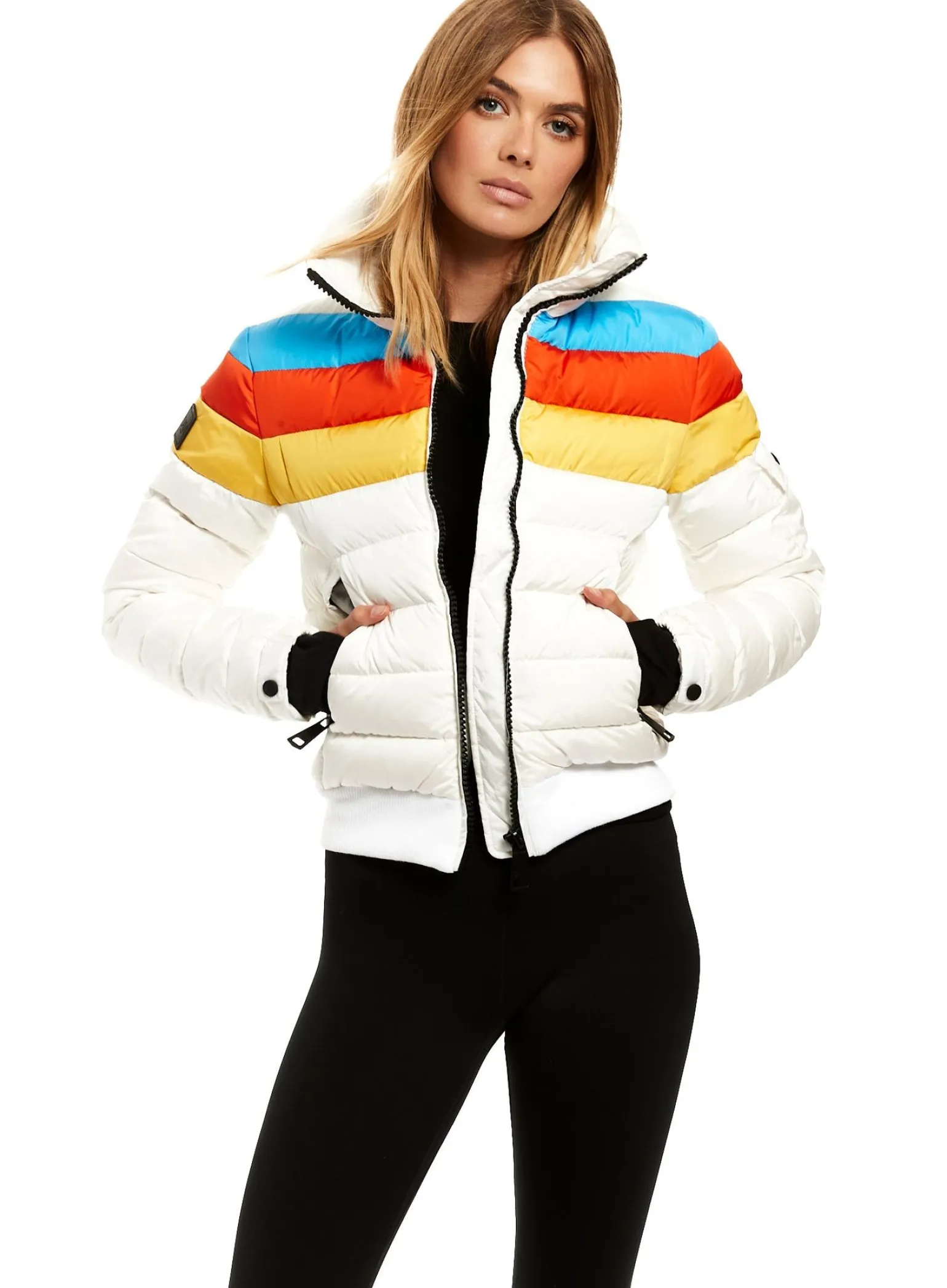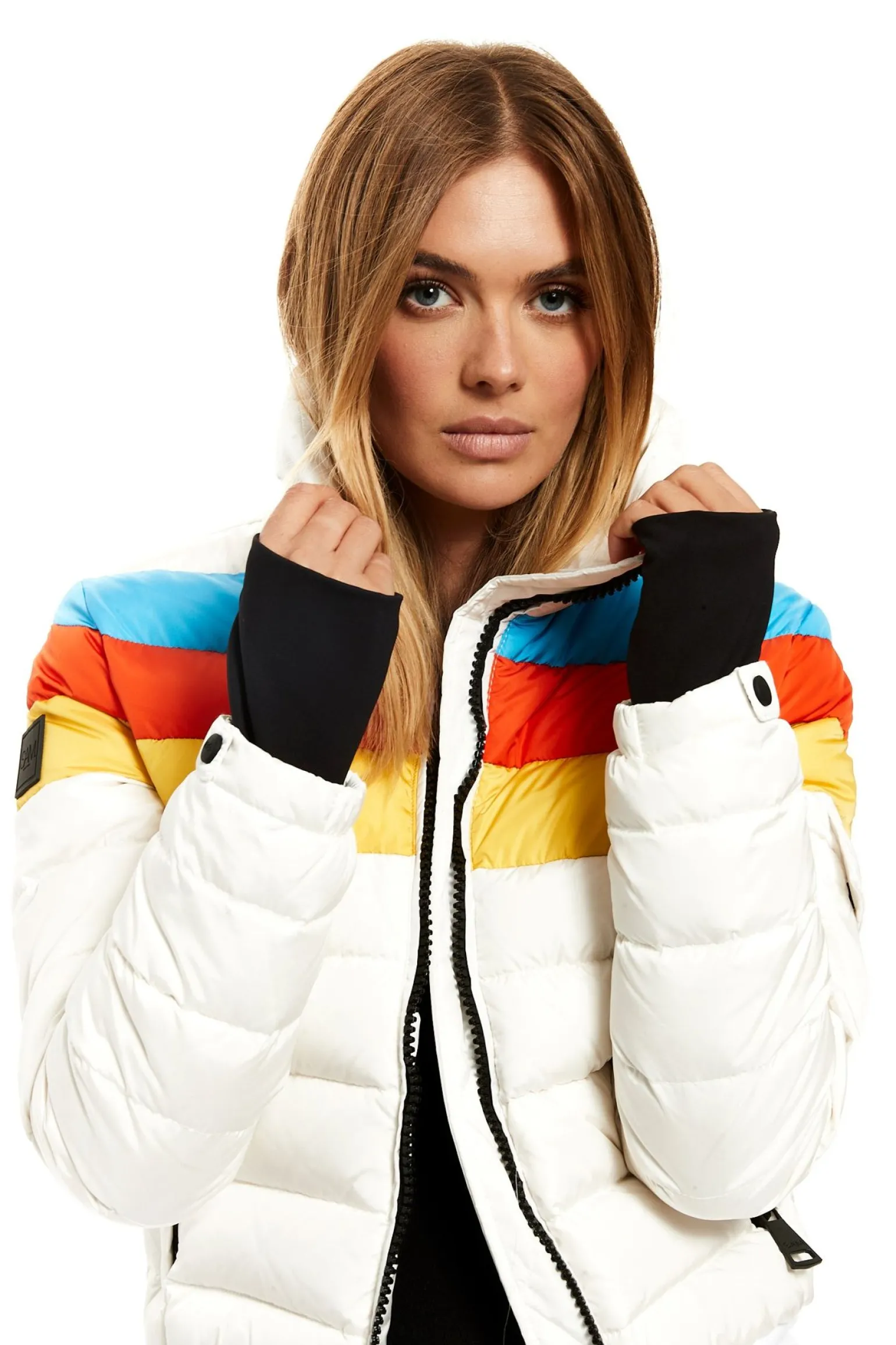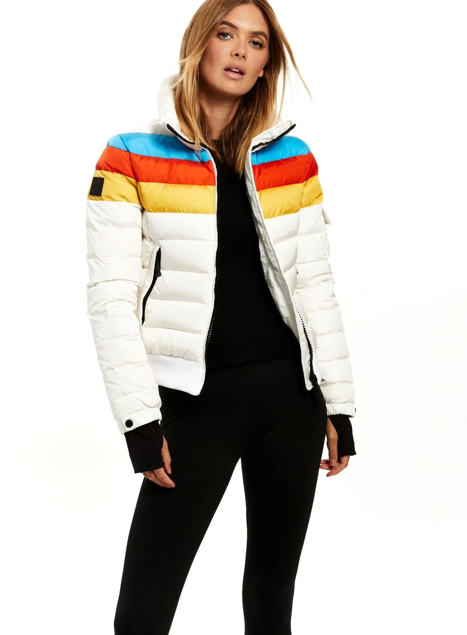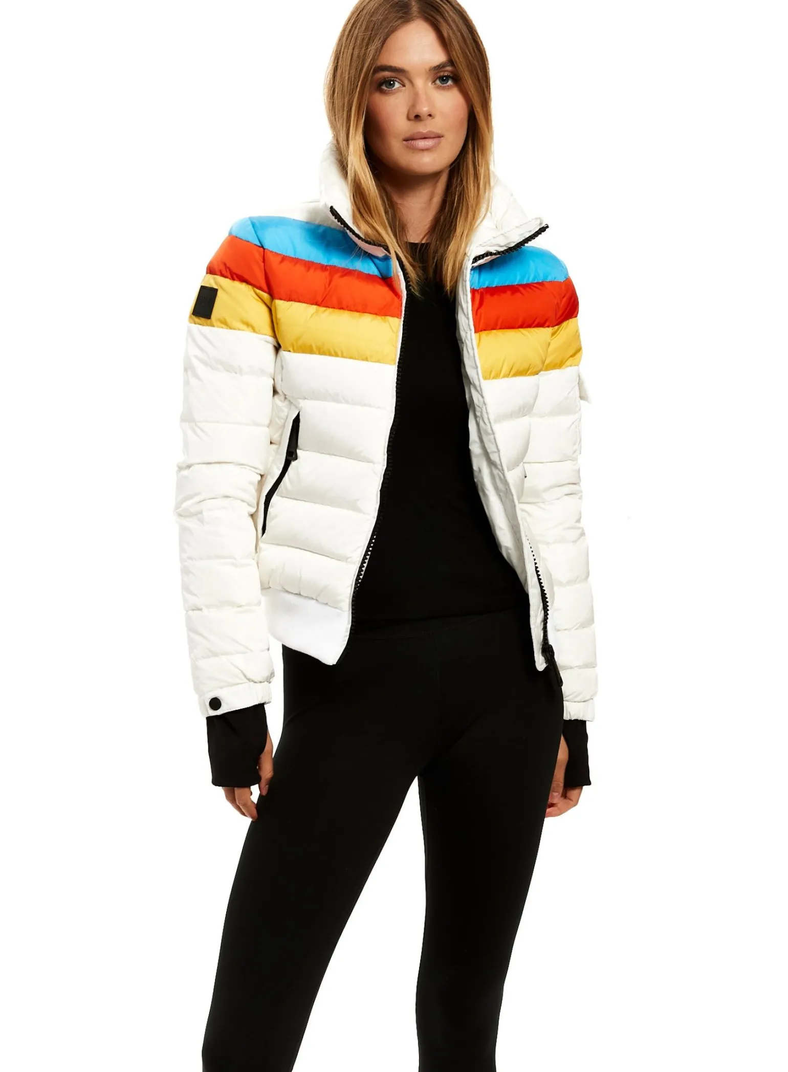 This Quilted, Bomber Style, Puffer Jacket Is Crafted From A Densely Woven Matte Nylon, And Filled With Down To Achieve Warmth And An Ultra Soft Feel. The Starburst Is Lightweight, Wind Resistant, And Water Repellent, Making It Perfect For Year-Round Wear And Function. It Features A Stand Collar, Center Front Zip Closure, 3 Stripes Across The Chest, Arms, And Back, Spandex Thumbhole Cuffs, 2 Lower Zip Pockets, Snap Sleeve And Pocket Detail, And A Knit Waistband.