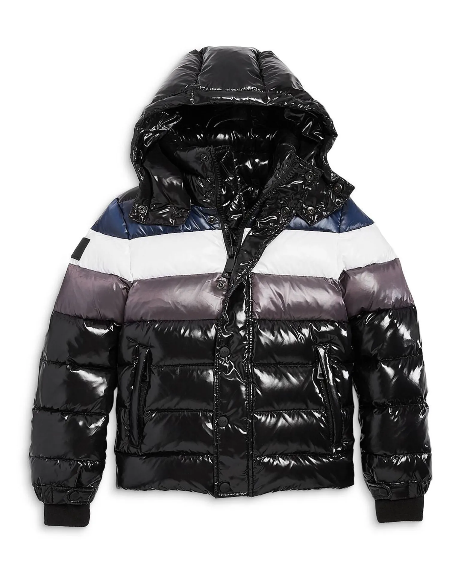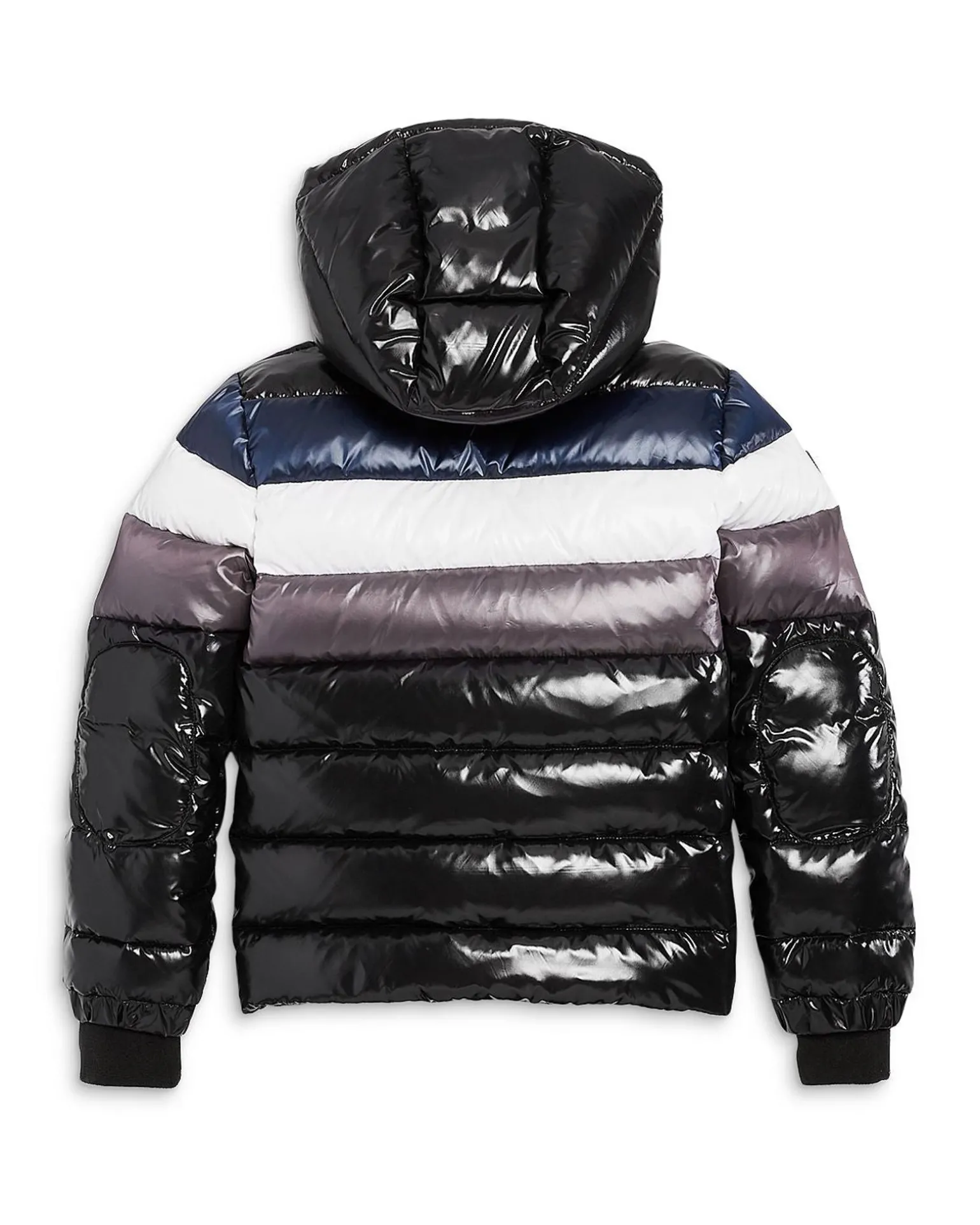 This Lightweight, Quilted, Down Jacket Is Crafted From A Densely Woven Gloss Nylon. The Surface Has Been Treated So That It Is Both Wind-Resistant And Water-Repellent. The Jacket Features 3 Color Stripes Across The Chest, Shoulder, And Back, A Stand Collar, Detachable Hood, Center Front Zip Closure With Snap Placket, 2 Front Zip Pockets, And Microfleece Cuffs.
