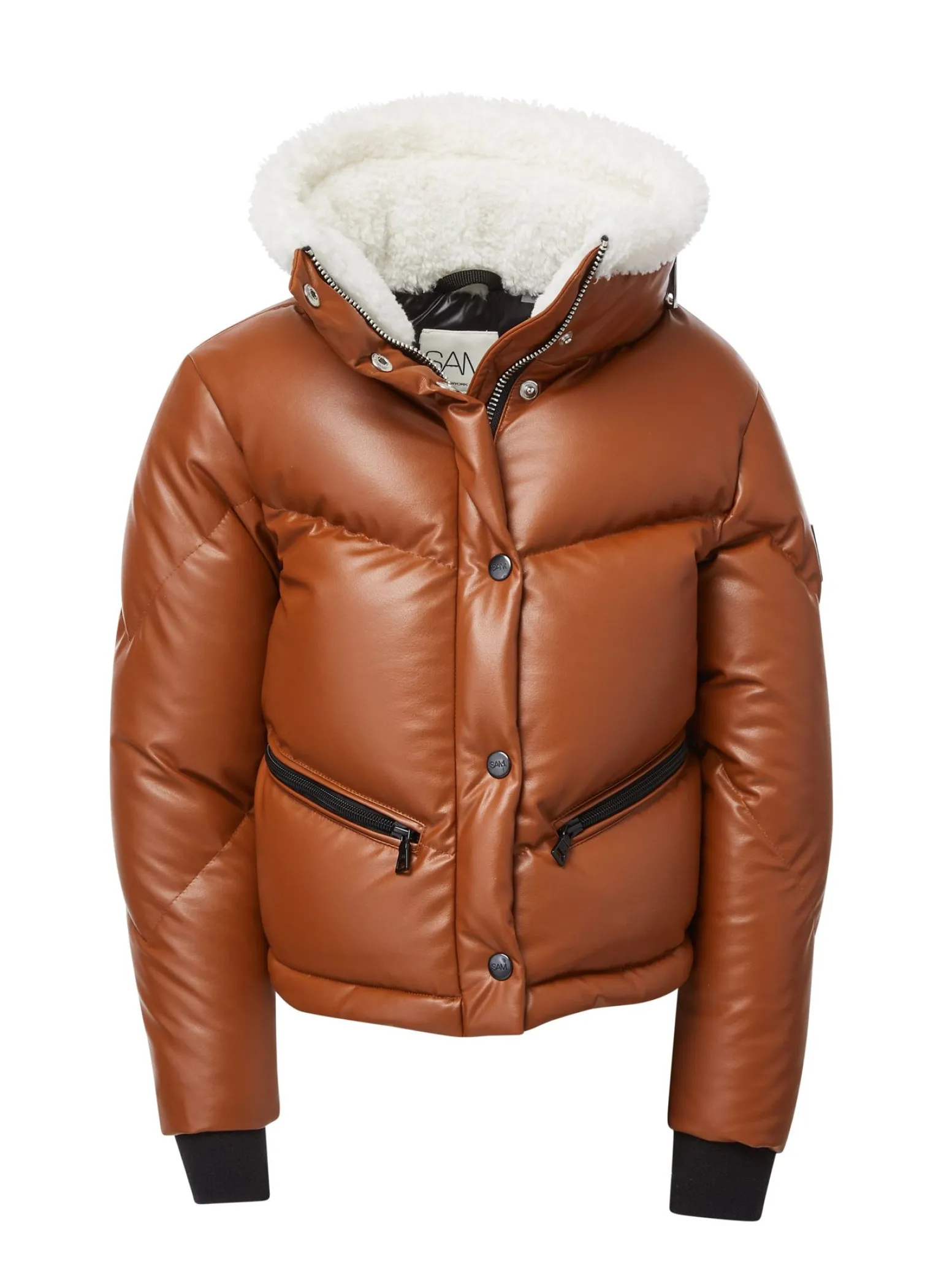 This Quilted, Down Puffer Jacket Is Crafted From A Luxurious Vegan Faux Leather, And Filled With Down To Achieve Warmth And An Ultra Soft Feel. The Vegan Leather Karla Is Lightweight, Wind Resistant, And Water-Repellent. It Features A Stand Collar With A Zipper That Encloses A Roll-Out Hood, A Sherpa (Faux Shearling Collar) Zips At The Cuffs, Spandex Wrist Cuffs With Thumbholes, A Center Front Zip And Snap Placket Closure, And Lower Zip Pockets.